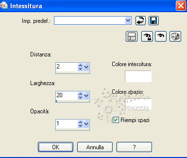 qui puoi trovare qualche risposta ai tuoi dubbi. Se l'argomento che ti interessa non è presente, ti prego di segnalarmelo. Questo tutorial è stato scritto in PSP X2, ma può essere eseguito anche con le altre versioni di PSP. Per tradurlo, l'ho eseguito con PSP X. Occorrente: Un tube a scelta. Il resto del materiale qui Il tube che ho usato è di Sarita. La pagina scrap è di Pam Metti la maschera nella cartella Maschere. Imposta il colore di primo piano con #68757f. 1. Apri pld_jean_meadowromance_qp2. Questa sarà la base del tuo lavoro. 2. Livelli>Nuovo livello raster. Riempi con il colore di primo piano.3. Livelli>Disponi>Sposta giù. 4. Effetti>Effetti di trama>Intessitura. ![]() 5. Attiva il livello superiore (Raster 1). 6. Effetti>Effetti 3D>Sfalsa ombra: ![]() 7. Apri il tuo tube e vai a Modifica>copia. Torna al tuo lavoro e vai a Modifica>Incolla come nuovo livello. il tube al centro dell'ovale. 8. Livelli>Disponi>Sposta giù. 9. Effetti>Effetti 3D>Sfalsa ombra: ![]() Ripeti Effetti>Effetti 3D>sfalsa ombra: ![]() 10. Aggiungi il tuo nome e/o il tuo watermark. 11. Livelli>Unisci>Unisci visibile. 12. Livelli>Carica/Salva maschera>Carica maschera da disco. Cerca e carica la maschera "004". ![]() Livelli>Elimina, e rispondi sì alla domanda Unire la maschera nel livello corrente. ![]() Livelli>Unisci>Unisci gruppo. 13. Livelli>Unisci>Unisci tutto e salva in formato jpg. se vuoi conservare la trasparenza, "Unisci visibile" e salva in formato png.