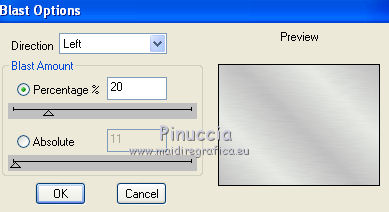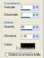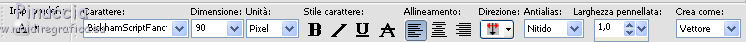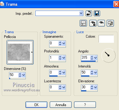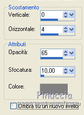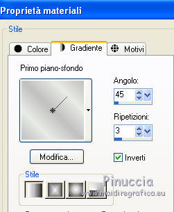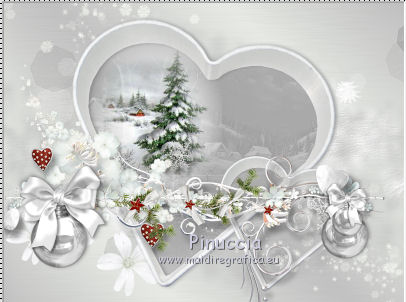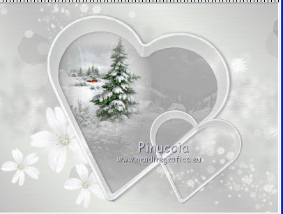 qui puoi trovare qualche risposta ai tuoi dubbi. Se l'argomento che ti interessa non è presente, ti prego di segnalarmelo. Questo tutorial è stato scritto in PSP X2, ma può essere eseguito anche con le altre versioni di PSP. Per tradurlo, l'ho eseguito con PSP X. Occorrente: Materiale qui Filtri: Dsb Flux - Blast qui ![]() Apri il font e minimizzalo. Lo troverai nella lista dei font disponibili quando ti servirà. 1. Imposta il colore di primo piano con #e8ebe6, e il colore di sfondo con #c0c0c0. Passa il colore di primo piano a Gradiente. ![]() 2. Apri una nuova immagine trasparente 800 x 600 pixels, e riempila con il gradiente.3. Effetti>Plugins>Dsb Flux - Blast. ![]() 4. Apri florju_love_inwinter_elements(103) e vai a Modifica>Copia. Torna al tuo lavoro e vai a Modifica>Incolla come nuovo livello. 5. Effetti>Effetti di trama>Trama - seleziona la trama Pelliccia con i seguenti settaggi. ![]() 6. Apri florju_love_inwinter_elements(104) e vai a Modifica>Copia. Torna al tuo lavoro e vai a Modifica>Incolla come nuovo livello. Spostalo in basso a sinistra.7. Apri florju_love_inwinter_elements(60) e vai a Modifica>Copia. Torna al tuo lavoro e vai a Modifica>Incolla come nuovo livello. 8. Apri florju_love_inwinter_elements(129) e vai a Modifica>Copia. Torna al tuo lavoro e vai a Modifica>Incolla come nuovo livello. 9. Effetti>Effetti 3D>Sfalsa ombra. ![]() 10. Livelli>Duplica. 11. Immagine>Ridimensiona, al 50%, tutti i livelli non selezionato. Spostalo un po' più a destra e in basso.12. Attiva il livello Raster 4. 13. Attiva lo strumento Selezione a mano libera , da punto a punto,e traccia una selezione nel cuore più grande, come nell'esempio. ![]() 14. Livelli>Nuovo livello raster. Riempi con il colore di sfondo.15. Selezione>Deseleziona. 16. Apri Winterscenery4 e vai a Modifica>Copia. Torna al tuo lavoro e vai a Modifica>Incolla come nuovo livello. 17. Cancella la parte di tube visibile all'esterno del cuore.18. Abbassa l'opacità di questo livello al 21%. 19. Apri arbolNavidad e vai a Modifica>Copia. Torna al tuo lavoro e vai a Modifica>Incolla come nuovo livello. Spostalo nel cuore, a sinistra.![]() 20. Attiva il livello copia di Raster 5. 21. Apri florju_love_inwinter_elements(5) e vai a Modifica>Copia. Torna al tuo lavoro e vai a Modifica>Incolla come nuovo livello. Spostalo un po' più in basso.22. Apri florju_love_inwinter_elements(121) e vai a Modifica>Copia. Torna al tuo lavoro e vai a Modifica>Incolla come nuovo livello. Sposta anche questo tube un po' più in basso.23. Apri christmas_bal1 e vai a Modifica>Copia. Torna al tuo lavoro e vai a Modifica>Incolla come nuovo livello. Sposta il tube a sinistra.24. Effetti>Effetti 3D>Sfalsa ombra, con i settaggi precedenti. 25. Apri christmas_bal2 e vai a Modifica>Copia. Torna al tuo lavoro e vai a Modifica>Incolla come nuovo livello. Sposta questo tube a destra.![]() 26. Effetti>Effetti 3D>Sfalsa ombra, con i settaggi precedenti. 27. Livelli>Unisci>Unisci tutto. 28. Immagine>Aggiungi bordatura, 1 pixel, simmetriche, con il colore bianco. 29. Immagine>Aggiungi bordatura, 20 pixels, simmetriche, con il colore nero. 30. Attiva lo strumento Bacchetta magica ![]() e clicca sul bordo nero per selezionarlo. Riempi il bordo con il colore di primo piano(per il mio esempio ho preferito riempire con il gradiente). 31. Selezione>Inverti. 32. Effetti>Effetti 3D>Sfalsa ombra, con i settaggi precedenti. Ripeti l'Effetto Sfalsa ombra cambiando Orizzontale con -4. 33. Selezione>Deseleziona. 34. Immagine>Aggiungi bordatura, 60 pixels, simmetriche, con il colore nero. 35. Seleziona questo bordo con la bacchetta magica ![]() e riempilo con il gradiente.36. Effetti>Effetti di trama>Trama, con i settaggi precedenti. ![]() 37. Selezione>Deseleziona. 38. Apri element4 e vai a Modifica>Copia. Torna al tuo lavoro e vai a Modifica>Incolla come nuovo livello. Spostalo nell'angolo in basso a destra.39. Apri florju_love_inwinter_elements(62) e vai a Modifica>Copia. Torna al tuo lavoro e vai a Modifica>Incolla come nuovo livello. Spostalo in basso.40. Chiudi il colore di primo piano e imposta il colore di sfondo con il bianco. 41. Attiva lo strumento Testo , font BickhamScriptFancy2:![]() Scrivi il tuo testo e posizionalo. 42. Livelli>Converti in livello raster. 43. Effetti>Effetti 3D>Sfalsa ombra. ![]() 29. Aggiungi il tuo nome e/o il tuo watermark. 30. Livelli>Unisci>Unisci tutto e salva in formato jpg.