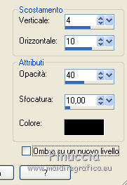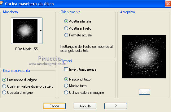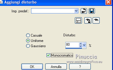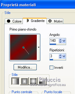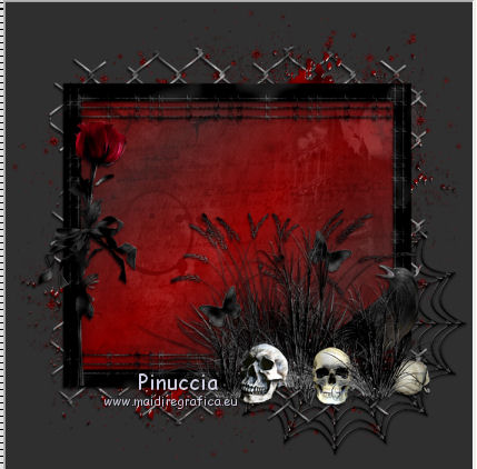 qui puoi trovare qualche risposta ai tuoi dubbi. Se l'argomento che ti interessa non è presente, ti prego di segnalarmelo. Questo tutorial è stato scritto in PSP X4, ma può essere eseguito anche con le altre versioni di PSP. Per tradurlo, l'ho eseguito con PSP X. Occorrente: Tube a scelta. Free Cluster "Love kills" http://pinkparadoxproductions.blogspot.be/search/label/Cluster%20Frame qui Free Cluster "Dark Love" http://mariekespsp.blogspot.be/2013_09_01_archive.html qui Masker 155 di Vabys http://designsbyvaybs.blogspot.be/search/label/Masks qui Il resto del materiale qui Il tube che ho usato è di Libellule. Metti la maschera nella cartella Maschere. 1. Imposta il colore di primo piano con #870000, e il colore di sfondo con #303030. Apri una nuova immagine trasparente 700 x 700 pixels, e riempila con il colore di sfondo.2. Livelli>Nuovo livello raster. Riempi con il colore di primo piano.3. Livelli>Carica/Salva maschera>Carica maschera da disco. Cerca e carica la maschera DBV Mask155. ![]() Livelli>Elimina e rispondi sì alla domanda unire la maschera nel livello corrente. ![]() Livelli>Unisci>Unisci gruppo. 4. Regola>Aggiungi/Rimuovi disturbo>Aggiungi disturbo. ![]() Cambia la modalità di miscelatura di questo livello in Luce netta. 5. Apri spiderweb e vai a Modifica>Copia. Torna al tuo lavoro e vai a Modifica>Incolla come nuovo livello. Sposta l'elemento in basso a destra.6. Apri clusterframe_darklove, e vai a Modifica>Copia. Torna al tuo lavoro e vai a Modifica>Incolla come nuovo livello. 7. Passa il colore di primo piano a Gradiente. ![]() 8. Attiva lo strumento Selezione , rettangolo,e traccia una selezione sul bordo della cornice. 9. Livelli>Nuovo livello raster. Riempi con il gradiente.Selezione>Deseleziona. Livelli>Disponi>Sposta giù. 10. Apri Haerts-back, e vai a Modifica>Copia. Torna al tuo lavoro e vai a Modifica>Incolla come nuovo livello. Abbassa l'opacità di questo livello al 34%. 11. Apri AH_Turm_01_07, e vai a Modifica>Copia. Torna al tuo lavoro e vai a Modifica>Incolla come nuovo livello. Sposta nella cornice in alto a destra.Abbassa l'opacità di questo livello al 18%. ![]() 12. Attiva il livello superiore. Apri il tuo tube e vai a Modifica>Copia. Torna al tuo lavoro e vai a Modifica>Incolla come nuovo livello. Immagine>Ridimensiona, se e quanto necessario, tutti i livelli non selezionato. Spostalo a sinistra.13. Effetti>Effetti 3D>Sfalsa ombra, con il colore nero. ![]() 14. Apri Love Kills cluster. Attiva lo strumento Gomma ![]() e cancella il testo e la parte superiore della cornice. Immagine>Rifletti. Immagine>Ridimensiona, al 75%, tutti i livelli non selezionato. Modifica>Copia. Torna al tuo lavoro e vai a Modifica>Incolla come nuovo livello. Sposta la cornice in basso a sinistra.15. Apri strik, e vai a Modifica>Copia. Torna al tuo lavoro e vai a Modifica>Incolla come nuovo livello. Sposta il nastro in basso a sinistra.16. Apri wordart_creepy_weird_nights_Vika, e vai a Modifica>Copia. Torna al tuo lavoro e vai a Modifica>Incolla come nuovo livello. Posiziona il wordart come preferisci,o vedi il mio esempio. 17. Aggiungi il tuo nome e/o il tuo watermark su un nuovo livello. 18. Livelli>Unisci>Unisci tutto e salva in formato jpg. ![]() Se hai problemi o dubbi, o trovi un link non funzionante, o anche soltanto per un saluto, scrivimi.