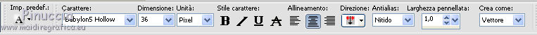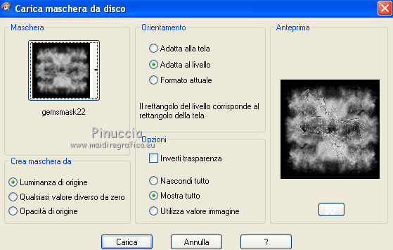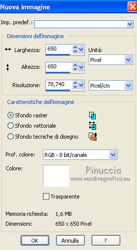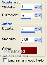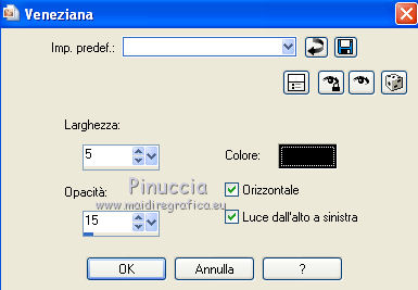 qui puoi trovare qualche risposta ai tuoi dubbi. Se l'argomento che ti interessa non è presente, ti prego di segnalarmelo. Questo tutorial è stato scritto in PSP X2, ma può essere eseguito anche con le altre versioni di PSP. Per tradurlo, l'ho eseguito con PSP X. Occorrente: Un tube a scelta. Il resto del materiale qui Apri il font e minimizzalo. Lo troverai nella lista dei font disponibili quando ti servirà. Metti la maschera nella cartella Maschere, Metti il pennello nella cartella Pennelli, e apri il resto del materiale in PSP. Imposta il colore di primo piano con #7a0000, e il colore di sfondo con il nero. 1. Apri una nuova immagine bianca 650 x 650 pixels. ![]() 2. Livelli>Nuovo livello raster. Riempi con il colore di sfondo (tasto destro del mouse).3. Livelli>Carica/Salva maschera>Carica maschera da disco. Cerca e carica la maschera gemmask22. ![]() Livelli>Elimina, e rispondi sì alla domanda Unire la maschera nel livello corrente. ![]() Livelli>Unisci>Unisci gruppo. 4. Abbassa l'opacità di questo livello al 50%. 5. Apri frame_Dark_angel_Vika e vai a Modifica>copia. Torna al tuo lavoro e vai a Modifica>Incolla come nuovo livello. 6. Apri il tuo tube del viso e vai a Modifica>Copia. Torna al tuo lavoro e vai a Modifica>Incolla come nuovo livello. 7. Livelli>Disponi>Sposta giù. 8. Effetti>Effetti di trama>Veneziana. ![]() 9. Livelli>Nuovo livello raster. 10. Attiva lo strumento Selezione , rettangolo,e seleziona la cornice. 11. Riempi la selezione con il colore nero.12. Abbassa l'opacità di questo livello al 50%. 13. Selezione>Deseleziona. 14. Attiva il livello Raster 1. 15. Apri diamantenlijntje e vai a Modifica>Copia. Torna al tuo lavoro e vai a Modifica>Incolla come nuovo livello. Sposta la linea di diamanti in basso sulla cornice.16. Apri curtain e vai a Modifica>Copia. Torna al tuo lavoro e vai a Modifica>Incolla come nuovo livello. 17. Apri candles e vai a Modifica>Copia. Torna al tuo lavoro e vai a Modifica>Incolla come nuovo livello. Sposta il tube a sinistra.18. Apri il tuo tube e vai a Modifica>Copia. Torna al tuo lavoro e vai a Modifica>Incolla come nuovo livello. Spostalo a sinistra.19. Apri tutti gli altri tubes forniti, copiali e incollali come nuovo livello, e disponili a tuo piacimento.20. Attiva il livello di sfondo. 21. Attiva lo strumento pennello ![]() cerca e seleziona il pennello grung_3 e applicalo con il colore di primo piano a sinistra e nell'angolo in basso a destra. 22. Livelli>Unisci>Unisci tutto. 23. Attiva lo strumento Testo ![]() Chiudi il colore di primo piano e seleziona il font Babylon5Hollow. ![]() Scrivi il tuo testo e posizionalo. 24. Livelli>Converti in livello raster. 25. Effetti>Effetti 3D>Sfalsa ombra, con il colore rosso. ![]() 26. Aggiungi il tuo nome e/o il tuo watermark. 27. Livelli>Unisci>Unisci tutto e salva in formato jpg. ![]()