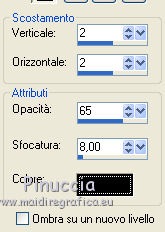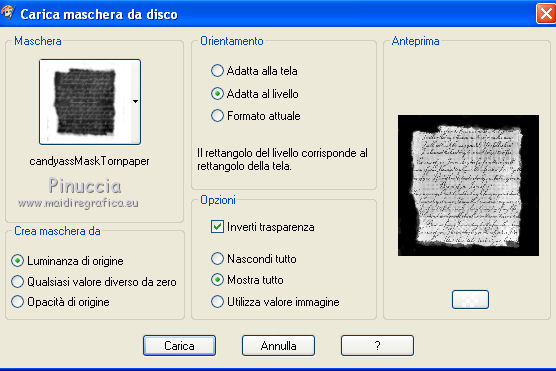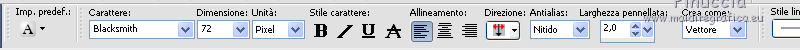 qui puoi trovare qualche risposta ai tuoi dubbi. Se l'argomento che ti interessa non è presente, ti prego di segnalarmelo. Questo tutorial è stato scritto in PSP X2, ma può essere eseguito anche con le altre versioni di PSP. Per tradurlo, l'ho eseguito con PSP X. Occorrente: Un tube a scelta. Il resto del materiale qui Il tube usato è di Sharlimar. Apri il font e minimizzalo. Lo troverai nella lista dei font disponibili quando ti servirà. Metti la maschera nella cartella Maschere, e apri il resto del materiale in PSP. Imposta il colore di primo piano con #c9c9c9, e il colore di sfondo con il bianco. 1. Apri una nuova immagine bianca 600x600 pixels. ![]() 2. Livelli>Nuovo livello raster. Riempi con il colore di primo piano.3. Livelli>Carica/Salva maschera>Carica maschera da disco. Cerca e carica la maschera candyassMaskTornpaper. ![]() Livelli>Elimina, e rispondi sì alla domanda Unire la maschera nel livello corrente. ![]() Livelli>Unisci>Unisci gruppo. 4. Apri dazzling_element, e vai a Modifica>copia. Torna al tuo lavoro e vai a Modifica>Incolla come nuovo livello. 5. Apri il tuo tube e vai a Modifica>copia. Torna al tuo lavoro e vai a Modifica>Incolla come nuovo livello. Spostalo a sinistra.6. Effetti>Effetti 3D>Sfalsa ombra. ![]() 7. Apri L&P FlowerStringByTwinky, e vai a Modifica>Copia. Torna al tuo lavoro e vai a Modifica>Incolla come nuovo livello. Sposta il tube in basso.8. Attiva lo strumento Testo ![]() e seleziona il font Blacksmith con i seguenti settaggi. ![]() Scrivi "Dazzling" o quello che preferisci. Livelli>Converti in livello raster. 21. Effetti>Effetti 3D>Sfalsa ombra, con il colore nero. ![]() 22. Aggiungi il tuo nome e/o il tuo watermark. 23. Livelli>Unisci>Unisci tutto e salva in formato jpg.