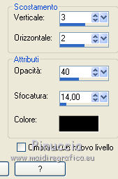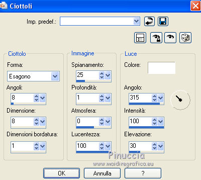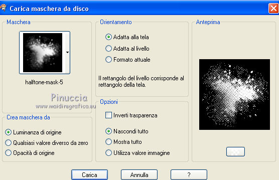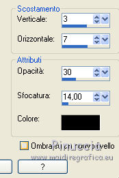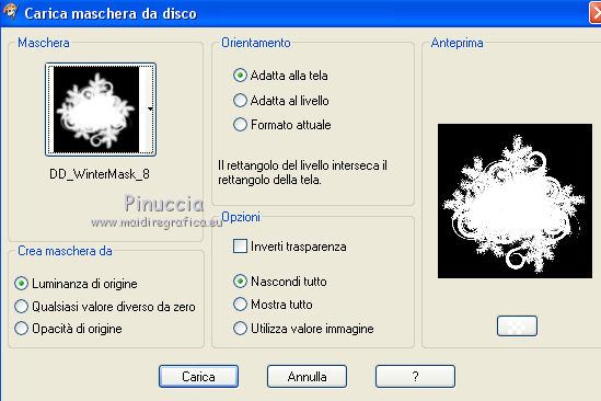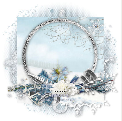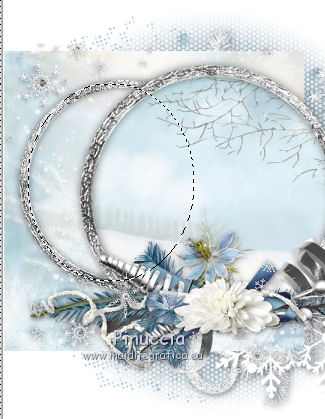 qui puoi trovare qualche risposta ai tuoi dubbi. Se l'argomento che ti interessa non è presente, ti prego di segnalarmelo. Questo tutorial è stato scritto in PSP X4, ma può essere eseguito anche con le altre versioni di PSP. Dalla versione X4, il comando Immagine>Rifletti è stato sostituito con Immagine>Capovolgi in orizzontale, e il comando Immagine>Capovolgi con Immagine>Capovolgi in verticale. Nelle versioni X5 e X6, le funzioni sono state migliorate rendendo disponibile il menu Oggetti. Vedi la scheda sull'argomento qui Per tradurre questo tutorial ho usato PSP X. Occorrente: Un tube a scelta. Le maschere di DD "halftone mask 5" e "wintermask 8" http://dangerouslydeliciousdesignz.blogspot.be/search/label/MASKS qui Clusterframe "Winter Day" di Shanna Lo trovi anche nel materiale. Winter Papers di Cajoline http://cajoline-scrap.blogspot.be/2011/12/freebie-winter-papers-cu.html qui Il tube usato è di Yvonne. ![]() Metti le maschere nella cartella Maschere. 1. Imposta il colore di primo piano con #83afc4. 2. Apri una nuova immagine bianca 700 x 700 pixels. ![]() 3. Livelli>Nuovo livello raster. Riempi con il colore di primo piano.4. Livelli>Carica/Salva maschera>Carica maschera da disco. Cerca e carica la maschera halftone-mask5. ![]() Livelli>Elimina e rispondi sì alla domanda Unire la maschera nel livello corrente. ![]() Livelli>Unisci>Unisci gruppo. 5. Regola>Aggiungi/Rimuovi disturbo>Aggiungi disturbo. ![]() Abbassa l'opacità di questo livello al 75%. 6. Livelli>Nuovo livello raster. Attiva lo strumento Selezione , cerchio,e traccia un grande cerchio al centro dell'immagine. ![]() Riempi la selezione con il colore di primo piano.Selezione>Deseleziona. 7. Regola>Sfocatura>Sfocatura gaussiana - raggio 25. ![]() 8. Effetti>Effetti di trama>Ciottoli. ![]() 9. Apri cajoline_wp2_01, e vai a Modifica>Copia. Torna al tuo lavoro e vai a Modifica>Incolla come nuovo livello. 10. Livelli>Carica/Salva maschera>Carica maschera da disco. Cerca e carica la maschera DD_Wintermask 8. ![]() Livelli>Elimina e rispondi sì alla domanda Unire la maschera nel livello corrente. Livelli>Unisci>Unisci gruppo. 11. Regola>Aggiungi/Rimuovi disturbo>Aggiungi disturbo, con i settaggi precedenti. 12. Effetti>Effetti 3D>Sfalsa ombra, colore nero. ![]() 13. Apri snowflake e vai a Modifica>Copia. Torna al tuo lavoro e vai a Modifica>Incolla come nuovo livello. Spostalo in basso a destra.14. Apri il cluster Winter day e vai a Modifica>Copia. Torna al tuo lavoro e vai a Modifica>Incolla come nuovo livello. Attiva lo strumento Gomma ![]() e cancella il testo al centro della cornice. Regola>Messa a fuoco>Metti a fuoco. 15. Apri cajoline_wp2_05 e vai a Modifica>Copia. Torna al tuo lavoro e vai a Modifica>Incolla come nuovo livello. Immagine>Ridimensiona, al 50%, tutti i livelli non selezionato. Livelli>Disponi>Sposta giù. 16. Attiva lo strumento Selezione , cerchio,e traccia una selezione intorno ai bordi della cornice. ![]() Selezione>Inverti. Premi sulla tastiera il tasto CANC ![]() Selezione>Deseleziona. 17. Attiva il livello superiore Raster 3. Attiva lo strumento Selezione , rettangolo,e traccia una selezione come nell'esempio. ![]() Modifica>Copia. Selezione>Deseleziona. Modifica>Incolla come nuovo livello. 18. Immagine>Ridimensiona, all'80%, tutti i livelli non selezionato. Regola>Messa a fuoco>Metti a fuoco. 19. Immagine>Ruota per gradi - 90 gradi a sinistra. ![]() Sposta la cornice a sinistra.Livelli>Disponi>Sposta giù - 2 volte. ![]() 20. Apri cajoline_wp2_04 e vai a Modifica>Copia. Torna al tuo lavoro e vai a Modifica>Incolla come nuovo livello. Immagine>Ridimensiona, al 50%, tutti i livelli non selezionato. Sposta la carta a sinistra, sulla porzione di cornice.Livelli>Disponi>Sposta giù. 21. Attiva lo strumento Selezione a mano libera ![]() o se preferisci lo strumento Selezione cerchio,e seleziona i bordi della cornice. ![]() Selezione>Inverti. Premi sulla tastiera il tasto CANC. Selezione>Deseleziona. 22. Attiva il livello Raster 3. Apri nuovamente il cluster Winter day. Sul cluster: attiva lo strumento Selezione a mano libera ![]() e traccia una selezione approssimativa, come nell'esempio. ![]() Modifica>Copia. Torna al tuo lavoro e vai a Modifica>Incolla come nuovo livello. Immagine>Ridimensiona, 90 gradi a sinistra. Sposta l'immagine in basso a sinistra.23. Attiva lo strumento Gomma ![]() e cancella i bordi. ![]() 24. Apri strik e vai a Modifica>Copia. Torna al tuo lavoro e vai a Modifica>Incolla come nuovo livello. Spostalo in alto a sinistra.25. Apri il tuo tube e vai a Modifica>Copia. Torna al tuo lavoro e vai a Modifica>Incolla come nuovo livello. Immagine>Ridimensiona, se e quanto necessario, tutti i livelli non selezionato. Posiziona il tube come preferisci.26. Effetti>Effetti 3D>Sfalsa ombra, colore nero. ![]() 27. Apri wordart_deep_inside_Vika, e vai a Modifica>Copia. Torna al tuo lavoro e vai a Modifica>Incolla come nuovo livello. Spostalo in basso.28. Firma il tuo lavoro. Livelli>Unisci>Unisci tutto e salva in formato jpg. ![]() Se hai problemi o dubbi, o trovi un link non funzionante, o anche soltanto per un saluto, scrivimi.