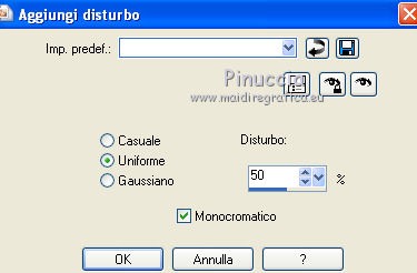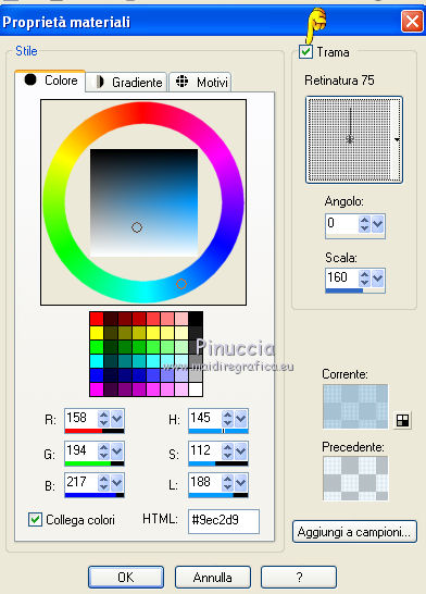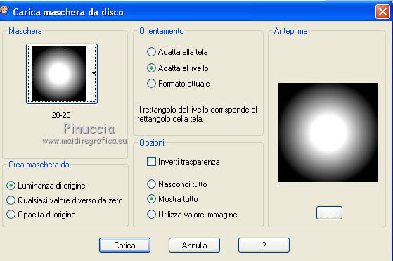 qui puoi trovare qualche risposta ai tuoi dubbi. Se l'argomento che ti interessa non è presente, ti prego di segnalarmelo. Questo tutorial è stato scritto in PSP X2, ma può essere eseguito anche con le altre versioni di PSP. Per tradurlo, l'ho eseguito con PSP X. Occorrente: Un tube a scelta, con il relativo close-up (cioè l'ingrandimento del viso); in mancanza di questo puoi selezionare il viso del tuo tube e ingrandirlo. Il resto del materiale qui Filtri: Penta.com qui ![]() Metti la maschera nella cartella Maschere, e apri il resto del materiale in PSP. Imposta il colore di primo piano con #9ec2d9, e il colore di sfondo con il bianco. 1. Apri Vika_Template1. Questa sarà la base del tuo lavoro. 2. Elimina il livello del ©. 3. Attiva il livello di sfondo "achtergrond". 4. Livelli>Nuovo livello raster. Riempi con il colore di primo piano.5. Livelli>Carica/Salva maschera>Carica maschera da disco. Cerca e carica la maschera 20-20, con i seguenti settaggi. ![]() Livelli>Elimina e rispondi sì alla domanda Unire la maschera nel livello corrente. ![]() Livelli>Unisci>Unisci gruppo. 6. Effetti>Plugins>Penta.com - Jeans. ![]() 7. Passa il colore di primo piano a Gradiente. ![]() 8. Attiva il livello Raster 1. 9. Selezione>Seleziona tutto. Selezione>Mobile. Selezione>immobilizza. 10. Livelli>Nuovo livello raster. Riempi con il gradiente.11. Regola>Aggiungi/Rimuovi disturbo>Aggiungi disturbo. ![]() 12. Selezione>Modifica>Contrai - 5 pixels. 13. Seleziona Trama con il colore di primo piano e imposta la Retinatura 75% (standard in PSP) con i seguenti settaggi. ![]() 14. Livelli>Nuovo livello raster. Riempi il livello con questo colore+trama.15. Selezione>Deseleziona. 16. Elimina il livello Raster 1. 17. Attiva il livello Raster 2. 18. Selezione>Seleziona tutto. Selezione>Mobile. Selezione>Immobilizza. 19. Togli la selezione a trama nelle impostazioni del colore di primo piano, e riempi il livello con questo colore.20. Regola>Aggiungi/Rimuovi disturbo>Aggiungi disturbo, con i settaggi precedenti. 21. Selezione>Modifica>Contrai - 5 pixels. Premi sulla tastiera il tasto CANC. 22. Riempi con il gradiente.23.Effetti>Plugins>Penta.com - Dot and Cross. ![]() 24. Apri il tuo tubeclose-up o ingrandisci una selezione del tuo tube e vai a Modifica>Copia. Torna al tuo lavoro e vai a Modifica>Incolla come nuovo livello. Posiziona il tube nel cerchio.25. Selezione>Inverti. Premi sulla tastiera il tasto CANC. 26. Cambia la modalità di miscelatura di questo livello in Luminanza (esistente), e abbassa l'opacità all'80%. 27. Selezione>Deseleziona. 28. Attiva il livello Raster 3. 29. Selezione>Seleziona tutto. Selezione>Mobile. Selezione>Immobilizza. 30. Riempi con il colore di primo piano.31. Regola>Aggiungi/Rimuovi disturbo>Aggiungi disturbo, con i settaggi precedenti. 32. Selezione>Modifica>Contrai - 5 pixels. Premi sulla tastiera il tasto CANC. 33. Riempi con il gradiente.34. Ripeti i punti 24 e 25. 35. Cambia la modalità di miscelatura di questo livello in Luminanza (esistente). 36. Selezione>Deseleziona. 37. Livelli>Unisci>Unisci giù. 38. Livelli>Duplica. 39. Immagine>Rifletti, e sposta l'immagine sotto il cerchio superiore.40. Apri E17_leaves e vai a Modifica>copia. Torna al tuo lavoro e vai a Modifica>Incolla come nuovo livello. Sposta il tube in basso.41. Attiva il tuo tube e vai a Modifica>copia. Torna al tuo lavoro e vai a Modifica>Incolla come nuovo livello. Spostalo a destra.42. Effetti>Effetti 3D>Sfalsa ombra. ![]() 43. Apri bow e vai a Modifica>copia. Torna al tuo lavoro e vai a Modifica>Incolla come nuovo livello. Spostalo tra i due cerchi piccoli.Apri star e vai a Modifica>copia. Torna al tuo lavoro e vai a Modifica>Incolla come nuovo livello. Livelli>Duplica, quante volte vuoi, e disponi le stelle come preferisci.Apri wordart e vai a Modifica>Copia. Torna al tuo lavoro e vai a Modifica>Incolla come nuovo livello. Posiziona il testo in basso.nel mio esempio, ho cancellato la riga del testo che si riferisce all'autore del tube usato nel tutorial originale 44. Aggiungi il tuo nome e/o il tuo watermark. 45. Livelli>Unisci>Unisci tutto e salva in formato jpg.