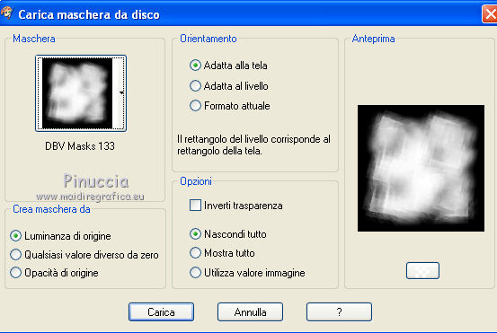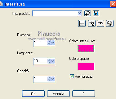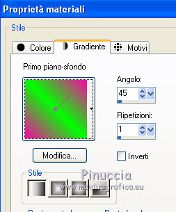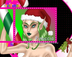 qui puoi trovare qualche risposta ai tuoi dubbi. Se l'argomento che ti interessa non è presente, ti prego di segnalarmelo. Questo tutorial è stato scritto in PSP X2, ma può essere eseguito anche con le altre versioni di PSP. Per tradurlo, l'ho eseguito con PSP X. Occorrente: Un tube a scelta. Lo scrap Freebie di Addictive Pleasure che puoi scaricare http://addictivepleasures.blogspot.com/2010/11/freebie-xmas-kit.html?zx=a99b2623b8db0ea5 qui Il resto del materiale qui La maschera è di DVB. Il tube che ho usato è di Willeke Tbn. ![]() Metti la maschera nella cartella Maschere e apri il resto del materiale in PSP. 1. Apri funky_punky_christmas_back. Attiva il livello di sfondo. 2. Livelli>Nuovo livello raster. Imposta il colore di primo piano con #ffd2ee. Riempi il livello con il colore di primo piano.3. Livelli>Carica/Salva maschera>Carica maschera da disco. Cerca e carica la maschera DBV Masks133. ![]() Livelli>Elimina e rispondi sì alla domanda Unire la maschera nel livello corrente?. ![]() Livelli>Unisci>Unisci gruppo. 4. Livelli>Duplica. 5. Immagine>Capovolgi. 6. Dallo scrapkit apri "snow" e vai a Modifica>Copia. Torna al tuo lavoro e vai a Modifica>Incolla come nuovo livello. 7. Apri snowflakes, e vai a Modifica>Copia. Torna al tuo lavoro e vai a Modifica>Incolla come nuovo livello. Sposta il tube in alto a sinistra.8. Livelli>Duplica. 9. Immagine>Rifletti. Sposta questo duplicato in basso a destra.10. Attiva il livello "oval". 11. Selezione>Seleziona tutto. Selezione>Mobile. Selezione>Immobilizza. 12. Livelli>Nuovo livello raster. Imposta il colore di primo piano con #ff0ae. Riempi il livello con questo colore.13. Selezione>Modifica>Contrai - 4 pixels. Riempi la selezione con il colore nero.14. Effetti>Effetti di trama>Intessitura - colore intessitura e colore spazio con il colore #ff00ae. ![]() 15. Selezione>Deseleziona. 16. Elimina il livello "oval". 17. Attiva il livello "maan". 18. Selezione>Seleziona tutto. Selezione>Mobile. Selezione>Immobilizza. 20. Selezione>Inverti. Premi sulla tastiera il tasto CANC. 21. Selezione>Deseleziona. 22. Effetti>Effetti 3D>Sfalsa ombra. ![]() 23. Elimina il livello "maan". 24. Attiva il livello "rechthoek2". 25. Selezione>Seleziona tutto. Selezione>Mobile. Selezione>Immobilizza. 26. Riempi la selezione con il colore #ff00a6.27. Selezione>Deseleziona. 28. Colore di primo piano #ff00a6, colore di sfondo #00ff00. Passa il colore di primo piano a Gradiente: ![]() 29. Attiva il livello "rechthoek1". 30. Selezione>Seleziona tutto. Selezione>Mobile. Selezione>Immobilizza. 31. Riempi la selezione con il gradiente.32. Selezione>Deseleziona. 33. Apri il tuo tube e vai a Modifica>Copia. Torna al tuo lavoro e vai a Modifica>Incolla come nuovo livello. Spostalo nella cornice a destra.34. Attiva lo strumento Selezione , rettangolo,e seleziona la cornice. ![]() 35. Selezione>Inverti. Premi sulla tastiera il tasto CANC. 36. Selezione>Deseleziona. 37. Cambia la modalità di miscelatura di questo livello in Luminanza (esistente), e abbassa l'opacità all'80%. se il tuo tube non copre la maggior parte della cornice a sinistra, come nel mio esempio, ripeti questi passaggi per la cornice a sinistra. 38. Attiva il livello "rechthoek2". 39. Apri il tuo tube e vai a Modifica>Copia. Torna al tuo lavoro e vai a Modifica>Incolla come nuovo livello. Sposta il tube a sinistra.40. Effetti>Effetti 3D>Sfalsa ombra, con i settaggi precedenti. 41. Apri gli elementi scrap che vuoi unire al tuo lavoro, copiali e incollali come nuovo livello. Applica a questi livelli l'Effetto Sfalsa ombra, con i settaggi precedenti. 43. Aggiungi il tuo nome e/o il tuo watermark su un nuovo livello. 44. Livelli>Unisci>Unisci tutto e salva in formato jpg.