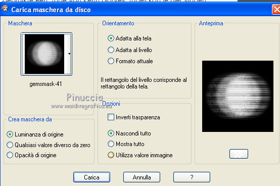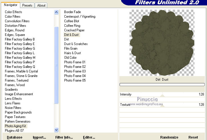 qui puoi trovare qualche risposta ai tuoi dubbi. Se l'argomento che ti interessa non è presente, ti prego di segnalarmelo. Questo tutorial è stato scritto in PSP X2, ma può essere eseguito anche con le altre versioni di PSP. Per tradurlo, l'ho eseguito con PSP X. Occorrente: Un tube a scelta. Lo scrap kit Romancing the heart di Vaybs che puoi scaricare http://designsbyvaybs.blogspot.com/search/label/Tag%20Sized%20Kits qui Il resto del materiale qui Per i miei esempi ho usato tubes di Bibiche. La maschera è di Gems Filtri: se hai problemi con i filtri, ricorda di consultare la mia sezione Filtri qui Filters Unlimited 2.0 qui Photo Aging Kit - Dirt and Dust qui Per usare i filtri Photo Aging Kit bisogna importarli in Filters Unlimited. Come fare vedi qui ![]() Metti la maschera nella cartella Maschere. Imposta il colore di primo piano con #595a40. 1. Apri una nuova immagine bianca 650 x 650 pixels. ![]() 2. Livelli>Nuovo livello raster. Riempi con il colore di primo piano.3. Livelli>Carica/Salva maschera>Carica maschera da disco. Cerca e carica la maschera gemsmasks-41. ![]() Livelli>Unisci>Unisci gruppo. 4. Dallo scrapkit Romancing the heart apri DBV_Romancing_the_heart_element (il testo). Modifica>Copia. Torna al tuo lavoro e vai a Modifica>Incolla come nuovo livello. 5. Immagine>Ridimensiona, all'85%, tutti i livelli non selezionato. Spostalo a destra.6. Apri DBV_Romancing_the_heart_element(28) e vai a Modifica>Copia. Torna al tuo lavoro e vai a Modifica>Incolla come nuovo livello. Spostalo in basso.7. Effetti>Effetti 3D>Sfalsa ombra: ![]() 8. Apri DBV_Romancing_the_heart_element(29) e vai a Modifica>Copia. Torna al tuo lavoro e vai a Modifica>Incolla come nuovo livello. Spostalo a destra.![]() 9. Apri DBV_Romancing_the_heart_element(24) e vai a Modifica>Copia. Torna al tuo lavoro e vai a Modifica>Incolla come nuovo livello. 10. Effetti>Effetti 3D>Sfalsa ombra, con i settaggi precedenti. 11. Attiva lo strumento Selezione , da punto a punto,e seleziona la cornice come nell'esempio. ![]() 12. Livelli>Nuovo livello raster. Riempi con il colore di primo piano.13. Effetti>Plugins>Filters Unlimited 2.0 - Photo Aging Kit - Dirt&Dust. ![]() 14. Selezione>Deseleziona. 15. Livelli>Disponi>Sposta giù. 16. Apri il tuo tube e vai a Modifica>Copia. Torna al tuo lavoro e vai a Modifica>Incolla come nuovo livello. Spostalo al centro della cornice.17. Cambia la modalità di miscelatura di questo livello in Luminanza (esistente). in fondo al tutorial l'esempio senza questo passaggio 18. Livelli>Duplica. 19. Livelli>Disponi>Sposta giù. 20. Attiva nuovamente il livello originale (il livello sopra la cornice). Attiva lo strumento Selezione , rettangolo,e seleziona la parte inferiore del tube. ![]() Premi sulla tastiera il tasto CANC. Selezione>Deseleziona. 21. Attiva il livello della copia (il livello sotto la cornice). Cancella le eventuali tracce del tube rimaste sotto la cornice.22. Effetti>Effetti 3D>Sfalsa ombra. ![]() Attiva il livello superiore. 23. Apri DBV_Romancing_the_heart_element(20) e vai a Modifica>Copia. Torna al tuo lavoro e vai a Modifica>Incolla come nuovo livello. 24. Immagine>Ridimensiona, al 50%, tutti i livelli non selezionato. Sposta l'elemento in basso a destra.25. Aggiungi il tuo nome e/o il tuo watermark su un nuovo livello. 26. Livelli>Unisci>Unisci tutto e salva in formato jpg. Variante senza cambiare la modalità di miscelatura al tube. ![]() ![]()