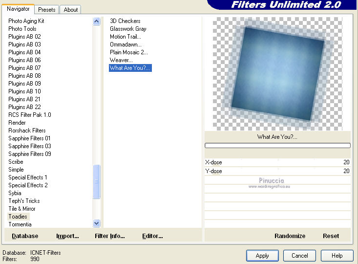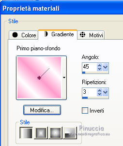qui puoi trovare qualche risposta ai tuoi dubbi. Se l'argomento che ti interessa non è presente, ti prego di segnalarmelo. Questo tutorial è stato scritto in PSP X4, ma può essere eseguito anche con le altre versioni di PSP. Per tradurlo, l'ho eseguito con PSP X. Occorrente: Un tube a scelta con il relativo close-up o l'ingrandimento del tuo tube. La maschera DBV Mask 133 che puoi scaricare http://designsbyvaybs.blogspot.com/search/label/Masks qui Lo scrapkit "I love you" di Anna Jolanta che puoi scaricare http://mojscrapblog.blogspot.de/2012/05/new-kit-i-love-you-free.html qui Filtri: Filters Unlimited 2.0 qui Toadies - What are you qui Metti la maschera nella cartella Maschere. Imposta il colore di primo piano con #fd9bcb, e il colore di sfondo con il colore bianco. Passa il colore di primo piano a Gradiente. ![]() 1. Apri una nuova immagine bianca 800 x 700 pixels. ![]() 2. Livelli>Nuovo livello raster. Riempi con il gradiente.3. Livelli>Carica/Salva maschera>Carica maschera da disco. Cerca e carica la maschera DBV Mask 133. ![]() Livelli>Elimina, e rispondi sì alla domanda Unire la maschera nel livello corrente. ![]() Livelli>Unisci>Unisci gruppo. Sposta la maschera in basso a destra.4. Livelli>Duplica. Immagine>Rifletti. Sposta in basso a sinistra.5. Apri I love you by Anna-Jolanta_PP(7). Immagine>Ridimensiona, 2 volte al 50%, tutti i livelli non selezionato. Modifica>Copia. Torna al tuo lavoro e vai a Modifica>Incolla come nuovo livello. 6. Immagine>Ruota per gradi - 10 gradi a destra. ![]() 7. Effetti>Plugins>Filters Unlimited 2.0 - What are you. ![]() 8. Apri I love you by Anna-Jolanta_WA(6). Immagine>Ridimensiona, 2 volte al 50%, tutti i livelli non selezionato. Modifica>Copia. Torna al tuo lavoro e vai a Modifica>Incolla come nuovo livello. Sposta il testo in basso a destra.9. Apri I love you by Anna-Jolanta_EL(69). Immagine>Ridimensiona, al 50%, tutti i livelli non selezionato. Modifica>Copia. Torna al tuo lavoro e vai a Modifica>Incolla come nuovo livello. 10. Immagine>Ruota per gradi - 100 gradi a destra. ![]() Regola>Messa a fuoco>Metti a fuoco. 11. Attiva lo strumento Gomma ![]() e cancella le pietre esterne ![]() 12. Apri I love you by Anna-Jolanta_Cluster(5). Immagine>Ridimensiona, 1 volt1 al 50% e una volta all'85%, tutti i livelli non selezionato. Modifica>Copia. Torna al tuo lavoro e vai a Modifica>Incolla come nuovo livello. 13. Apri I love you by Anna-Jolanta_EL(74). Immagine>Ridimensiona, al 50%, tutti i livelli non selezionato. Modifica>Copia. Torna al tuo lavoro e vai a Modifica>Incolla come nuovo livello. Sposta l'elemento in alto.14. Effetti>Effetti 3D>Sfalsa ombra. ![]() 15. Livelli>Disponi>Sposta giù. Attiva lo strumento Gomma ![]() e cancella la parte dell'elemento visibili nella cornice. ![]() 16. Apri il tuo close-up, o l'ingrandimento del viso del tuo tube, e vai a Modifica>Copia. Torna al tuo lavoro e vai a Modifica>Incolla come nuovo livello. Posiziona il tube nella cornice.17. Attiva lo strumento Selezione , cerchio,o, se preferisci lo strumento Selezione a mano libera ![]() e traccia una selezione intorno alla cornice. ![]() 18. Selezione>Inverti. Premi sulla tastiera il tasto CANC. Selezione>Deseleziona. Abbassa l'opacità di questo livello all'85%. 19. Attiva il livello Raster 2, e cancella le lettere visibili nella cornice.![]() 20. Attiva il livello Raster 4. 21. Apri il tuo tube e vai a Modifica>Copia. Torna al tuo lavoro e vai a Modifica>Incolla come nuovo livello. Sposta il tube a sinistra.22. Effetti>Effetti 3D>Sfalsa ombra, con i settaggi precedenti. 23. Apri I love you by Anna-Jolanta_WA(2). Immagine>Ridimensiona, 2 volte al 50%, tutti i livelli non selezionato. Modifica>Copia. Torna al tuo lavoro e vai a Modifica>Incolla come nuovo livello. Sposta il testo in basso a destra.24. Attiva il livello Raster 4. Cancella la palla blu dietro il tube.![]() 25. Aggiungi il tuo nome e/o il tuo watermark. Livelli>Unisci>Unisci tutto e salva in formato jpg. ![]() Se hai problemi o dubbi, o trovi un link non funzionante, o anche soltanto per un saluto, scrivimi.