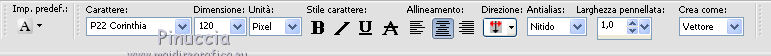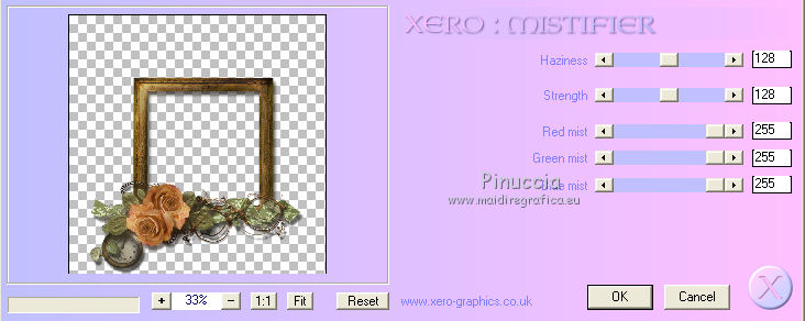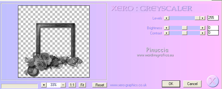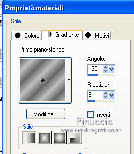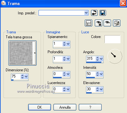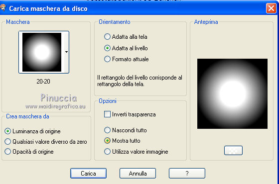 qui puoi trovare qualche risposta ai tuoi dubbi. Se l'argomento che ti interessa non è presente, ti prego di segnalarmelo. Questo tutorial è stato scritto in PSP X2, ma può essere eseguito anche con le altre versioni di PSP. Per tradurlo, l'ho eseguito con PSP X. Occorrente: Un tube a scelta. Il resto del materiale qui La cornice è di Rospberry road designs Filtri: Xero - Mistifier e Greyscaler qui Apri il font e minimizzalo. Lo troverai nella lista dei font disponibili quando ti servirà. Metti le maschere nella cartella Maschere, e apri il resto del materiale in PSP. Imposta il colore di primo piano con #656565, e il colore di sfondo con #c0c0c0. 1. Apri una nuova immagine bianca 700 x 700 pixels. 2. Livelli>Nuovo livello raster. Riempi con il colore di sfondo (tasto destro del mouse).3. Livelli>Carica/Salva maschera>Carica maschera da disco. Cerca e carica la maschera 20-20. ![]() Livelli>Elimina, e rispondi sì alla domanda Unire la maschera nel livello corrente. ![]() Livelli>Unisci>Unisci gruppo. 4. Livelli>Nuovo livello raster. Riempi con il colore di primo piano.5. Livelli>Carica/Salva maschera>Carica maschera da disco. Cerca e carica la maschera Narah_mask_Esfera009. ![]() Livelli>Elimina, e rispondi sì alla domanda Unire la maschera nel livello corrente. Livelli>Unisci>Unisci gruppo. 6. Abbassa l'opacità di questo livello al 60%. 7. Apri background-josephine, e vai a Modifica>copia. Torna al tuo lavoro e vai a Modifica>Incolla come nuovo livello. 8. Apri feather, e vai a Modifica>Copia. Torna al tuo lavoro e vai a Modifica>Incolla come nuovo livello. Sposta la piuma a sinistra.![]() 9. Apri RRD Moments in Time cluster, e vai a Modifica>copia. Torna al tuo lavoro e vai a Modifica>Incolla come nuovo livello. Sposta la cornice in basso.![]() 10. Effetti>Plugins>Xero - Mistifier. ![]() 11. Effetti>Plugins>Xero - Greyscaler. ![]() 12. Passa il colore di primo piano a Gradiente. ![]() 13. Attiva lo strumento Selezione , rettangolo,e seleziona la cornice. ![]() 14. Livelli>Nuovo livello raster. Riempi con il gradiente.15. Effetti>Effetti di trama>Trama - seleziona la trama Tela grossa con i seguenti settaggi. ![]() 16. Selezione>Deseleziona. 17. Livelli>Disponi>Sposta giù. 18. Apri il tuo tube e vai a Modifica>copia. Torna al tuo lavoro e vai a Modifica>Incolla come nuovo livello. Spostalo un po' più in alto.19. Effetti>Plugins>Xero - Greyscaler con i settaggi precedenti. 20. Livelli>Duplica. 21. Livelli>Disponi>Sposta su. 22. Attiva lo strumento Selezione , rettangolo,e seleziona la parte inferiore del tube. ![]() Premi sulla tastiera il tasto CANC. 23. Selezione>Seleziona. 24. Attiva il livello Raster 3. 25. Apri Curtain, e vai a Modifica>copia. Torna al tuo lavoro e vai a Modifica>Incolla come nuovo livello. Sposta la tendina sulla cornice.26. Attiva il livello superiore. 27. Apri Feather 2, e vai a Modifica>copia. Torna al tuo lavoro e vai a Modifica>Incolla come nuovo livello. Sposta questa piuma in basso a destra.28. Apri Bow2, e vai a Modifica>copia. Torna al tuo lavoro e vai a Modifica>Incolla come nuovo livello. Sposta il tube in basso a destra.29. Apri Bow, e vai a Modifica>copia. Torna al tuo lavoro e vai a Modifica>Incolla come nuovo livello. Sposta anche questo tube in basso a destra, vedi il mio esempio.30. Imposta il colore di primo piano con il nero, e il colore di sfondo con il bianco. 31. Attiva lo strumento Testo , font P22 Corinthia.![]() dovrai regolare la dimensione in base al tuo testo e alla versione di PSP che stai usando Scrivi Josephine, o quello che preferisci. 32. Livelli>Nuovo livello raster. 33. Effetti>Effetti 3D>Sfalsa ombra, con il colore nero. ![]() 34. Aggiungi il tuo nome e/o il tuo watermark su un nuovo livello, senza dimenticare eventuali copyright delle immagini usate. 35. Livelli>Unisci>Unisci tutto e salva in formato jpg. ![]() ![]() ![]()