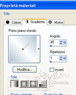 qui puoi trovare qualche risposta ai tuoi dubbi. Se l'argomento che ti interessa non è presente, ti prego di segnalarmelo. Questo tutorial è stato scritto in PSP X2, ma può essere eseguito anche con le altre versioni di PSP. Per tradurlo, l'ho eseguito con PSP X. Occorrente: Un tube a scelta. Il resto del materiale qui Il mio tube è di Annelies. Il materiale scrap è di Cinnamon Scraps ![]() Metti la maschera nella cartella Maschere e apri il resto del materiale in PSP. Imposta il colore di primo piano con #adc3d0, e il colore di sfondo con il bianco. 1. Apri una nuova immagine bianca 700 x 700 pixels. ![]() 2. Livelli>Nuovo livello raster. Riempi con il colore di primo piano.3. Livelli>Carica/Salva maschera>Carica maschera da disco. Cerca e carica la maschera 20-20. ![]() Livelli>Elimina e rispondi sì alla domanda Unire la maschera nel livello corrente?. ![]() Livelli>Unisci>Unisci gruppo. 4. Apri sparkles, e vai a Modifica>Copia. Torna al tuo lavoro e vai a Modifica>Incolla come nuovo livello. Sposta le stelle in alto.5. Apri diamants_frame e vai a Modifica>Copia. Torna al tuo lavoro e vai a Modifica>Incolla come nuovo livello. 6. Apri CS_snowprincess_doodle1, e vai a Modifica>Copia. Torna al tuo lavoro e vai a Modifica>Incolla come nuovo livello. Spostalo in basso.7. Apri CS_snowprincess_foldedribbon2, e vai a Modifica>Copia. Torna al tuo lavoro e vai a Modifica>Incolla come nuovo livello. 8. Effetti>Effetti 3D>Sfalsa ombra. ![]() 9. Apri CS_snowprincess_frame4 e vai a Modifica>copia. Torna al tuo lavoro e vai a Modifica>Incolla come nuovo livello. 10. Livelli>Nuovo livello raster. 11. Passa il colore di primo piano a Gradiente. ![]() 12. Attiva lo strumento Selezione , cerchio,e seleziona la cornice. Riempi la selezione con il gradiente.13. Selezione>Deseleziona. 14. Livelli>Disponi>Sposta giù. 15. Effetti>Effetti di trama>Intessitura. ![]() 16. Apri CS_snowprincess_foldedpaper e vai a Modifica>copia. Torna al tuo lavoro e vai a Modifica>Incolla come nuovo livello. Sposta l'immagine un po' più in basso.17. Attiva il livello Raster 6. 18. Selezione>Seleziona tutto. Selezione>Mobile. Selezione>Immobilizza. 19. Attiva il livello Raster 7. 20. Selezione>Inverti. Premi sulla tastiera il tasto CANC. 21. Selezione>Deseleziona. 22. Apri il tuo tube e vai a Modifica>Copia. Torna al tuo lavoro e vai a Modifica>Incolla come nuovo livello. 23. Immagine>Rifletti. Sposta il tube a sinistra, nella cornice.24. Attiva il livello Raster 6. 25. Selezione>Seleziona tutto. Selezione>Mobile. Selezione>Immobilizza. 26. Attiva il livello Raster 8 (il tube). 27. Selezione>Inverti. Premi sulla tastiera il tasto CANC. 28. Selezione>Deseleziona. 29. Cambia la modalità di miscelatura di questo livello in Luminanza (esistente), e abbassa l'opacità al 40%. 30. Attiva il livello Raster 5. 31. Modifica>Incolla come nuovo livello (il tuo tube dovrebbe essere ancora in memoria). Spostalo a destra.32. Effetti>Effetti 3D>Sfalsa ombra. ![]() 33. Apri i restanti elementi scrap, copiali e incollali come nuovo livello. Posiziona questi elementi come preferisci, o vedi il mio esempio.Per tutti: Effetti>Effetti 3D>Sfalsa ombra, come al punto 8. ![]() 34. Aggiungi il tuo nome e/o il tuo watermark. 35. Livelli>Unisci>Unisci tutto e salva in formato jpg.