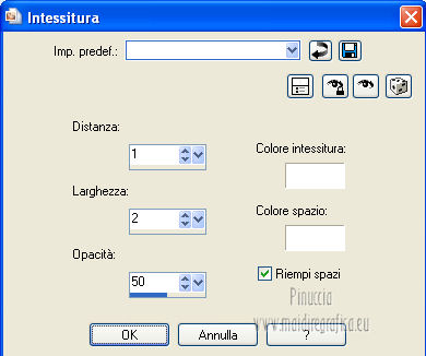 qui puoi trovare qualche risposta ai tuoi dubbi. Se l'argomento che ti interessa non è presente, ti prego di segnalarmelo. Questo tutorial è stato scritto in PSP X4, ma può essere eseguito anche con le altre versioni di PSP. Per tradurlo, l'ho eseguito con PSP X. Occorrente: Il cluster Lady in Red di Raspberry Road Designs che puoi scaricare http://raspberryroaddesigns.blogspot.be/search/label/CT%20Freebie qui Un tube a scelta. Il resto del materiale qui Il tube usato per il mio esempio è di Lila. 1. Imposta il colore di primo piano con #8260b4. 2. Apri RRD_EK_LadyinRed clusterD. Immagine>Ridimensiona, 2 volte al 50% e una volta all'85%. Modifica>Copia. 3. Apri Background_lilac_blossom e vai a Modifica>Incolla come nuovo livello. 4. Immagine>Capovolgi, e sposta il cluster un po' più in basso.![]() 6. Livelli>Duplica. Immagine>Rifletti. 7. Immagine>Ruota per gradi - 10 gradi a sinistra. ![]() Sposta questa cornice un po' più in alto.![]() 8. Attiva il livello inferiore del cluster. Livelli>Nuovo livello raster. Attiva lo strumento Selezione a mano libera , da punto a punto,e traccia una selezione come nell'esempio. ![]() Riempi la selezione con il colore di primo piano.9. Effetti>Effetti di trama>Intessitura, entrambi i colori impostati con il colore bianco. ![]() Selezione>Deseleziona. 10. Attiva il livello Raster 1. Apri il tuo tube e vai a Modifica>Copia. Torna al tuo lavoro e vai a Modifica>Incolla come nuovo livello. Spostalo al centro della cornice.11. Livelli>Duplica, e spostalo a destra.12. Livelli>Duplica. Immagine>Rifletti, e spostalo a sinistra.![]() 13. Livelli>Unisci>Unisci giù - 2 volte. 14. Attiva lo strumento Selezione a mano libera , da punto a punto,e traccia una selezione intorno alla cornice. ![]() Selezione>Inverti. Premi sulla tastiera il tasto CANC. Selezione>Deseleziona. 15. Copia e incolla sul tuo lavoro i tubes delle farfalle, e disponili come preferisci, o vedi il mio esempio.16. Apri wordart_lilac_blossom-Vika, e vai a Modifica>Copia. Torna al tuo lavoro e vai a Modifica>Incolla come nuovo livello. Spostalo dove preferisci, o vedi il mio esempio.17. Aggiungi il tuo nome e/o il tuo watermark. 18. Livelli>Unisci>Unisci tutto e salva in formato jpg. ![]() Se hai problemi o dubbi, o trovi un link non funzionante, o anche soltanto per un saluto, scrivimi.