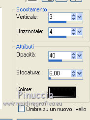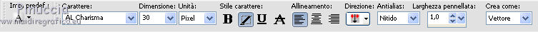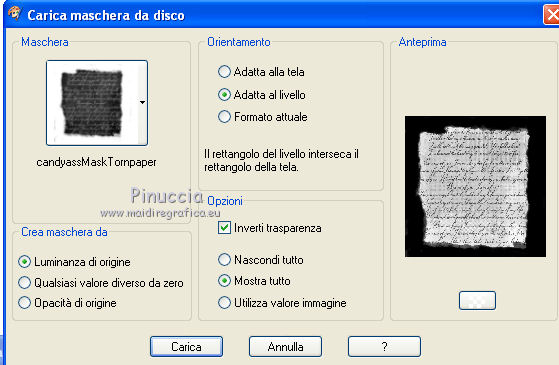 qui puoi trovare qualche risposta ai tuoi dubbi. Se l'argomento che ti interessa non è presente, ti prego di segnalarmelo. Questo tutorial è stato scritto in PSP X2, ma può essere eseguito anche con le altre versioni di PSP. Per tradurlo, l'ho eseguito con PSP X. Occorrente: Un tube a scelta. Il resto del materiale qui Il tube usato è di TJ. Il materiale scrap è di BlackCherry Apri il font e minimizzalo. Lo troverai nella lista dei font disponibili quando ti servirà. Metti la maschera nella cartella Maschere, e apri il resto del materiale in PSP. 1. Apri una nuova immagine bianca 650x650 pixels. ![]() 2. Apri Love on Paper_pp6_BCS e e vai a Modifica>copia. Torna al tuo lavoro e vai a Modifica>Incolla come nuovo livello. 3. Livelli>Carica/Salva maschera>Carica maschera da disco. Cerca e carica la maschera CandyassMaskTornpaper. ![]() Livelli>Elimina, e rispondi sì alla domanda Unire la maschera nel livello corrente. ![]() Livelli>Unisci>Unisci gruppo. 4. Apri Love on Paper_Ele18_BCS e vai a Modifica>copia. Torna al tuo lavoro e vai a Modifica>Incolla come nuovo livello. 5. Effetti>Effetti 3D>Sfalsa ombra. ![]() 6. Apri Love on Paper_pp4_BCS e e vai a Modifica>copia. Torna al tuo lavoro e vai a Modifica>Incolla come nuovo livello. 7. Livelli>Disponi>Sposta giù. 8. Attiva lo strumento Selezione a mano libera ![]() e seleziona la cornice. ![]() 9. Selezione>Inverti. Premi sulla tastiera il tasto CANC. 10. Selezione>Deseleziona. 11. Attiva il livello superiore - Raster 1. 12. Apri Love on Paper_ele29_BCS e vai a Modifica>copia. Torna al tuo lavoro e vai a Modifica>Incolla come nuovo livello. Sposta l'elemento a sinistra.13. Apri il tuo tube e vai a Modifica>copia. Torna al tuo lavoro e vai a Modifica>Incolla come nuovo livello. Sposta il tube a sinistra.14. Effetti>Effetti 3D>Sfalsa ombra. ![]() 15. Aggiungi gli altri elementi scrap a tua scelta. 16. Ripeti l'Effetto Sfalsa ombra del punto 5. 17. Attiva il livello superiore. 18. Chiudi il colore di primo piano e imposta il colore di sfondo con il nero. 19. Attiva lo strumento Testo ![]() e seleziona il font Al Charisma con i seguenti settaggi. ![]() Scrivi il tuo testo e posizionalo. Livelli>Converti in livello raster. 20. Aggiungi il tuo nome e/o il tuo watermark. 21. Livelli>Unisci>Unisci tutto e salva in formato jpg.
