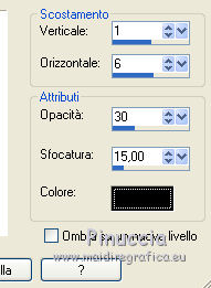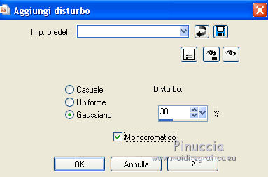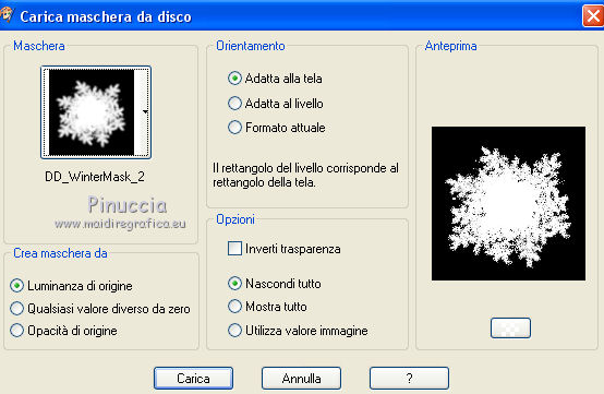 qui puoi trovare qualche risposta ai tuoi dubbi. Se l'argomento che ti interessa non è presente, ti prego di segnalarmelo. Questo tutorial è stato scritto in PSP X4, ma può essere eseguito anche con le altre versioni di PSP. Dalla versione X4, il comando Immagine>Rifletti è stato sostituito con Immagine>Capovolgi in orizzontale, e il comando Immagine>Capovolgi con Immagine>Capovolgi in verticale. Nelle versioni X5 e X6, le funzioni sono state migliorate rendendo disponibile il menu Oggetti. Vedi la scheda sull'argomento qui Per tradurre questo tutorial ho usato PSP X. Occorrente: Maschera di DD>Wintermasks>Wintermask 2, che puoi scaricare http://dangerouslydeliciousdesignz.blogspot.be/search/label/MASKS qui Un tube a scelta. Il resto del materiale qui Il tube utilizzato è di Yvonne. Gli elementi scrap sono una creazione di Molemina. Lo scrap completo "White Christmas" http://moleminka.blogspot.be/search/label/My%20Freebie qui Metti le maschere nella cartella maschere. 1. Apri una nuova immagine bianca 700 x 700 pixels. ![]() 2. Livelli>Nuovo livello raster. Selezione>Seleziona tutto. 3. Apri pp(13), e vai a Modifica>Copia. Torna al tuo lavoro e vai a Modifica>Incolla nella selezione. Selezione>Deseleziona. 4. Livelli>Carica/Salva maschera>Carica maschera da disco. Cerca e carica la maschera 20-20 ![]() Livelli>Elimina e rispondi sì alla domanda Unire la maschera nel livello corrente. Livelli>Unisci>Unisci gruppo. 5. Apri pp(14) e vai a Modifica>Copia. Torna al tuo lavoro e vai a Modifica>Incolla come nuovo livello. 6. Livelli>Carica/Salva maschera>Carica maschera da disco. Cerca e carica la maschera DD_Wintermask_2. ![]() Livelli>Elimina e rispondi sì alla domanda Unire la maschera nel livello corrente. Livelli>Unisci>Unisci gruppo. 7. Apri el(155) e vai a Modifica>Copia. Torna al tuo lavoro e vai a Modifica>Incolla come nuovo livello. Sposta l'elemento a sinistra.8. Regola>Aggiungi/Rimuovi disturbo>Aggiungi disturbo. ![]() 9. Apri el(133) e vai a Modifica>Copia. Torna al tuo lavoro e vai a Modifica>Incolla come nuovo livello. Sposta l'elemento al centro della cornice.10. Apri il tube fur e vai a Modifica>Copia. Torna al tuo lavoro e vai a Modifica>Incolla come nuovo livello. Spostalo in basso.11. Apri el(49) e vai a Modifica>Copia. Torna al tuo lavoro e vai a Modifica>Incolla come nuovo livello. Sposta nella cornice.12. Apri el(149) e vai a Modifica>Copia. Torna al tuo lavoro e vai a Modifica>Incolla come nuovo livello. Sposta l'elemento a destra.![]() 13. Apri el(113) e vai a Modifica>Copia. Torna al tuo lavoro e vai a Modifica>Incolla come nuovo livello. Sposta l'elemento sopra la cornice.14. Effetti>Effetti 3D>Sfalsa ombra, colore nero. ![]() 15. Apri el(13) e vai a Modifica>Copia. Torna al tuo lavoro e vai a Modifica>Incolla come nuovo livello. Sposta l'elemento nella parte superiore della cornice.16. Effetti>Effetti 3D>Sfalsa ombra, con i settaggi precedenti. 17. Apri el(108) e vai a Modifica>Copia. Torna al tuo lavoro e vai a Modifica>Incolla come nuovo livello. Sposta l'elemento a sinistra18. Effetti>Effetti 3D>Sfalsa ombra. 19. Livelli>Duplica, e sposta il duplicato a destra.![]() 20. Attiva il livello Raster 7. Attiva lo strumento Gomma ![]() e cancella le piccole parti del cordino che non devono vedersi. ![]() Dovresti avere questo. ![]() 21. Apri el(34) e vai a Modifica>Copia. Torna al tuo lavoro e vai a Modifica>Incolla come nuovo livello. Sposta l'elemento in basso a sinistra.Effetti>Effetti 3D>Sfalsa ombra, con i settaggi precedenti. 22. Apri el(159) e vai a Modifica>Copia. Torna al tuo lavoro e vai a Modifica>Incolla come nuovo livello. Sposta anche questo elemento in basso a sinistra.23. Aggiungi al tuo scrap gli elementi decorativi che preferisci. 24. Apri il tuo tube e vai a Modifica>Copia. Torna al tuo lavoro e vai a Modifica>Incolla come nuovo livello. Immagine>Ridimensiona, se e quanto necessario, tutti i livelli non selezionato. Sposta il tube in basso a destra.Effetti>Effetti 3D>Sfalsa ombra, con i settaggi precedenti. 25. Aggiungi il tuo nome e/o il tuo watermark su un nuovo livello. 26. Livelli>Unisci>Unisci tutto e salva in formato jpg. ![]() Le vostre versioni. Grazie ![]() Cookies ![]() Se hai problemi o dubbi, o trovi un link non funzionante, o anche soltanto per dirmi che ti è piaciuto, scrivimi.