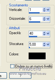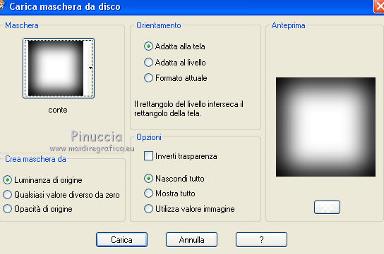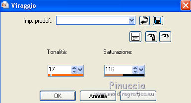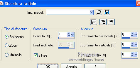 qui puoi trovare qualche risposta ai tuoi dubbi. Se l'argomento che ti interessa non è presente, ti prego di segnalarmelo. Questo tutorial è stato scritto in PSP X4, ma può essere eseguito anche con le altre versioni di PSP. Per tradurlo, l'ho eseguito con PSP X. Occorrente: Tube a scelta. Scrapset "The Witches Den" di Vabys" http://designsbyvaybs.blogspot.be/search/label/Halloween%20Freebies qui Scrapset "Noche de Brujas II" di Belscrap 10/2011 http://belscrap.blogspot.be/2011/10/noche-de-brujas-ii.html qui Il resto del materiale qui Il tube che ho usato è di Nikita. Metti la maschera nella cartella Maschere. 1. Apri una nuova immagine nera 700 x 700 pixels. 2. Apri Halloween_Paper e vai a Modifica>Copia. Torna al tuo lavoro e vai a Modifica>Incolla come nuovo livello. 3. Livelli>Carica/Salva maschera>Carica maschera da disco. Cerca e carica la maschera Conte. ![]() Livelli>Elimina e rispondi sì alla domanda unire la maschera nel livello corrente. ![]() Livelli>Unisci>Unisci gruppo. 4. Apri DBV_TheWitchesDen_element (34), e vai a Modifica>Copia. Torna al tuo lavoro e vai a Modifica>Incolla come nuovo livello. Sposta l'elemento in alto a destra.Livelli>Disponi>Sposta giù. 5. Regola>Tonalità e saturazione>Viraggio. ![]() 6. Regola>Sfocatura>Sfocatura radiale. ![]() ![]() 7. Attiva il livello superiore. Apri DBV_TheWitchesDen_element (15), e vai a Modifica>Copia. Torna al tuo lavoro e vai a Modifica>Incolla come nuovo livello. Sposta l'elemento a destra.Livelli>Disponi>Sposta giù. 8. Attiva il livello superiore. Apri DBV_TheWitchesDen_element (29), e vai a Modifica>Copia. Torna al tuo lavoro e vai a Modifica>Incolla come nuovo livello. Sposta l'elemento in basso.Attiva lo strumento Puntatore ![]() e tira l'erba a destra e a sinistra. ![]() Livelli>Disponi>Sposta giù. 9. Attiva il livello superiore. Apri DBV_TheWitchesDen_element (70), e vai a Modifica>Copia. Torna al tuo lavoro e vai a Modifica>Incolla come nuovo livello. Sposta l'elemento a sinistra.10. Regola>Tonalità e saturazione>Viraggio, con i settaggi precedenti. Abbassa l'opacità di questo livello al 70%. 11. Attiva lo strumento Gomma ![]() e cancella in basso le foglie che non devono vedersi. ![]() 12. Apri BS15-Gato e vai a Modifica>Copia. Torna al tuo lavoro e vai a Modifica>Incolla come nuovo livello. Sposta l'elemento a destra.13. Apri BS15-Hojas-s e vai a Modifica>Copia. Torna al tuo lavoro e vai a Modifica>Incolla come nuovo livello. Sposta la foglia in basso a sinistra.14. Apri BS15-Olla-s e vai a Modifica>Copia. Torna al tuo lavoro e vai a Modifica>Incolla come nuovo livello. Sposta anche questo elemento in basso a sinistra.15. Apri lantaarn e vai a Modifica>Copia. Torna al tuo lavoro e vai a Modifica>Incolla come nuovo livello. Sposta la lanterna in alto a sinistra.16. Apri il tuo tube e vai a Modifica>Copia. Torna al tuo lavoro e vai a Modifica>Incolla come nuovo livello. Sposta il tube dove preferisci,o vedi il mio esempio. 17. Effetti>Effetti 3D>Sfalsa ombra, colore nero. ![]() 18. Apri wordart_midnight_witch_Vika, e vai a Modifica>Copia. Torna al tuo lavoro e vai a Modifica>Incolla come nuovo livello. Sposta il wordart in basso a sinistra.19. Aggiungi il tuo nome e/o il tuo watermark su un nuovo livello. 20. Livelli>Unisci>Unisci tutto e salva in formato jpg. ![]() Se hai problemi o dubbi, o trovi un link non funzionante, o anche soltanto per un saluto, scrivimi.