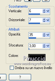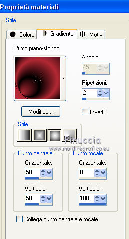qui puoi trovare qualche risposta ai tuoi dubbi. Se l'argomento che ti interessa non è presente, ti prego di segnalarmelo. Questo tutorial è stato scritto in PSP X4, ma può essere eseguito anche con le altre versioni di PSP. Dalla versione X4, il comando Immagine>Rifletti è stato sostituito con Immagine>Capovolgi in orizzontale, e il comando Immagine>Capovolgi con Immagine>Capovolgi in verticale. Nelle versioni X5 e X6, le funzioni sono state migliorate rendendo disponibile il menu Oggetti. Vedi la scheda sull'argomento qui Per tradurre questo tutorial ho usato PSP X. Occorrente: Template di DD>Mistletoe>Older Christmas templates - scarica l'intero pacchetto http://dangerouslydeliciousdesignz.blogspot.be/search/label/TEMPLATES%20-%20CHRISTMAS qui un tube a scelta. Il resto del materiale qui Il tube utilizzato è di Tocha. 1. Imposta il colore di primo piano con #b22934, e il colore di sfondo con #56634a. 2. Apri DD_CDO_Exclusive_MTT. Elimina i livelli: info, small white squares, dotted square, green strip, white oval d/s for preview e tan square. Questa sarà la base del tuo lavoro. ![]() 3. Attiva il livello "wordart black". Livelli>Unisci>Unisci giù - 2 volte, e avrai i testo su un unico livello. Immagine>Ridimensiona, al 60%, tutti i livelli non selezionato. Sposta il testo in basso a destra.4. Attiva il livello Raster 1. Apri background_mistletoe_Vika, e vai a Modifica>Copia. Torna al tuo lavoro e vai a Modifica>Incolla come nuovo livello. 5. Attiva il livello "white oval". Selezione>Seleziona tutto. Selezione>Mobile. Selezione>Immobilizza. 6. Regola>Aggiungi/Rimuovi disturbo>Aggiungi disturbo. ![]() 7. Selezione>Modifica>Contrai - 5 pixels. 8. Passa il colore di primo piano a Gradiente, stile Sprazzo di luce. ![]() Riempi la selezione con il gradiente.Selezione>Deseleziona. 9. Effetti>Effetti 3D>Sfalsa ombra, colore nero. ![]() Sposta l'ovale un po' più a sinistra.![]() 10. Attiva il livello "red circle". Spostalo un po' più in alto.11. Selezione>Seleziona tutto. Selezione>Mobile. Selezione>Immobilizza. 12. Apri paper, e vai a Modifica>Copia. Torna al tuo lavoro e vai a Modifica>Incolla come nuovo livello. Selezione>Inverti. Premi sulla tastiera il tasto CANC. Selezione>Deseleziona. 13. Effetti>Effetti 3D>Sfalsa ombra, con i settaggi precedenti. 14. Chiudi o elimina il livello "red circle". 15. Attiva il livello "green square". Selezione>Seleziona tutto. Selezione>Mobile. Selezione>Immobilizza. 16. Livelli>Nuovo livello raster. Imposta il colore di primo piano con il colore bianco, e riempi il livello con questo colore.17. Regola>Aggiungi/Rimuovi disturbo>Aggiungi disturbo, con i settaggi precedenti. ![]() 18. Selezione>Modifica>Contrai - 5 pixels. Riporta il colore di primo piano al colore rosso #b22934, e imposta il colore di sfondo con il colore nero. Passa il colore di primo piano a Gradiente, e mantieni i precedenti settaggi. ![]() 19. Riempi la selezione con il gradiente.20. Apri il tuo tube, e vai a Modifica>Copia. Torna al tuo lavoro e vai a Modifica>Incolla come nuovo livello. Immagine>Ridimensiona, se e quanto necessario, tutti i livelli non selezionato. Posiziona il tube nell'area selezionato,in modo che sia visibile soltanto il viso. 21. Selezione>Inverti. Premi sulla tastiera il tasto CANC ![]() Selezione>Deseleziona. 22. Abbassa l'opacità di questo livello al 60%. Livelli>Unisci>Unisci giù. 23. Effetti>Effetti 3D>Sfalsa ombra, con i settaggi precedenti. 24. Chiudi o elimina il livello "green square". 25. Apri il tube strik, e vai a Modifica>Copia. Torna al tuo lavoro e vai a Modifica>Incolla come nuovo livello. Posiziona il nastro sul tube nella cornice.26. Attiva il livello "mistletoe". 27. Apri il tube glitter_tree, e vai a Modifica>Copia. Torna al tuo lavoro e vai a Modifica>Incolla come nuovo livello. Spostalo a sinistra.28. Apri il tube JN-Christmas Tree, e vai a Modifica>Copia. Torna al tuo lavoro e vai a Modifica>Incolla come nuovo livello. Spostalo in alto a destra.29. Effetti>Effetti 3D>Sfalsa ombra, colore nero. ![]() 30. Apri il tube christmas-gift, e vai a Modifica>Copia. Torna al tuo lavoro e vai a Modifica>Incolla come nuovo livello. Spostalo in basso a destra, sotto l'albero.31. Effetti>Effetti 3D>Sfalsa ombra, con i settaggi precedenti. 32. Apri il tube hearts, e vai a Modifica>Copia. Torna al tuo lavoro e vai a Modifica>Incolla come nuovo livello. Spostalo a sinistra.33. Attiva lo strumento Gomma ![]() e cancella i cuori sul viso della donna. ![]() 34. Apri il tuo tube, e vai a Modifica>Copia. Torna al tuo lavoro e vai a Modifica>Incolla come nuovo livello. Immagine>Ridimensiona, se e quanto necessario, tutti i livelli non selezionato. Spostalo a destra.35. Effetti>Effetti 3D>Sfalsa ombra, colore nero. ![]() 36. Apri il tube étoile, e vai a Modifica>Copia. Torna al tuo lavoro e vai a Modifica>Incolla come nuovo livello. Spostalo in alto a sinistra.Aggiungi il tuo nome e/o il tuo watermark su un nuovo livello. Livelli>Unisci>Unisci tutto e salva in formato jpg. ![]() Se hai problemi o dubbi, o trovi un link non funzionante, o anche soltanto per un saluto, scrivimi.