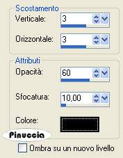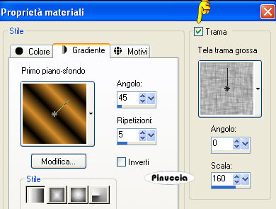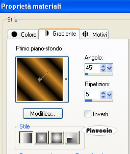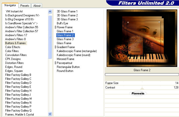 qui puoi trovare qualche risposta ai tuoi dubbi. Se l'argomento che ti interessa non è presente, ti prego di segnalarmelo. Questo tutorial è stato scritto in PSP X2, ma può essere eseguito anche con le altre versioni di PSP. Per tradurlo, l'ho eseguito con PSP X. Occorrente: Materiale: qui Filtri: Filters Unlimited 2.0 qui Apri tutto il materiale in PSP. Imposta il colore di primo piano con #d68b2d, e il colore di sfondo con il nero. 1. Apri il tube "Face Transparant~Carante~SF" e vai a Modifica>Copia. 2. Apri l'immagine di sfondo "Achtergrond" e vai a Modifica>Incolla come nuovo livello. Sposta il viso un po' più a destra.![]() Cambia la modalità di miscelatura di questo livello in Luminanza (Esistente). 3. Livelli>Unisci>Unisci tutto. Modifica>Copia. 4. Apri una nuova immagine nera 700 x 600 pixels. ![]() 5. Modifica>Incolla come nuovo livello. 6. Livelli>Duplica, e sposta la seconda immagine come nell'esempio.![]() 7. Effetti>Effetti 3D>sfalsa ombra. ![]() 8. Livelli>Duplica. 9. Immagine>Ridimensiona, all'85%, tutti i livelli non selezionato. 10. Effetti>Effetti 3D>Sfalsa ombra, con i settaggi precedenti. Ripeti l'Effetto Sfalsa ombra, cambiando verticale e orizzontale con 3. ![]() 11. Attiva il livello Copia di Raster 1. 12. Passa il colore di primo piano a Gradiente. ![]() 13. Livelli>Nuovo livello raster. Attiva lo strumento Pennello ,cerca e seleziona il pennello "Susan" e applicalo con il gradiente nell'angolo in basso a sinistra e nell'angolo in alto a destra. Cerca e seleziona il pennello "kitty832", e applicalo, sempre con il gradiente, nell'angolo in basso a sinistra. 14. Attiva il livello Copia(2) di Raster 1. 15. Apri sing_my_soul e vai a Modifica>Copia. Torna al tuo lavoro e vai a Modifica>Incolla come nuovo livello. Spostalo in basso.![]() 16. Apri mr_25_pearl, e vai a Modifica>Copia. Torna al tuo lavoro e vai a Modifica>Incolla come nuovo livello. Spostalo in un angolo dell'immagine.17. Livelli>Duplica, e spostalo nell'altro angolo.![]() 18. Livelli>Unisci>Unisci tutto. 19. Immagine>Aggiungi bordatura, 1 pixel, simmetriche, con il colore di primo piano. Immagine>Aggiungi bordatura, 25 pixels, simmetriche, con il colore nero. 20. Seleziona il bordo nero con la bacchetta magica ![]() 21. Imposta il colore di primo piano con il Gradiente, seleziona Trama - e imposta Tela trama grossa con i seguenti settaggi. ![]() 22. Riempi la selezione con questo gradiente+trama.23. Selezione>Deseleziona. 24. Effetti>Plugins>Filters Unlimited 2.0 - Buttons & Frames - Glass Frame 2. ![]() 25. Apri music_tekst_Vika, e vai a Modifica>Copia. Torna al tuo lavoro e vai a Modifica>Incolla come nuovo livello. Spostalo a destra.26. Aggiungi il tuo nome e/o il tuo watermark. 27. Livelli>Unisci>Unisci tutto e salva in formato jpg.