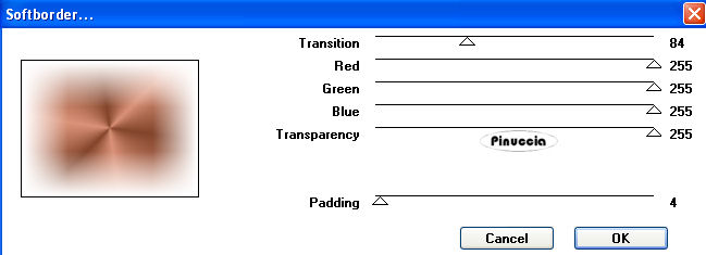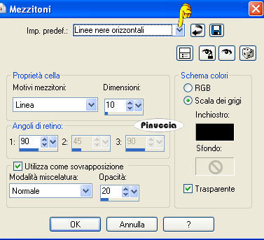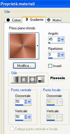 qui puoi trovare qualche risposta ai tuoi dubbi. Se l'argomento che ti interessa non è presente, ti prego di segnalarmelo. Questo tutorial è stato scritto in PSP X2, ma può essere eseguito anche con le altre versioni di PSP. Per tradurlo, l'ho eseguito con PSP X. Occorrente: materiale qui Filtri: VM Toolbox - Softborder qui Xero - Fritillary qui Metti il pennello nella cartella Pennelli e apri il resto del materiale in PSP. 1. Apri una nuova immagine bianca 650 x 600 pixels. ![]() Imposta il colore di primo piano con #db9379, e il colore di sfondo con #83452c. 2. Passa il colore di primo piano a Gradiente. ![]() 3. Livelli>Nuovo livello raster. Riempi il nuovo livello con il gradiente.4. Effetti>Plugins>VM Toolbox - Softborder. ![]() 5. Attiva lo strumento Pennello ![]() cerca e seleziona il pennello geometric04, e applicalo nell'angolo in alto a sinistra, cliccando con il tasto sinistro del mouse per usare il gradiente. 6. Apri Macha7_151209 e vai a Modifica>Copia. Torna al tuo lavoro e vai a Modifica>Incolla come nuovo livello. Spostalo a destra.7. Livelli>Unisci>Unisci tutto. 8. Immagine>Aggiungi bordatura, 1 pixel, simmetriche, con il colore nero. Immagine>Aggiungi bordatura, 25 pixels, simmetriche, con il colore bianco. 9. Seleziona il bordo bianco con la bacchetta magica ![]() 10. Imposta il colore di sfondo con il colore nero (automaticamente il colore del gradiente sarà più scuro). Riempi la selezione con il gradiente.11. Effetti>Plugins>Xero - Fritillary ![]() 12. Selezione>Deseleziona. 13. Immagine>Aggiungi bordatura, 1 pixel, simmetriche, con il colore nero. Immagine>Aggiungi bordatura, 50 pixels, simmetriche, con il colore bianco. 14. Seleziona il bordo bianco con la bacchetta magica ![]() Riempi la selezione con il gradiente.15. Effetti>Plugins>Xero - Fritillary, con i settaggi precedenti. 16. Effetti>Effetti artistici>Mezzitoni - selezoina il presente linee nere orizzontali e ok. ![]() 17. Selezione>Deseleziona. 18. Selezione>Seleziona tutto. Selezione>Modifica>Contrai - 50 pixels. 19. Effetti>Effetti 3D>sfalsa ombra. ![]() Ripeti l'Effetto Sfalsa ombra, cambiando verticale e orizzontale con -3. 20. Selezione>Deseleziona. 21. Immagine>Aggiungi bordatura, 1 pixel, simmetriche, con il colore nero. 22. Apri E&E-S-01172-tulip e vai a Modifica>copia. Torna al tuo lavoro e vai a Modifica>Incolla come nuovo livello. Spostalo nell'angolo in basso a sinistra.Cambia la modalità di miscelatura di questo livello in Luminanza (esistente). 23. Apri Swirl_Mystery_Sexy_Vika e vai a Modifica>copia. Torna al tuo lavoro e vai a Modifica>Incolla come nuovo livello. Spostalo nell'angolo in basso a destra.24. Apri harts e vai a Modifica>copia. Torna al tuo lavoro e vai a Modifica>Incolla come nuovo livello. Spostalo in basso.25. Apri wordart_Mystery_Sexy_Vika e vai a Modifica>copia. Torna al tuo lavoro e vai a Modifica>Incolla come nuovo livello. Spostalo a sinistra.16. Aggiungi il tuo nome e/o il tuo watermark. 17. Livelli>Unisci>Unisci tutto e salva in formato jpg.