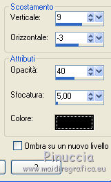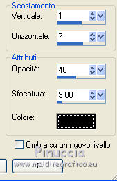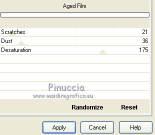 qui puoi trovare qualche risposta ai tuoi dubbi. Se l'argomento che ti interessa non è presente, ti prego di segnalarmelo. Questo tutorial è stato scritto in PSP X4, ma può essere eseguito anche con le altre versioni di PSP. Per tradurlo, l'ho eseguito con PSP X. Occorrente: Tube a scelta. Free Scrapset Nostalgic Moments & Arlene Nostalgic Moments (Cluster) http://smiekeltje.blogspot.nl/2010/03/my-freebies-of-february-2013.html qui, sotto Freebies/02/2013. Il resto del materiale qui Filtri Filters Unlimited 2.0 qui Metti la maschera nella cartella Maschere. 1. Apri una nuova immagine bianca 700 x 700 pixels. ![]() 2. Livelli>Nuovo livello raster. Selezione>Seleziona tutto. 3. Apri paper6 e vai a Modifica>Copia. Torna al tuo lavoro e vai a Modifica>Incolla nella selezione. Selezione>Deseleziona. 4. Livelli>Carica/Salva maschera>Carica maschera da disco. Cerca e carica la maschera 20.20. ![]() Livelli>Elimina e rispondi sì alla domanda unire la maschera nel livello corrente. ![]() Livelli>Unisci>Unisci gruppo. 5. Apri NM Cluster2. Immagine>Ridimensiona, 2 volte al 50%, tutti i livelli selezionato. Modifica>Copia. Torna al tuo lavoro e vai a Modifica>Incolla come nuovo livello. 6. Immagine>Ruota per gradi - 10 gradi a sinistra. ![]() Sposta il cluster in basso a sinistra.7. Effetti>Effetti 3D>Sfalsa ombra. ![]() 8. Apri il tuo tube e vai a Modifica>Copia. Torna al tuo lavoro e vai a Modifica>Incolla come nuovo livello. Spostalo un po' più a destra.9. Effetti>Effetti 3D>sfalsa ombra. ![]() Ripeti Effetti>Effetti 3D>Sfalsa ombra. ![]() 10. Attiva il livello Raster 1. Livelli>Duplica. Livelli>Sposta su. 11. Attiva lo strumento Gomma ![]() e cancella la parte di cornice che copre il tube. ![]() 12. Attiva il livello del tube (Raster 2). Cancella la parte di tube sotto la cornice![]() 13. Apri frame1. Immagine>Ridimensiona, 2 volte al 50%, tutti i livelli selezionato. Immagine>Capovolgi. Modifica>Copia. Torna al tuo lavoro e vai a Modifica>Incolla come nuovo livello. Sposta la cornice in basso a destra.Livelli>Disponi>Sposta giù. 14. Immagine>Ruota per gradi - 10 gradi a destra. ![]() 15. Effetti>Effetti 3D>Sfalsa ombra. ![]() 16. Attiva il livello Raster 1. Apri il tuo tube e vai a Modifica>Copia. Torna al tuo lavoro e vai a Modifica>Incolla come nuovo livello. Immagine>Rifletti. Sposta il viso nella cornice sinistra.Abbassa l'opacità di questo livello al 73%. 17. Effetti>Plugins>Filters Unlimited 2.0 - Special Effects 1 - Aged Film. ![]() 18. Attiva lo strumento Gomma ![]() e cancella la parte di tube esterna alla cornice. 19. Ripeti gli stessi passaggi nella cornice a destra. 20. Attiva il livello Gruppo raster 1. Apri element26. Immagine>Ridimensiona, 2 volte al 50%, tutti i livelli selezionato. Modifica>Copia. Torna al tuo lavoro e vai a Modifica>Incolla come nuovo livello. Sposta l'elemento in basso a destra.21. Attiva lo strumento Gomma ![]() e cancella eventuali tracce dell'elemento sul viso nella cornice. Abbassa l'opacità di questo livello al 75%. 22. Scegli dallo scrap gli elementi che preferisci per decorare il tuo lavoro. 23. Attiva il livello superiore. Apri wordart_nostalgic_Vika e vai a Modifica>Copia. Torna al tuo lavoro e vai a Modifica>Incolla come nuovo livello. Sposta il wordart in basso.24. Aggiungi il tuo nome e/o il tuo watermark su un nuovo livello. 25. Livelli>Unisci>Unisci tutto e salva in formato jpg. ![]() Se hai problemi o dubbi, o trovi un link non funzionante, o anche soltanto per un saluto, scrivimi.