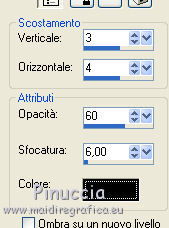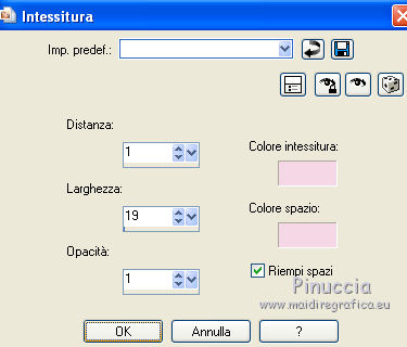 qui puoi trovare qualche risposta ai tuoi dubbi. Se l'argomento che ti interessa non è presente, ti prego di segnalarmelo. Questo tutorial è stato scritto in PSP X2, ma può essere eseguito anche con le altre versioni di PSP. Per tradurlo, l'ho eseguito con PSP X. Occorrente: Un tube a scelta. Il resto del materiale qui Gli elementi scrap sono di Addictive Pleasure , il template è di Sylly Creationz. 1. Apri template3-diamondCMsyllycreationz, che sarà la base del tuo lavoro. Elimina il livello superiore del watermark, e i livelli "leafz", "thinblack rectangle" e "glitter martini glass". 2. Apri e attiva il livello "background". 3. Immagine>Dimensione tela. ![]() Riempi il livello con il colore bianco.4. Apri background_party_girl_Vika e vai a Modifica>copia. Torna al tuo lavoro e vai a Modifica>Incolla come nuovo livello. 5. Apri flowertrail, e vai a Modifica>Copia. Torna al tuo lavoro e vai a Modifica>Incolla come nuovo livello. Sposta il tube in alto.6. Apri string3 e vai a Modifica>copia. Torna al tuo lavoro e vai a Modifica>Incolla come nuovo livello. 7. Livelli>Duplica. Immagine>Capovolgi. 8. Attiva il livello "pink rectangle". 9. Selezione>Seleziona tutto. Selezione>Mobile. Selezione>Immobilizza. 10. Apri p11, e vai a Modifica>copia. Torna al tuo lavoro e vai a Modifica>Incolla nella selezione. Selezione>Deseleziona. 11. Attiva il livello "pink circle". Selezione>Seleziona tutto. Selezione>Mobile. Selezione>Immobilizza. 12. Apri p8, e vai a Modifica>Copia. Torna al tuo lavoro e vai a Modifica>Incolla nella selezione. Selezione>Deseleziona. 13. Attiva il livello "small pink circle". Selezione>Seleziona tutto. Selezione>Mobile. Selezione>Immobilizza. 14. Riempi con il colore nero.15. Effetti>Effetti di trama>Intessitura, con un colore del tube. ![]() 16. Selezione>Deseleziona. 17. Attiva il livello superiore. 18. Apri ribbon, e vai a Modifica>copia. Torna al tuo lavoro e vai a Modifica>Incolla come nuovo livello. Sposta il nastro nell'angolo della cornice.19. Apri il tuo tube e vai a Modifica>copia. Torna al tuo lavoro e vai a Modifica>Incolla come nuovo livello. Sposta il tube a sinistra.20. Effetti>Effetti 3D>Sfalsa ombra. ![]() 21. Livelli>Duplica. 22. Immagine>Rifletti. Sposta il tube con il viso sulla cornice.23. Attiva il livello "gradient diamond". Selezione>Seleziona tutto. Selezione>Mobile. Selezione>Immobilizza. 24. Attiva il livello della copia del tube. Selezione>Inverti. Premi sulla tastiera il tasto CANC. 24. Selezione>Deseleziona. 25. Apri lipstik e vai a Modifica>copia. Torna al tuo lavoro e vai a Modifica>Incolla come nuovo livello. Spostalo in basso a destra.26. Apri diamonds, e vai a Modifica>copia. Torna al tuo lavoro e vai a Modifica>Incolla come nuovo livello. Sposta questo tube a sinistra.27. Livelli>Duplica. Immagine>Rifletti, e sistema sulla striscia nera a destra.28. Aggiungi il tuo nome e/o il tuo watermark su un nuovo livello, senza dimenticare eventuali copyright delle immagini usate. 35. Livelli>Unisci>Unisci tutto e salva in formato jpg. ![]() ![]()