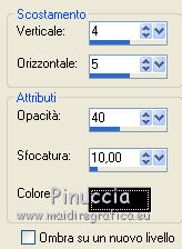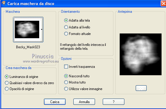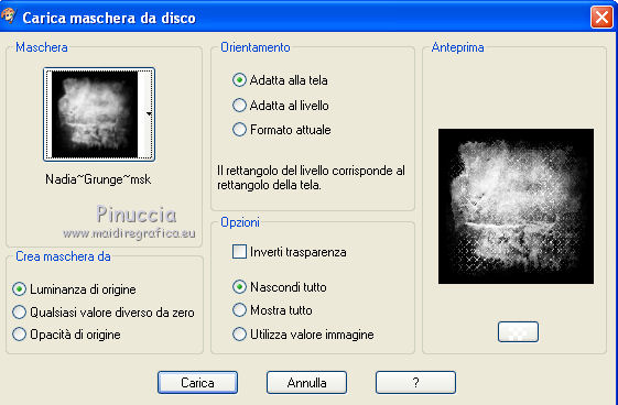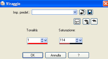 qui puoi trovare qualche risposta ai tuoi dubbi. Se l'argomento che ti interessa non è presente, ti prego di segnalarmelo. Questo tutorial è stato scritto in PSP X4, ma può essere eseguito anche con le altre versioni di PSP. Per tradurlo, l'ho eseguito con PSP X. Occorrente: Un tube a scelta (un tube con il relativo close-up, cioè l'ingrandimento del viso). La cornice è di Rachel Il resto del materiale qui Metti le maschere nella cartella Maschere. 1. Apri una nuova immagine bianca 650 x 650 pixels. ![]() 2. Apri il tuo close-up e vai a Modifica>Copia. Torna al tuo lavoro e vai a Modifica>Incolla come nuovo livello. Spostalo a destra.Abbassa l'opacità di questo livello al 30%. 3. Livelli>Carica/Salva maschera>Carica maschera da disco. Cerca e carica la maschera Becky_Mask023. ![]() Livelli>Elimina, e rispondi sì alla domanda Unire la maschera nel livello corrente. ![]() Livelli>Unisci>Unisci gruppo. 4. Apri il tuo tube e vai a Modifica>Copia. Torna al tuo lavoro e vai a Modifica>Incolla come nuovo livello. Immagine>Ridimensiona, se e quanto necessario. Spostalo in basso a sinistra.5. Livelli>Duplica. Spostalo in alto a destra.6. Livelli>Duplica. Immagine>Rifletti. Spostalo a sinistra.Livelli>Disponi>Sposta giù. Attiva il livello della prima copia, e abbassa l'opacità del livello al 55%. Dovresti avere qualcosa di simile. ![]() 7. Assicurati di essere posizionato sul livello superiore dei tre. Livelli>Unisci>Unisci giù - 2 volte. se vedi che l'immagine "sbiadisce", lascia visibili soltanto questi tre livelli e vai a Livelli>Unisci>Unisci visibile. 8. Livelli>Carica/Salva maschera>Carica maschera da disco. Cerca e carica la maschera Nadia-Grunde-msk. ![]() Livelli>Elimina, e rispondi sì alla domanda Unire la maschera nel livello corrente. ![]() Livelli>Unisci>Unisci gruppo. Abbassa l'opacità di questo livello al 65%. 9. Apri Frame4_ByRachel_SOE09. Attiva il livello della cornice. Immagine>Ridimensiona, 2 volte al 90%. Regola>Tonalità e saturazione>Viraggio. ![]() 10. Modifica>Copia. Torna al tuo lavoro e vai a Modifica>Incolla come nuovo livello. Sposta la cornice in alto.11. Apri voile e vai a Modifica>Copia. Torna al tuo lavoro e vai a Modifica>Incolla come nuovo livello. Posiziona correttamente la tenda, adattandola alla cornice.![]() 12. Livelli>Disponi>Sposta giù - 2 volte. 13. Attiva il livello Raster 1. 14. Apri il tuo tube e vai a Modifica>Copia. Torna al tuo lavoro e vai a Modifica>Incolla come nuovo livello. Spostalo al centro.15. Effetti>Effetti 3D>Sfalsa ombra. ![]() 16. Apri Rose e vai a Modifica>Copia. Torna al tuo lavoro e vai a Modifica>Incolla come nuovo livello. Sposta la rosa in basso a sinistra, sulla cornice.17. Apri Rose_duo e vai a Modifica>Copia. Torna al tuo lavoro e vai a Modifica>Incolla come nuovo livello. Sposta queste rose a destra, sulla cornice.![]() 18. Open bow e vai a Modifica>Copia. Torna al tuo lavoro e vai a Modifica>Incolla come nuovo livello. Spostalo sulla rosa a sinistra.19. Open wordart_perfect_like_roses e vai a Modifica>Copia. Torna al tuo lavoro e vai a Modifica>Incolla come nuovo livello. Sposta il testo in basso.20. Aggiungi il tuo nome e/o il tuo watermark su un nuovo livello. 21. Livelli>Unisci>Unisci tutto e salva in formato jpg. ![]() Se hai problemi o dubbi, o trovi un link non funzionante, o anche soltanto per un saluto, scrivimi.