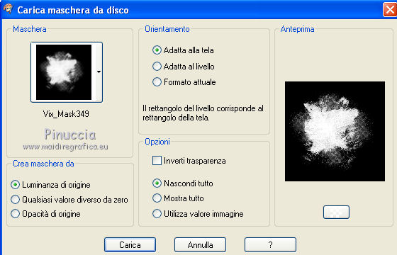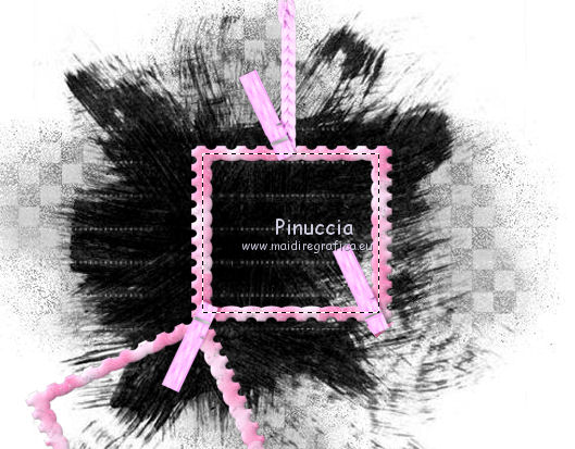 qui puoi trovare qualche risposta ai tuoi dubbi. Se l'argomento che ti interessa non è presente, ti prego di segnalarmelo. Questo tutorial è stato scritto in PSP X2, ma può essere eseguito anche con le altre versioni di PSP. Per tradurlo, l'ho eseguito con PSP X. Occorrente: Un tube a scelta. Il resto del materiale qui Per il mio esempio ho usato un poser ©Angie Il materiale scrap è di Bubbles Dream. La maschera è di Vix ![]() Metti la maschera nella cartella Maschere, e apri il resto del materiale in PSP. Imposta il colore di primo piano con il nero. 1. Apri una nuova immagine bianca 650 x 650 pixels. ![]() 2. Livelli>Nuovo livello raster. 3. Selezione>Seleziona tutto. 4. Apri Paper2 e vai a Modifica>Copia. Torna al tuo lavoro e vai a Modifica>Incolla nella selezione. 5. Livelli>Carica/Salva maschera>Carica maschera da disco. Cerca e carica la maschera Vix_mask349 con i seguenti settaggi. ![]() Livelli>Elimina e rispondi sì alla domanda Unire la maschera nel livello corrente. ![]() Livelli>Unisci>Unisci gruppo. 6. Selezione>Deseleziona. 7. Apri Frame4 e vai a Modifica>Copia. Torna al tuo lavoro e vai a Modifica>Incolla come nuovo livello. 8. Attiva lo strumento Gomma e cancella la cornice a destra.![]() 9. Livelli>Nuovo livello raster. 10. Attiva lo strumento Selezione , rettangolo,e seleziona la cornice superiore. ![]() 11. Riempi la selezione con il colore di primo piano.12. Selezione>Deseleziona. 13. Livelli>Disponi>Sposta giù. 14. Livelli>Duplica. 15. Immagine>Ruota per gradi - 25 gradi a sinistra. ![]() Sposta la selezione nella cornice inferiore.![]() 16. Livelli>Unisci>Unisci giù. 17. Apri il tuo tube. 18. Attiva lo strumento Selezione , rettangolo,e seleziona il viso del tube. 19. Modifica>Copia. Torna al tuo lavoro e vai a Modifica>Incolla come nuovo livello. Posiziona il viso nella cornice superiore.Se necessario, ridimensiona. 20. Livelli>Duplica. 21. Immagine>Ruota per gradi - 25 gradi a sinistra. Sposta il duplicato nella cornice inferiore.22. Livelli>Unisci>Unisci giù. 23. Cambia la modalità di miscelatura di questo livello in Luminanza (esistente). 24. Attiva il livello Raster 1. 25. Apri Flower2 e vai a Modifica>Copia. Torna al tuo lavoro e vai a Modifica>Incolla come nuovo livello. Spostalo sulla cornice.26. Attiva lo strumento Gomma ![]() e cancella la parte del nastro che non deve vedersi. ![]() Dovresti avere questo. ![]() 27. Apri DecoStar e vai a Modifica>Copia. Torna al tuo lavoro e vai a Modifica>Incolla come nuovo livello. Spostalo in basso.28. Apri Charm e vai a Modifica>copia. Torna al tuo lavoro e vai a Modifica>Incolla come nuovo livello. Sposta anche questo tube in basso - vedi il mio esempio.29. Apri il tuo tube e vai a Modifica>copia. Torna al tuo lavoro e vai a Modifica>Incolla come nuovo livello. Spostalo a destra.30. Effetti>Effetti 3D>Sfalsa ombra: ![]() 31. Apri il wordart e vai a Modifica>copia. Torna al tuo lavoro e vai a Modifica>Incolla come nuovo livello. Spostalo a sinistra.32. Aggiungi il tuo nome e/o il tuo watermark. 33. Livelli>Unisci>Unisci tutto e salva in formato jpg.