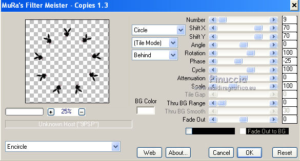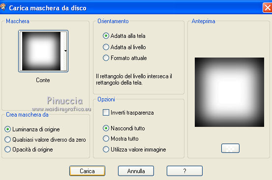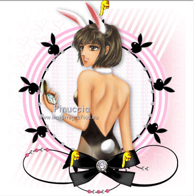 qui puoi trovare qualche risposta ai tuoi dubbi. Se l'argomento che ti interessa non è presente, ti prego di segnalarmelo. Questo tutorial è stato scritto in PSP X2, ma può essere eseguito anche con le altre versioni di PSP. Per tradurlo, l'ho eseguito con PSP X. Occorrente: Un tube a scelta. Il resto del materiale qui Per il mio esempio ho usato un tube ©Hase Filtri: Mura's Meister - Copies qui Imposta il colore di primo piano con il bianco, e il colore di sfondo con il nero. 1. Apri una nuova immagine bianca 650 x 650 pixels. ![]() 2. Apri Papier19 e vai a Modifica>Copia. Torna al tuo lavoro e vai a Modifica>Incolla come nuovo livello. 3. Livelli>Carica/salva maschera>Carica maschera da disco. Cerca e carica la maschera Conte. ![]() Livelli>Elimina e rispondi sì alla domanda Unire la maschera nel livello corrente. ![]() Livelli>Unisci>Unisci gruppo. 4. Ripeti il punto 3. 5. Apri frame_bunny e vai a Modifica>Copia. Torna al tuo lavoro e vai a Modifica>Incolla come nuovo livello. 6. Livelli>Nuovo livello raster. 7. Livelli>Disponi>Sposta giù. 8. Attiva lo strumento Selezione , cerchio,e traccia una selezione sulla cornice come nel mio esempio. ![]() 9. Riempi con il colore di primo piano.10. Apri Papier2 e vai a Modifica>Copia. Torna al tuo lavoro e vai a Modifica>Incolla come nuovo livello. 11. Selezione>Inverti. Premi sulla tastiera il tasto CANC. 12. Selezione>Deseleziona. 13. Abbassa l'opacità di questo livello al 30%. 14. Attiva il livello Raster 1. 15. Apri diamant_frame e vai a Modifica>Copia. Torna al tuo lavoro e vai a Modifica>Incolla come nuovo livello. 16. Apri bunny e vai a Modifica>Copia. Torna al tuo lavoro e vai a Modifica>Incolla come nuovo livello. 17. Effetti>Plugins>Mura's Meister - Copies. ![]() 18. Apri doodle_bunny e vai Modifica>Copia. Torna al tuo lavoro e vai a Modifica>Incolla come nuovo livello. Sposta l'elemento in basso.19. Apri il tuo tube e vai a Modifica>Copia. Torna al tuo lavoro e vai a Modifica>Incolla come nuovo livello. 20. Effetti>Effetti 3D>Sfalsa ombra: ![]() 21. Apri bow e vai a Modifica>Copia. Torna al tuo lavoro e vai a Modifica>Incolla come nuovo livello. Spostalo in basso.22. Attiva il livello Raster 5. Attiva lo strumento Gomma ![]() e cancella le tracce dei coniglietti sopra e sotto il tube. ![]() 24. Chiudi il colore di primo piano. 35. Attiva lo strumento Testo , font Aquarelle.![]() Scrivi "Play Bunny". 26. Livelli>Converti in livello raster. 27. Aggiungi il tuo nome e/o il tuo watermark su un nuovo livello. 28. Livelli>Unisci>Unisci tutto e salva in formato jpg.