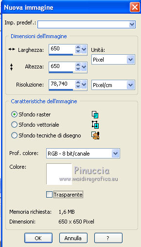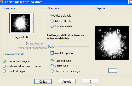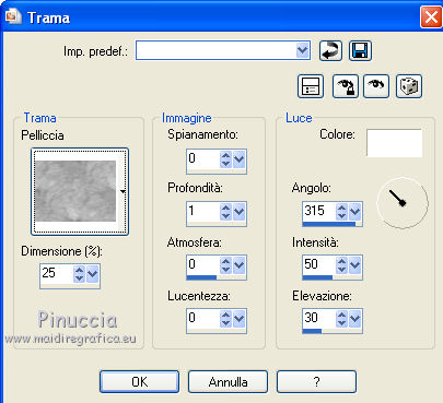 qui puoi trovare qualche risposta ai tuoi dubbi. Se l'argomento che ti interessa non è presente, ti prego di segnalarmelo. Questo tutorial è stato scritto in PSP X2, ma può essere eseguito anche con le altre versioni di PSP. Per tradurlo, l'ho eseguito con PSP X. Occorrente: Un tube a scelta. Lo scrapkit "Play bunny 2011" che trovi http://addictivepleasures.blogspot.com/search?updated-max=2011-04-16T11%3A12%3A00%2B01%3A00 qui Il resto del materiale qui Per il mio esempio ho usato un poser di Elisabeth Metti la maschera nella cartella Maschere. 1. Apri una nuova immagine bianca 650 x 650 pixels. ![]() 2. Dallo scrapkit apri p2 e vai a Modifica>Copia. Torna al tuo lavoro e vai a Modifica>Incolla come nuovo livello. 3. Livelli>Carica/salva maschera>Carica maschera da disco. Cerca e carica la maschera Vix_Mask363. ![]() Livelli>Elimina e rispondi sì alla domanda Unire la maschera nel livello corrente. ![]() Livelli>Unisci>Unisci gruppo. 4. Dallo scrapkit apri "star" e vai a Modifica>Copia. Torna al tuo lavoro e vai a Modifica>Incolla come nuovo livello. Sposta l'elemento a destra.5. Livelli>Duplica. Immagine>Rifletti. Sposta queste stelle in basso.6. Dallo scrapkit apri "wire" e vai a Modifica>Copia. Torna al tuo lavoro e vai a Modifica>Incolla come nuovo livello. Sposta la rete a sinistra.7. Dallo scrapkit apri "glitter" e vai a Modifica>Copia. Torna al tuo lavoro e vai a Modifica>Incolla come nuovo livello. 8. Dallo scrapkit apri "feathers" e vai a Modifica>Copia. Torna al tuo lavoro e vai a Modifica>Incolla come nuovo livello. Sposta l'elemento un po' più in basso.9. Livelli>Duplica. Immagine>Capovolgi. Livelli>Unisci>Unisci giù. ![]() 10. Effetti>Effetti di trama>Trama - seleziona la trama Pelliccia con i seguenti settaggi: ![]() 11. Dal materiale apri "doodle" e vai a Modifica>Copia. Torna al tuo lavoro e vai a Modifica>Incolla come nuovo livello. Spostalo in basso.![]() 12. Dallo scrapkit apri "frame" e vai a Modifica>Copia. Torna al tuo lavoro e vai a Modifica>Incolla come nuovo livello. 13. Immagine>Ridimensiona, al 75%, tutti i livelli non selezionato. 14. Attiva lo strumento Selezione a mano libera ![]() e traccia una selezione sulla cornice. ![]() 15. Dallo scrapkit apri p3 e vai a Modifica>Copia. Torna al tuo lavoro e vai a Modifica>Incolla come nuovo livello. Selezione>Inverti. Premi sulla tastiera il tasto CANC. Selezione>Deseleziona. 16. Livelli>Disponi>Sposta giù. 17. Attiva il livello superiore (raster 6). 18. Apri il tuo tube e vai a Modifica>Copia. Torna al tuo lavoro e vai a Modifica>Incolla come nuovo livello. Effetti>Effetti 3D>Sfalsa ombra: ![]() 19. Dal materiale apri "wordart" e vai a Modifica>Copia. Torna al tuo lavoro e vai a Modifica>Incolla come nuovo livello. Sposta il testo in basso.20. Aggiungi dallo scrapkit gli elementi che preferisci. 21. Aggiungi il tuo nome e/o il tuo watermark su un nuovo livello, senza dimenticare eventuali copyright delle immagini usate. 22. Livelli>Unisci>Unisci tutto e salva in formato jpg.