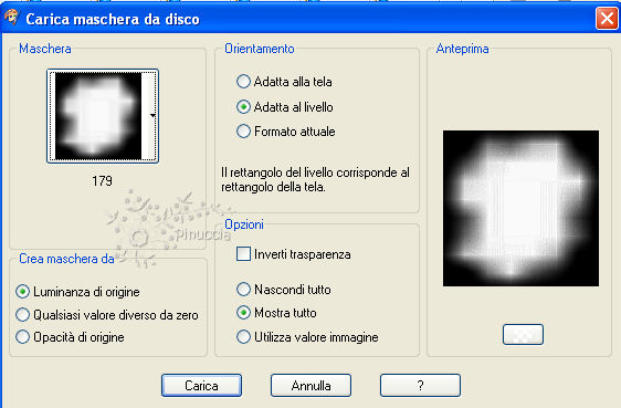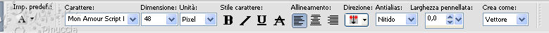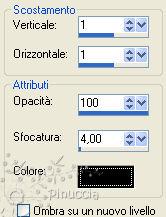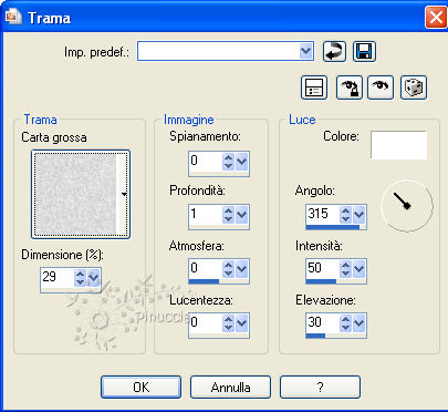 qui puoi trovare qualche risposta ai tuoi dubbi. Se l'argomento che ti interessa non è presente, ti prego di segnalarmelo. Questo tutorial è stato scritto in PSP X2, ma può essere eseguito anche con le altre versioni di PSP. Per tradurlo, l'ho eseguito con PSP X. Occorrente: Un tube a scelta. Il resto del materiale qui I tubes che ho usato per i miei esempi sono di Devilinside e Colombe. Metti le maschere nella cartella Maschere. Apri il font e minimizzalo. Lo troverai nella lista dei font disponibili, quando ti servirà. Apri il resto del materiale in PSP. Imposta il colore di primo piano con #5e0f37, e il colore di sfondo con #f8b0d5. 1. Apri una nuova immagine bianca 600 x 600 pixels. ![]() 2. Livelli>Nuovo livello raster. Riempi con il colore di sfondo (tasto destro del mouse).3. Livelli>Carica/Salva maschera>Carica maschera da disco. Cerca e carica la maschera 179: ![]() Livelli>elimina, e rispondi sì alla domanda Unire la maschera nel livello corrente. ![]() Livelli>Unisci>Unisci gruppo. 4. Livelli>Nuovo livello raster. Riempi con il colore di primo piano.5. Livelli>Carica/Salva maschera>Carica maschera da disco. Cerca e carica la maschera maskcameron139: ![]() Livelli>elimina, e rispondi sì alla domanda Unire la maschera nel livello corrente. ![]() Livelli>Unisci>Unisci gruppo. 6. Apri FM-Pretty in Pink-Element-50 e vai a Modifica>copia. Torna al tuo lavoro e vai a Modifica>Incolla come nuovo livello. Spostalo in basso a sinistra.7. Effetti>Effetti 3D>sfalsa ombra. ![]() 8. Apri Fm-Pretty in Pink-Element-45 e vai a Modifica>copia. Torna al tuo lavoro e vai a Modifica>Incolla come nuovo livello. Sposta anche questo elemento in basso a sinistra.9. Apri Fm-Pretty in Pink-Element-62 e vai a Modifica>copia. Torna al tuo lavoro e vai a Modifica>Incolla come nuovo livello. 10. Effetti>Effetti 3D>sfalsa ombra, con i settaggi precedenti. ![]() Sposta la seconda maschera un po' più in basso.![]() 11. Livelli>Nuovo livello raster. 12. Attiva lo strumento Selezione , rettangolo,e seleziona la cornice. ![]() 14. Effetti>Effetti di trama>Trama - seleziona la trama Carta grossa con i seguenti settaggi. ![]() 15. Selezione>Deseleziona. 16. Livelli>Disponi>Sposta giù. 17. Apri il tuo tube e vai a Modifica>Copia. Torna al tuo lavoro e vai a Modifica>Incolla come nuovo livello. Immagine>Ridimensiona, se e quanto necessario. 18. Apri Pretty_in_Pink_wordart-Vika e vai a Modifica>Copia. Torna al tuo lavoro e vai a Modifica>Incolla come nuovo livello. Spostalo a destra della cornice.19. Controlla che tutti gli elementi siano posizionati correttamente. 20. Attiva il livello superiore (Raster 3). 21. Chiudi il colore di primo piano. 22. Attiva lo strumento Testo e seleziona il font Mon Amour Script Pro con i seguenti settaggi.![]() Scrivi il tuo testo e posizionalo. 23. Livelli>Converti in livello raster. 24. Effetti>Effetti 3D>Sfalsa ombra: ![]() 25. Aggiungi il tuo nome e/o il tuo watermark. 26. Livelli>Unisci>Unisci tutto e salva in formato jpg. ![]()