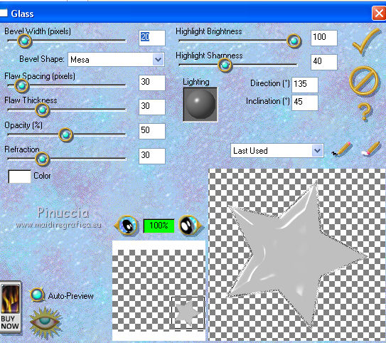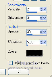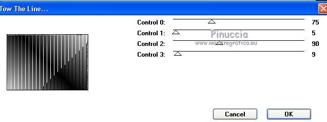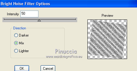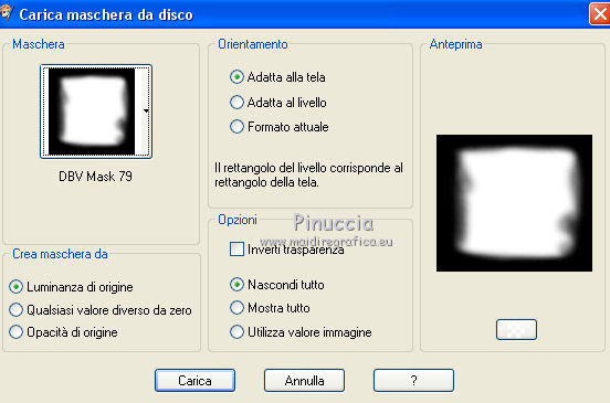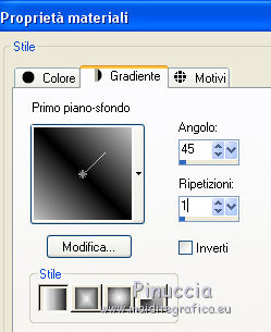 qui puoi trovare qualche risposta ai tuoi dubbi. Se l'argomento che ti interessa non è presente, ti prego di segnalarmelo. Questo tutorial è stato scritto in PSP X4, ma può essere eseguito anche con le altre versioni di PSP. Per tradurlo, l'ho eseguito con PSP X. Occorrente: Tube a scelta. Template http://dangerouslydeliciousdesignz.blogspot.ca/search/label/TEMPLATES qui Maschera http://designsbyvaybs.blogspot.it/search/label/Masks qui Il resto del materiale qui Il tube è di Lamanouche. Filtri DSB Flux - Bright Noise qui Penta.com - Jeans qui Tramages - Tow the line qui Eye Candy 3.1 - Glass qui Metti la maschera nella cartella Maschere. 1. Passa il colore di primo piano a Motivi e seleziona il motivo Zilver, con i seguenti settaggi. ![]() Imposta il colore di sfondo con il colore nero. 2. Apri DD_Template_2_Shine. Chiudi i livelli info, dotted square, dotted circle e rust rectangle. 3. Attiva il livello "teal square". Selezione>Seleziona tutto. Selezione>Mobile. Selezione>Immobilizza. 4. Livelli>Nuovo livello raster. Riempi con il motivo argento.5. Effetti>Plugins>DSB Flux - Bright Noise. ![]() 6. Regola>Messa a fuoco>Metti a fuoco. Selezione>Modifica>Contrai - 3 pixels. Riempi la selezione con il colore nero.7. Effetti>Plugins>Penta.com - Jeans. ![]() Selezione>Deseleziona. 8. Effetti>Effetti 3D>Sfalsa ombra, colore nero. ![]() 8. Attiva il livello "rust rectangle". Sposta il rettangolo un po' più a destra.9. Selezione>Seleziona tutto. Selezione>Mobile. Selezione>Immobilizza. 10. Livelli>Nuovo livello raster. Riempi con il motivo argento.11. Effetti>Plugins>DSB Flux - Bright Noise. ![]() 12. Regola>Messa a fuoco>Metti a fuoco. Selezione>Modifica>Contrai - 3 pixels. 13. Imposta il colore di primo piano con il colore #c0c0c0. Il colore di sfondo è sempre il colore nero. Passa il colore di primo piano a Gradiente, stile lineare. ![]() Riempi la selezione con il gradiente.14. Effetti>Plugins>Tramages - Tow the line. ![]() Selezione>Deseleziona. 15. Effetti>Effetti 3D>Sfalsa ombra, con i settaggi precedenti. 16. Attiva il livello "brown square". Selezione>Seleziona tutto. Selezione>Mobile. Selezione>Immobilizza. 17. Livelli>Nuovo livello raster. Riporta il colore di primo piano al motivo argento. d'ora in poi non lo scriverò più. Assicurati, prima di riempire, che sia selezionato il colore o il gradiente o il motivo richiesti Riempi con il motivo argento.18. Effetti>Plugins>DSB Flux - Bright Noise. ![]() 19. Regola>Messa a fuoco>Metti a fuoco. Selezione>Modifica>Contrai - 3 pixels. Cambia i settaggi del gradiente. ![]() Riempi la selezione con il gradiente.20. Effetti>Effetti di trama>Manto. ![]() Selezione>Deseleziona. 21. Effetti>Effetti 3D>Sfalsa ombra, con i settaggi precedenti. 22. Attiva il livello "grey square". Selezione>Seleziona tutto. Selezione>Mobile. Selezione>Immobilizza. 23. Livelli>Nuovo livello raster. Riempi con il motivo argento.24. Effetti>Plugins>DSB Flux - Bright Noise. ![]() 25. Regola>Messa a fuoco>Metti a fuoco. Selezione>Modifica>Contrai - 3 pixels. Riempi con il colore nero.26. Apri il tuo tube e vai a Modifica>Copia. Torna al tuo lavoro e vai a Modifica>Incolla come nuovo livello. Immagine>Ridimensiona, se e quanto necessario, tutti i livelli non selezionato. Posiziona il tube con il viso nel rettangolo.Selezione>Inverti. Premi sulla tastiera il tasto CANC. Selezione>Deseleziona. Cambia la modalità di miscelatura di questo livello in Luminanza (esistente). 27. Attiva il livello "white circle". Effetti>Effetti 3D>Sfalsa ombra, colore nero. ![]() Di nuovo Effetti>Effetti 3D>Sfalsa ombra, colore nero. ![]() 28. Attiva il livello "creme circle". Selezione>Seleziona tutto. Selezione>Mobile. Selezione>Immobilizza. Livelli>Nuovo livello raster. Riempi con il colore nero.29. Apri il tuo tube e vai a Modifica>Copia. Torna al tuo lavoro e vai a Modifica>Incolla come nuovo livello. Immagine>Ridimensiona, se e quanto necessario, tutti i livelli non selezionato. Posiziona il tube nel cerchio.Selezione>Inverti. Premi sulla tastiera il tasto CANC. Cambia la modalità di miscelatura di questo livello in Luminanza (Esistente). Selezione>Deseleziona. 30. Attiva il livello "grey star". Immagine>Ridimensiona, al 60%, tutti i livelli non selezionato. Sposta la stella in basso a destra.31. Selezione>Seleziona tutto. Selezione>Mobile. Selezione>Immobilizza. Riempi la selezione con il motivo argento.32. Effetti>Plugins>DSB Flux - Bright Noise. ![]() Regola>Messa a fuoco>Metti a fuoco. Selezione>Modifica>Contrai - 3 pixels. Riempi con il colore di primo piano #c0c0c0.33. Effetti>Plugins>Eye Candy 3.1 - Glass. ![]() Selezione>Deseleziona. 34. Effetti>Effetti 3D>Sfalsa ombra, colore nero. ![]() 35. Attiva il livello "dotted star". Immagine>Ridimensiona, al 60%, tutti i livelli non selezionato. Spostalo in basso a destra.36. Attiva il livello "shine teal". Selezione>Seleziona tutto. Selezione>Mobile. Selezione>Immobilizza. Riempi le lettere con il motivo argento.37. Effetti>Plugins>DSB Flux - Bright Noise. ![]() egola>Messa a fuoco>Metti a fuoco. Selezione>Deseleziona. 38. Attiva il livello "shine white". Effetti>Effetti 3D>Sfalsa ombra, con i settaggi precedenti. 39. Attiva il livello inferiore "bg". Livelli>Nuovo livello raster. Riempi con il motivo argento.40. Livelli>Carica/Salva maschera>Carica maschera da disco. Cerca e carica la maschera DBV Mask 79. ![]() Livelli>Elimina e rispondi sì alla domanda unire la maschera nel livello corrente. ![]() Livelli>Unisci>Unisci gruppo. 41. Attiva il livello superiore. 42. Copia e incolla come nuovo livello gli elementi "strik", button" e "glitter" e posizionali a tuo piacimento,o vedi il mio esempio. 43. Aggiungi il tuo nome e/o il tuo watermark su un nuovo livello. 44. Livelli>Unisci>Unisci tutto e salva in formato jpg. ![]() Se hai problemi o dubbi, o trovi un link non funzionante, o anche soltanto per un saluto, scrivimi.