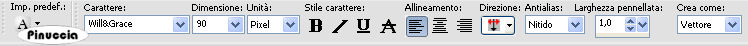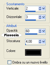 qui puoi trovare qualche risposta ai tuoi dubbi. Se l'argomento che ti interessa non è presente, ti prego di segnalarmelo. Questo tutorial è stato scritto in PSP X2, ma può essere eseguito anche con le altre versioni di PSP. Per tradurlo, l'ho eseguito con PSP X. Occorrente: Materiale qui Metti la maschera nella cartella Maschere. Apri il font e minimizzalo nella tua area di lavoro. Lo troverai nella lista dei font disponibili quando ti servirà. Imposta il colore di primo piano con il bianco, e il colore di sfondo con #f4bed9. 1. Apri una nuova immagine bianca 600 x 600 pixels. ![]() 2. Livelli>Nuovo livello raster. Riempi con il colore di sfondo.3. Livelli>Carica/Salva maschera>Carica maschera da disco. Cerca e carica la maschera Becky-Mask042: ![]() Livelli>Elimina e rispondi sì alla domanda Unire la maschera nel livello corrente. ![]() Livelli>Unisci>Unisci gruppo. 4. Apri background_softly e vai a Modifica>Copia. Torna al tuo lavoro e vai a Modifica>Incolla come nuovo livello. Spostalo a destra.5. Apri guirlande e vai a Modifica>Copia. Torna al tuo lavoro e vai a Modifica>Incolla come nuovo livello. Sposta la ghirlanda a sinistra.6. Apri frame_01, e vai a Modifica>Copia. Torna al tuo lavoro e vai a Modifica>Incolla come nuovo livello. 7. Apri tsgina00532 e vai a Modifica>Copia. Torna al tuo lavoro e vai a Modifica>Incolla come nuovo livello. 8. Regola>Tonalità e Saturazione>Viraggio: ![]() 9. Attiva lo strumento Gomma ![]() e cancella la parte del tube che esce dalla cornice. ![]() 10. Apri flowers e vai a Modifica>Copia. Torna al tuo lavoro e vai a Modifica>Incolla come nuovo livello. Spostalo in basso.11. Apri large_bow e vai a Modifica>Copia. Torna al tuo lavoro e vai a Modifica>Incolla come nuovo livello. Spostalo in basso a sinistra.![]() 12. Apri mini_bow e vai a Modifica>Copia. Torna al tuo lavoro e vai a Modifica>Incolla come nuovo livello. 13. Livelli>Duplica, 2 volte, e sistema i fiocchi sulla cornice (vedi il mio esempio). 14. Attiva lo strumento Testo , font Will&Grace, con i seguenti settaggi:![]() Scrivi Softly". 15. Livelli>Converti in livello raster. 16. Effetti>Effetti 3D>Sfalsa ombra: ![]() 17. Aggiungi il tuo nome e/o il tuo watermark. 18. Livelli>Unisci>Unisci tutto e salva in formato jpg. Se hai problemi o dubbi, o trovi un link non funzionante, o anche soltanto per un saluto, scrivimi 28 Gennaio 2009 |
