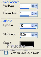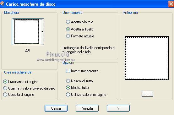 qui puoi trovare qualche risposta ai tuoi dubbi. Se l'argomento che ti interessa non è presente, ti prego di segnalarmelo. Questo tutorial è stato scritto in PSP X2, ma può essere eseguito anche con le altre versioni di PSP. Per tradurlo, l'ho eseguito con PSP X. Occorrente: Un tube a scelta. Il resto del materiale qui Il materiale scrap è di Ali Designs ![]() Metti la maschera nella cartella Maschere, e apri il resto del materiale in PSP. 1. Apri una nuova immagine bianca 650 x 650 pixels. 2. Apri "background" e vai a Modifica>Copia. Torna al tuo lavoro e vai a Modifica>Incolla come nuovo livello. 3. Apri "DBA_Feathers1" e vai a Modifica>Copia. Torna al tuo lavoro e vai a Modifica>Incolla come nuovo livello. 4. Apri "DBS_Diamond_frame11" e vai a Modifica>Copia. Torna al tuo lavoro e vai a Modifica>Incolla come nuovo livello. 5. Apri "DBA_Cluster_frame1" e vai a Modifica>Copia. Torna al tuo lavoro e vai a Modifica>Incolla come nuovo livello. 6. Apri "lines" e vai a Modifica>Copia. Torna al tuo lavoro e vai a Modifica>Incolla come nuovo livello. Sposta le linee in basso.![]() 7. Apri il tuo tube e vai a Modifica>Copia. Torna al tuo lavoro e vai a Modifica>Incolla come nuovo livello. Spostalo in basso a destra.8. Effetti>Effetti 3D>Sfalsa ombra: ![]() 9. Duplica il lavoro usando la combinazione maiuscola+D e minimizza l'originale. 10. Continua sulla copia. Livelli>Unisci>Unisci tutto. 11. Livelli>Carica/Salva maschera>Carica maschera da disco. Cerca e carica la maschera "201", con i seguenti settaggi. ![]() Livelli>Elimina e rispondi sì alla domanda Unire la maschera nel livello corrente. ![]() Livelli>Unisci>Unisci gruppo. 12. Immagine>Ridimensiona, al 50%, tutti i livelli selezionato. 13. Modifica>Copia. Attiva il tuo lavoro originale e vai a Modifica>Incolla come nuovo livello. 14. Effetti>Effetti 3D>Sfalsa ombra: ![]() 15. Immagine>Rifletti. 16. Immagine>Ruota per gradi - 10 gradi a sinistra. ![]() Sposta l'immagine nell'angolo in alto a sinistra.17. Livelli>Disponi>Sposta giù e ripeti 2 volte. 18. Aggiungi il tuo nome e/o il tuo watermark. 19. Livelli>Unisci>Unisci tutto e salva in formato jpg.