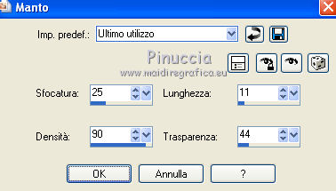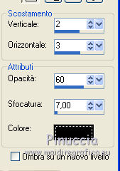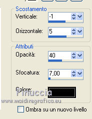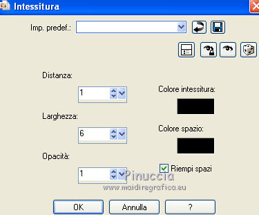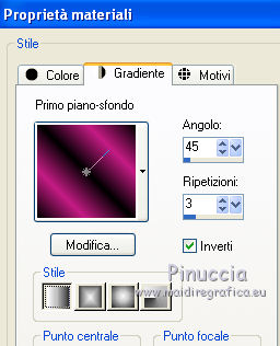 qui puoi trovare qualche risposta ai tuoi dubbi. Se l'argomento che ti interessa non è presente, ti prego di segnalarmelo. Questo tutorial è stato scritto in PSP X4, ma può essere eseguito anche con le altre versioni di PSP. Per tradurlo, l'ho eseguito con PSP X. Occorrente: Un tube a scelta (un tube con il relativo close-up, cioè l'ingrandimento del viso). Per il mio esempio ho usato tubes di Syl . Il resto del materiale qui Imposta il colore di primo piano con #c51c84. e il colore di sfondo con #e4d3d0 1. Apri template_Vika, che sarà la base del tuo lavoro. Attiva il livello "cirkel1". 2. Selezione>Seleziona tutto. Selezione>Mobile. Selezione>Immobilizza. 3. Riempi con il colore di primo piano.Selezione>Deseleziona. 4. Effetti>Effetti di trama>Manto. ![]() 5. Abbassa l'opacità di questo livello al 55%. 6. Effetti>Effetti di trama>Intessitura. ![]() 7. Apri glitters, e vai a Modifica>Copia. Torna al tuo lavoro e vai a Modifica>Incolla come nuovo livello. 8. Apri bling_doodle, e vai a Modifica>Copia. Torna al tuo lavoro e vai a Modifica>Incolla come nuovo livello. 9. Attiva il livello "cirkel3". 10. Selezione>Seleziona tutto. Selezione>Mobile. Selezione>Immobilizza. 11. Apri Paper, e vai a Modifica>Copia. Torna al tuo lavoro e vai a Modifica>Incolla come nuovo livello. Selezione>Inverti. Premi sulla tastiera il tasto CANC. Selezione>Deseleziona. Abbassa l'opacità di questo livello al 40%. 12. Puoi eliminare il livello "cirkel3". 13. Passa il colore di primo piano a Gradiente Lineare. ![]() 14. Attiva il livello "cirkel4". Selezione>Seleziona tutto. Selezione>Mobile. Selezione>Immobilizza. 15. Livelli>Nuovo livello raster. Riempi con il gradiente.Selezione>Deseleziona. 16. Puoi eliminare il livello "cirkel4". 17. Apri sparkles e vai a Modifica>Copia. Torna al tuo lavoro e vai a Modifica>Incolla come nuovo livello. 18. Apri il tuo close-up o seleziona il viso del tuo tube.Modifica>Copia. Torna al tuo lavoro e vai a Modifica>Incolla come nuovo livello. Sposta il tube a sinistra.19. Livelli>Duplica. Immagine>Rifletti. Sposta questo tube a destra.Livelli>Unisci>Unisci giù. 20. Attiva il livello "cirkel2". Selezione>Seleziona tutto. Selezione>Mobile. Selezione>Immobilizza. 21. Attiva il livello superiore (raster 6: il livello dei close-up). Selezione>Inverti. Premi sulla tastiera il tasto CANC. Selezione>Deseleziona. 22. Cambia la modalità di miscelatura di questo livello in Luminanza (esistente), e abbassa l'opacità al 36%. 23. Attiva il livello "cirkel2". Effetti>Effetti di trama>Manto, con i settaggi precedenti. 24. Apri ribbon, e vai a Modifica>Copia. Torna al tuo lavoro e vai a Modifica>Incolla come nuovo livello. Sposta il nastro in basso.25. Effetti>Effetti 3D>Sfalsa ombra. ![]() 26. Apri bow, e vai a Modifica>Copia. Torna al tuo lavoro e vai a Modifica>Incolla come nuovo livello. Spostalo a destra.27. Effetti>Effetti 3D>Sfalsa ombra, con i settaggi precedenti. 28. Apri il tuo tube e vai a Modifica>Copia. Torna al tuo lavoro e vai a Modifica>Incolla come nuovo livello. 29. Effetti>Effetti 3D>Sfalsa ombra. ![]() 30. Apri bow, e vai a Modifica>Copia. Torna al tuo lavoro e vai a Modifica>Incolla come nuovo livello. Spostalo in basso a destra.31. Aggiungi il tuo nome e/o il tuo watermark su un nuovo livello. 32. Livelli>Unisci>Unisci tutto e salva in formato jpg. ![]() Se hai problemi o dubbi, o trovi un link non funzionante, o anche soltanto per un saluto, scrivimi.