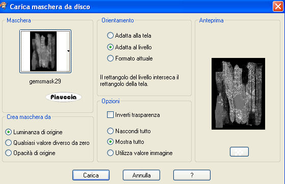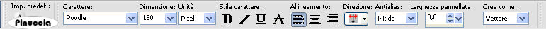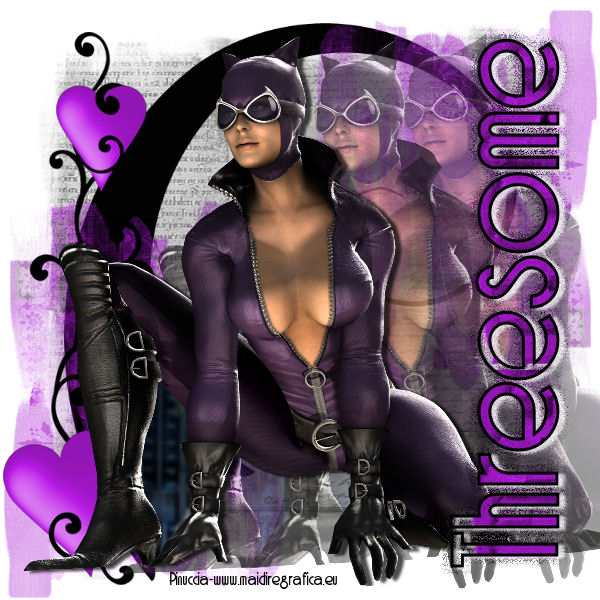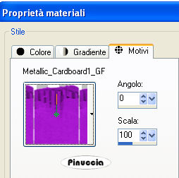 qui puoi trovare qualche risposta ai tuoi dubbi. Se l'argomento che ti interessa non è presente, ti prego di segnalarmelo. Questo tutorial è stato scritto in PSP X2, ma può essere eseguito anche con le altre versioni di PSP. Per tradurlo, l'ho eseguito con PSP X. Occorrente: Un tube a scelta. Il resto del materiale qui Gli elementi scrap sono di GraphicsFunHouse I tubes usati per i miei esempi sono di Alejandra Rosales e Guismo. Filtri: Toadies - Blast'n Blur qui Metti le maschere nella cartella Maschere, e apri il resto del materiale in PSP (compreso il font che, minimizzato, troverai nell'elenco dei font disponibili, quando ti servirà). Imposta il colore di primo piano il nero. 1. Apri una nuova immagine bianca 600 x 600 pixels. ![]() 2. Selezione>Seleziona tutto. 3. Livelli>Nuovo livello raster. 4. Apri Metallic_BG6_GF e vai a Modifica>Copia. Torna al tuo lavoro e vai a Modifica>Incolla nella selezione. Selezione>Deseleziona. 5. Livelli>Carica/Salva maschera>Carica maschera da disco. Cerca e carica la maschera gemsmask26: ![]() Livelli>elimina, e rispondi sì alla domanda Unire la maschera nel livello corrente. ![]() Livelli>Unisci>Unisci gruppo. 6. Apri doodle-threesome-Vika e vai a Modifica>copia. Torna al tuo lavoro e vai a Modifica>Incolla come nuovo livello. Spostalo un po' più a sinistra.7. Apri Metallic_Cardboard1_GF e vai a Modifica>copia. non chiudere il tube perchè ti servirà dopo Torna al tuo lavoro e vai a Modifica>Incolla come nuovo livello. 8. Livelli>Carica/Salva maschera>Carica maschera da disco. Cerca e carica la maschera gemsmask29: ![]() Livelli>elimina, e rispondi sì alla domanda Unire la maschera nel livello corrente. ![]() Livelli>Unisci>Unisci gruppo. 10. Livelli>Duplica. Immagine>Rifletti. Immagine>Capovolgi. 11. Apri Metallic_Doodle1_GF e vai a Modifica>copia. Torna al tuo lavoro e vai a Modifica>Incolla come nuovo livello. Spostalo a sinistra.12. Apri il tuo tube e vai a Modifica>copia. Torna al tuo lavoro e vai a Modifica>Incolla come nuovo livello. Spostalo a destra.13. Livelli>Duplica, e sposta questo tube al centro.14. Livelli>Duplica, e sposta questo tube a sinistra.15. Rimani posizionato sul livello della seconda copia. Effetti>Effetti 3D>Sfalsa ombra: ![]() Abbassa l'opacità del livello Raster 3 (il tube originale) al 40%. Abbassa l'opacità del livello copia di Raster 3 al 60%. 16. Passa il colore di sfondo a Motivi. Apri il menu e, tra i motivi disponibili, vedrai anche la lista dei files aperti, tra questi l'immagine Metallic>Cardboard1_GF. Selezionala con i seguenti settaggi. ![]() 17. Attiva lo strumento Testo , font Poodle:![]() Scrivi "Threesome" o quello che preferisci. 18. Livelli>Converti in livello raster. 19. Immagine>Ruota per gradi - 90 gradi a sinistra. ![]() Sposta il testo a destra.20. Effetti>Effetti 3D>Sfalsa ombra. ![]() 21. Livelli>Duplica, e attiva il livello sottostante del testo originale. 22. Effetti>Plugins>Toadies - Blast'n Blur. ![]() 23. Aggiungi il tuo nome e/o il tuo watermark. 24. Livelli>Unisci>Unisci tutto e salva in formato jpg. ![]()