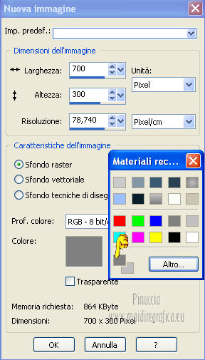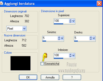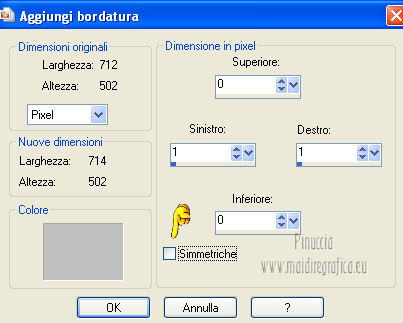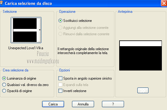 qui puoi trovare qualche risposta ai tuoi dubbi. Se l'argomento che ti interessa non è presente, ti prego di segnalarmelo. Questo tutorial è stato scritto in PSP X4, ma può essere eseguito anche con le altre versioni di PSP. Per tradurlo, l'ho eseguito con PSP X. Occorrente: Un'immagine o un tube a scelta. Per il mio esempio ho usato un'immagine di http://lady-symphonia.deviantart.com/ Lady Symphonia, usato con il permesso di http://www.board-4you.com/v60/boards/286/index.php?sid= Graphixfun by A&B . Il resto del materiale qui Metti il pennello nella cartella pennelli. Attenzione, il pennello è composto da due files che non devono essere separati. Vedi gli appunti sui Pennelli qui Metti le selezioni nella cartella Selezioni. Apri la tua immagine, che deve essere di 700 x 300 pixels. Imposta il colore di primo piano con #808080, e il colore di sfondo con #c0c0c0. 1. Apri una nuova immagine colore di primo piano 700 x 300 pixels. ![]() Apri la tua immagine e vai a Modifica>Copia. Torna al tuo lavoro e vai a Modifica>Incolla come nuovo livello. Cambia la modalità di miscelatura di questo livello in luminanza (esistente). 2. Immagine>Aggiungi bordatura, 1 pixel, simmetriche, con il colore di sfondo. 3. Immagine>Aggiungi bordatura, simmetriche non selezionato, con il colore nero. ![]() 4. Immagine>Aggiungi bordatura, simmetriche non selezionato, con il colore di sfondo. ![]() 5. Livelli>Nuovo livello raster. Selezione>Carica/Salva selezione>Carica selezione da disco. Cerca e carica la selezione Unexpected Love1-Vika. ![]() Riempi la selezione con il colore di sfondo.6. Selezione>Modifica>Contrai - 1 pixel. Premi sulla tastiera il tasto CANC. Riempi la selezione con il colore di primo piano.Abbassa l'opacità di questo livello al 20%. 7. Mantieni selezionato. Livelli>Nuovo livello raster. Attiva lo strumento Pennello ![]() cerca e seleziona il pennello kitty 835, e applicalo cliccando con il tasto sinistro del mouse per usare il colore di primo piano. Abbassa l'opacità di questo livello al 20%. Selezione>Deseleziona. 8. Chiudi il livello di sfondo, e rimani posizionato sul livello superiore. Livelli>Unisci>Unisci visibile. Riapri il livello di sfondo, rimanendo sempre posizionato sul livello superiore. Livelli>Duplica. Immagine>Rifletti. Sposta nel bordo inferiore.9. Livelli>Unisci>Unisci tutto. 10. Livelli>Nuovo livello raster. Selezione>Carica/Salva selezione>Carica selezione da disco. Cerca e carica la selezione Unexpected Love2-Vika. ![]() Riempi la selezione con il colore di sfondo.11. Selezione>Modifica>Contrai - 1 pixel. Premi sulla tastiera il tasto CANC. Riempi la selezione con il colore di primo piano.Abbassa l'opacità di questo livello al 30%. Selezione>Deseleziona. 12. Apri il tube love..love..love, e vai a Modifica>Copia. Torna al tuo lavoro e vai a Modifica>Incolla come nuovo livello. Immagine>Ruota per gradi - 90 gradi a sinistra. ![]() Posiziona il testo sulla striscia a sinistra.13. Livelli>Unisci>Unisci tutto. 14. Immagine>Aggiungi bordatura, 50 pixels, simmetriche, con il colore nero. 15. Apri Unexpected_Love_wordart_Vika, e vai a Modifica>Copia. Torna al tuo lavoro e vai a Modifica>Incolla come nuovo livello. 16. Livelli>Unisci>Unisci tutto. Immagine>Aggiungi bordatura, 1 pixel, simmetriche, con il colore di sfondo. 17. Aggiungi il tuo nome e/o il tuo watermark su un nuovo livello. 18. Livelli>Unisci>Unisci tutto e salva in formato jpg. ![]() Se hai problemi o dubbi, o trovi un link non funzionante, o anche soltanto per un saluto, scrivimi.