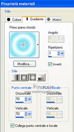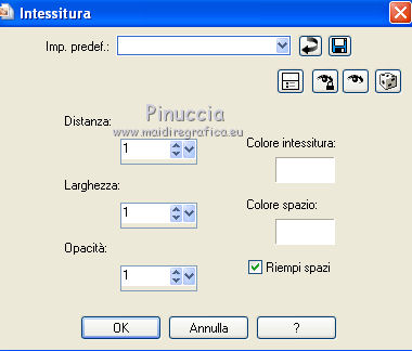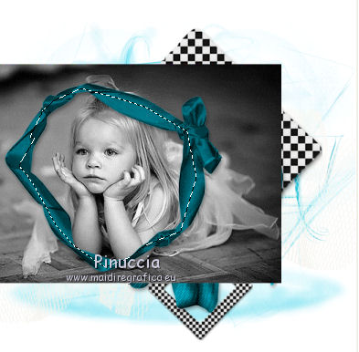 qui puoi trovare qualche risposta ai tuoi dubbi. Se l'argomento che ti interessa non è presente, ti prego di segnalarmelo. Questo tutorial è stato scritto in PSP X2, ma può essere eseguito anche con le altre versioni di PSP. Per tradurlo, l'ho eseguito con PSP X. Occorrente: Materiale qui Filtri. Xero - Porcelain qui Metti la maschera nella cartella Maschere. Imposta il colore di primo piano con #74dfef, e il colore di sfondo con il bianco. 1. Apri una nuova immagine bianca 650 x 650 pixels. ![]() 2. Passa il colore di primo piano a Gradiente, con i seguenti settaggi. ![]() 3. Livelli>Nuovo livello raster. Riempi con il gradiente.4. Livelli>Carica/salva maschera>Carica maschera da disco. Cerca e carica la maschera Pbs-Mask5. ![]() Livelli>Elimina e rispondi sì alla domanda Unire la maschera nel livello corrente. ![]() Livelli>Unisci>Unisci gruppo. 5. Effetti>Effetti di trama>Intessitura. ![]() 6. Apri Abstractlines e vai a Modifica>Copia. Torna al tuo lavoro e vai a Modifica>Incolla come nuovo livello. 7. Apri "shadow" e vai a Modifica>Copia. Torna al tuo lavoro e vai a Modifica>Incolla come nuovo livello. Sposta l'elemento un po' più in basso.8. Apri "shadow2", e vai a Modifica>Copia. Torna al tuo lavoro e vai a Modifica>Incolla come nuovo livello. Spostalo a sinistra.9. Apri voile, e vai a Modifica>Copia. Torna al tuo lavoro e vai a Modifica>Incolla come nuovo livello. Spostalo a destra.10. Livelli>Duplica. 11. Immagine>Rifletti. Spostalo un po' più in basso.12. Apri ID-EB-Frame1, e vai a Modifica>Copia. Torna al tuo lavoro e vai a Modifica>Incolla come nuovo livello. Sposta la cornice in alto.13. Livelli>Duplica. 14. Immagine>Ridimensiona, una volta al 50% e una volta all'85%, tutti i livelli non selezionato. Sposta questa cornice in basso come nell'esempio.15. Apri ID-EB-Flower1 e vai a Modifica>Copia. Torna al tuo lavoro e vai a Modifica>Incolla come nuovo livello. Spostalo in basso.16. Apri ID-EB-Frame7, e vai a Modifica>Copia. Torna al tuo lavoro e vai a Modifica>Incolla come nuovo livello. Sposta l'elemento a destra.17, Apri ID-EB-Frame4 e vai a Modifica>Copia. Torna al tuo lavoro e vai a Modifica>Incolla come nuovo livello. Sposta l'elemento a sinistra.![]() 18. Apri l'immagine della bambina - o quello che preferisci - e vai a Modifica>Copia. Torna al tuo lavoro e vai a Modifica>Incolla come nuovo livello. 19. Livelli>Disponi>Sposta giù. 20. Posiziona l'immagine nella cornice.21. Attiva lo strumento Selezione a mano libera , da punto a puntoe traccia una selezione sulla cornice. ![]() 22. Selezione>Inverti. Premi sulla tastiera il tasto CANC. 23. Selezione>Deseleziona. 24. Effetti>Plugins>Xero - Porcelain. ![]() 25. Attiva il livello superiore - Raster 8. 26. Apri ID-EB-Flower7, e vai a Modifica>Copia. Torna al tuo lavoro e vai a Modifica>Incolla come nuovo livello. Spostalo a destra.27. Apri ID-EB-Bow10, e vai a Modifica>Copia. Torna al tuo lavoro e vai a Modifica>Incolla come nuovo livello. Spostalo in basso.28. Apri Blue_Flowers, e vai a Modifica>Copia. Torna al tuo lavoro e vai a Modifica>Incolla come nuovo livello. Sposta anche questi fiori in basso.29. Apri wordart, e vai a Modifica>Copia. Torna al tuo lavoro e vai a Modifica>Incolla come nuovo livello. Sposta