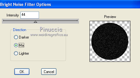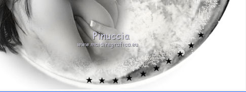 qui puoi trovare qualche risposta ai tuoi dubbi. Se l'argomento che ti interessa non è presente, ti prego di segnalarmelo. Questo tutorial è stato scritto in PSP X2, ma può essere eseguito anche con le altre versioni di PSP. Per tradurlo, l'ho eseguito con PSP X. Occorrente: Un tube a scelta. Il resto del materiale qui Il tube che ho usato è di Aclis. Filtri: DSB Flux - Bright Noise qui Imposta il colore di primo piano con il nero #000000 1. Apri una nuova immagine bianca 650 x 650 pixels. ![]() 2. Livelli>Nuovo livello raster. 3. Attiva lo strumento Selezione , cerchio,e traccia un cerchio sull'intera immagine. ![]() 4. Riempi la selezione con il colore di primo piano.5. Selezione>Deseleziona. Sposta il cerchio al centro.6. Effetti>Plugins>DSB Flux - Bright Noise. ![]() 7. Apri cirkel_x-mas e vai a Modifica>Copia. Torna al tuo lavoro e vai a Modifica>Incolla come nuovo livello. 8. Apri Sparkles, e vai a Modifica>Copia. Torna al tuo lavoro e vai a Modifica>Incolla come nuovo livello. 9. Apri diamonds, e vai a Modifica>Copia. Torna al tuo lavoro e vai a Modifica>Incolla come nuovo livello. 10. Regola>Messa a fuoco>Metti a fuoco. 11. Apri Frame, e vai a Modifica>Copia. Torna al tuo lavoro e vai a Modifica>Incolla come nuovo livello. 12. Apri Smoke e vai a Modifica>Copia. Torna al tuo lavoro e vai a Modifica>Incolla come nuovo livello. Spostalo un po' più in basso.![]() 13. Apri wordart, e vai a Modifica>Copia. Torna al tuo lavoro e vai a Modifica>Incolla come nuovo livello. Spostalo in basso a destra.14. Apri il tuo tube, e vai a Modifica>Copia. Torna al tuo lavoro e vai a Modifica>Incolla come nuovo livello. Spostalo a sinistra.15. Cambia la modalità di miscelatura di questo livello in Luminanza (esistente). 16. Effetti>Effetti 3D>Sfalsa ombra. ![]() 17. Apri bow, e vai a Modifica>Copia. Torna al tuo lavoro e vai a Modifica>Incolla come nuovo livello. Spostalo sotto il tube.18. Attiva il livello sottostante del tube. Attiva lo strumento Gomma e cancella la parte di tube sotto il nastro.![]() 20. Apri sterretje, e vai a Modifica>Copia. Torna al tuo lavoro e vai a Modifica>Incolla come nuovo livello. Spostalo sul bordo del cerchio in basso.![]() 21. Aggiungi il tuo nome e/o il tuo watermark. Livelli>Unisci>Unisci tutto e salva in formato jpg. ![]() Se hai problemi o dubbi, o trovi un link non funzionante, o anche soltanto per un saluto, scrivimi.