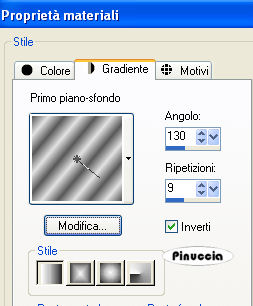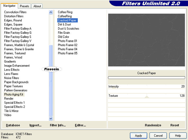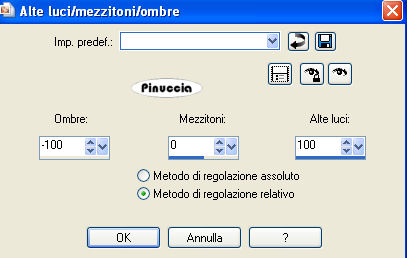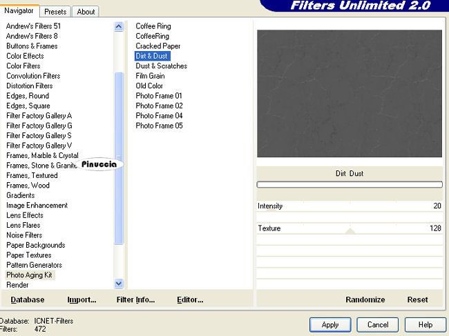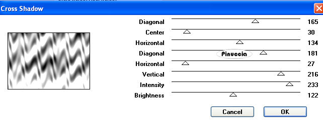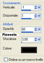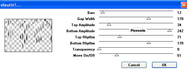 qui puoi trovare qualche risposta ai tuoi dubbi. Se l'argomento che ti interessa non è presente, ti prego di segnalarmelo. Per tradurre questo tutorial ho usato PSP X. Occorrente: Materiale qui Filtri: Graphics Plus qui FM Tile Tools qui Bordermania qui VM Extravaganza qui Color Rave qui Xero qui Filters Unlimited qui Photo Aging Kit qui Il filtro Photo Aging Kit si usa importandolo in Filters Unlimited. Come fare vedi qui 1. Apri una nuova immagine trasparente 650 x 450 pixels. Imposta il colore di primo piano con #e2e2e2 e il colore di sfondo con #585858. Riempi l'immagine trasparente con il colore di sfondo.Effetti>Plugins>Filters Unlimited - Photo Aging Kit - Cracked Paper: ![]() Effetti>Plugins>Filters Unlimited - Photo Aging Kit - Dirt & Dust: ![]() 2. Livelli>Nuovo livello raster. Passa il colore di primo piano a Gradiente con i seguenti settaggi: ![]() Regola>Sfocatura>Sfocatura gaussiana, raggio 30. ![]() Effetti>Plugins>Graphics Plus - Cross Shadow: ![]() Effetti>Plugins>VM Extravaganza - Shoutin'!: ![]() Attiva lo strumento Selezione , rettangolo,e traccia una selezione come nell'esempio: ![]() Premi sulla tastiera il tasto CANC ![]() Selezione>Deseleziona. Effetti>Effetti 3D>Sfalsa ombra: ![]() Attiva nuovamente lo strumento Selezione , rettangolo,e seleziona le ultime quattro strisce a sinistra: ![]() Selezione>Innalza selezione a livello. Attiva il livello sottostante e premi sulla tastiera il tasto CANC. Sposta le strisce un po' più in basso e all'esterno, vedi il mio esempio.3. Apri il tube della donna e vai a Modifica>Copia. Torna al tuo lavoro e vai a Modifica>Incolla come nuovo livello. Immagine>Ridimensiona, al 50%, tutti i livelli non selezionato. Regola>Messa a fuoco>Metti a fuoco. Immagine>Rifletti. Sposta il tube a destra.Regola>Tonalità e Saturazione>Viraggio: ![]() Regola>Luminosità e Contrasto>Alteluci/Mezzitoni/Ombre: ![]() 4. Effetti>Effetti 3D>Sfalsa ombra: ![]() 5. Apri il tube del fiore e vai a Modifica>copia. Torna al tuo lavoro e vai a Modifica>Incolla come nuovo livello. Immagine>Ridimensiona, al 40%, tutti i livelli non selezionato. Sposta il tube tra le strisce, vedi il mio esempio.Regola>Tonalità e Saturazione>Viraggio, con i settaggi precedenti. Regola>Luminosità e contrasto>Alteluci/Mezzitoni/ombre, con i seguenti settaggi. ![]() Abbassa l'opacità di questo livello al 40%. Effetti>Plugins>FM Tile Tools - Blend Emboss, con i settaggi standard. ![]() 6. Livelli>Nuovo livello raster. Apri il pennello "pinsel". File>Esporta>come pennello personalizzato - assegna un nome al pennello e clicca ok. Attiva lo strumento Pennello ![]() cerca e seleziona il pennello che hai appena esportato, e applicalo sopra i fiori. 7. Livelli>Unisci>Unisci tutto. Effetti>Plugins>Bordermania - Frame#2. ![]() Livelli>Duplica, 2 volte. Attiva il livello centrale. Effetti>Plugins>Xero - Porcelain, con i settaggi standard. ![]() Abbassa l'opacità di questo livello al 50%. Attiva il livello superiore. Effetti>Plugins>Color Rave - Atmospherizer 1.1. ![]() Cambia la modalità di miscelatura di questo livello in Luce netta, e abbassa l'opacità al 50%. Non dimenticare il tuo nome e/o il tuo watermark. Salva in formato jpg. ![]() Se hai problemi o dubbi, o trovi un link non funzionante, o anche soltanto per un saluto, scrivimi. 22 Agosto 2008 |