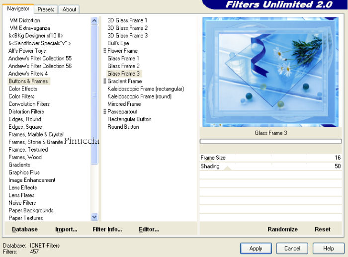 Effetti>Plugins>Filters Unlimited 2.0 - Buttons and Frames - Glass Frame 3, con i seguenti settaggi: