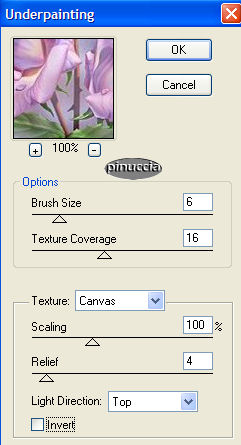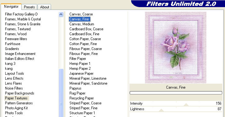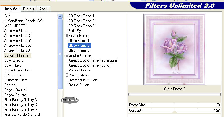 qui puoi trovare qualche risposta ai tuoi dubbi. Se l'argomento che ti interessa non è presente, ti prego di segnalarmelo. Occorrente: Una bella immagine. I tubes che ho usato sono di Patry (il fiore), di Filly (Demi Moore) e di Cyrene's (Uma). Filtri: Artistic qui Filters Unlimited 2.0 qui 1. Apri la tua immagine e duplicala due volte(shift+D). Chiudi sull'originale e minimizza una copia, che ti servirà più tardi. Lavorerai sulla seconda copia. Immagine>Ridimensiona, il lato più largo a 400 pixels. Regola>Messa a fuoco>Metti a fuoco. Scegli dall'immagine un colore chiaro come colore di primo piano e un colore scuro come colore di sfondo. 2. Immagine>Aggiungi bordatura, 2 pixels, simmetriche, con il colore scuro di sfondo. Immagine>Aggiungi bordatura, 5 pixels, simmetriche, con il colore chiaro di primo piano. Immagine>Aggiungi bordatura, 2 pixels, simmetriche, con il colore scuro di sfondo. 3. Immagine>Aggiungi bordatura, 20 pixels, simmetriche, con il colore chiaro di primo piano. Seleziona il bordo con la bacchetta magica ![]() Attiva la copia dell'immagine che hai messo da parte e vai a Modifica>Copia. Torna al tuo lavoro e vai a Modifica>Incolla>Incolla nella selezione. Effetti>Plugins>Artistic - Underpainting, settaggi standard. ![]() Selezione>Nessuna selezione. 4.Immagine>Aggiungi bordatura, 2 pixels, simmetriche, con il colore scuro di sfondo. Immagine>Aggiungi bordatura, 5 pixels, simmetriche, con il colore chiaro di primo piano. Immagine>Aggiungi bordatura, 2 pixels, simmetriche, con il colore scuro di sfondo. 5. Immagine>Aggiungi bordatura, 25 pixels, simmetriche, con il colore chiaro di primo piano. Seleziona il bordo con la bacchetta magica ![]() Effetti>Plugins>Filters Unlimited / Paper Textures / Canvas fine, con i settaggi standard. ![]() Selezione>Nessuna selezione. 6. Immagine>Aggiungi bordatura, 20 pixels, simmetriche, con il colore chiaro di primo piano. Seleziona il bordo con la bacchetta magica ![]() Attiva la copia che hai messo da parte e vai a Modifica>Copia. Torna al tuo lavoro e vai a Modifica>Incolla>Incolla nella selezione. Regola>Sfocatura>Sfocatura gaussiana, raggio 5. 7. Effetti>Plugins>Filters Unlimited, Buttons and Frames - Glass Frame 2: ![]() 8. Non dimenticare di aggiungere il tuo nome o il tuo watermark. Salva in formato jpg. ![]() ![]() ![]() Se hai problemi o dubbi, o trovi un link non funzionante, o anche soltanto per un saluto, scrivimi. Dicembre 2006 |