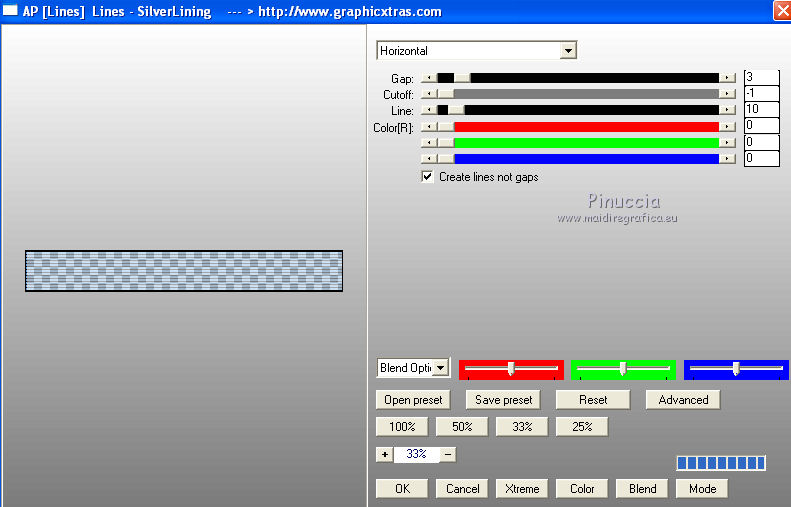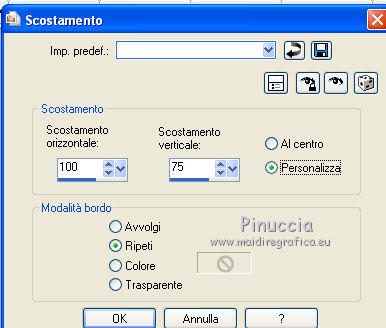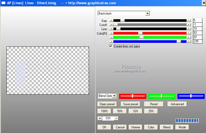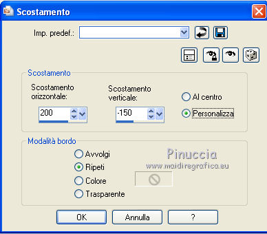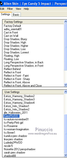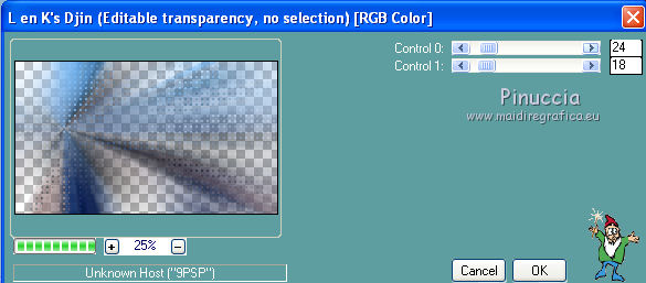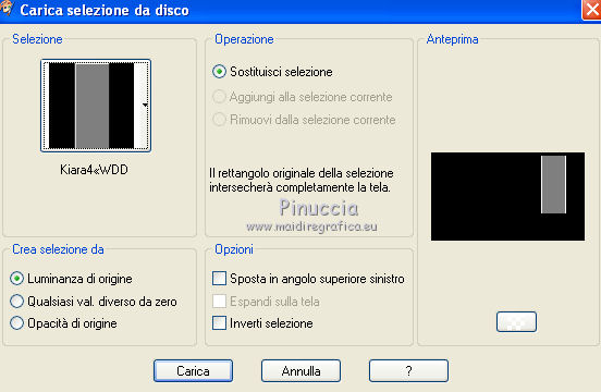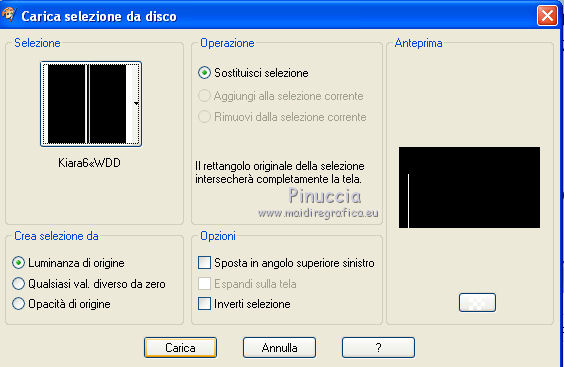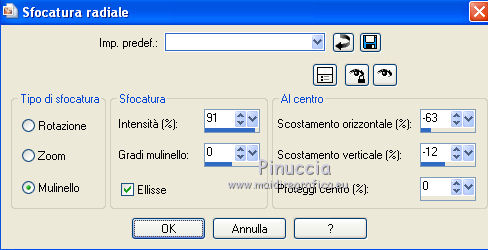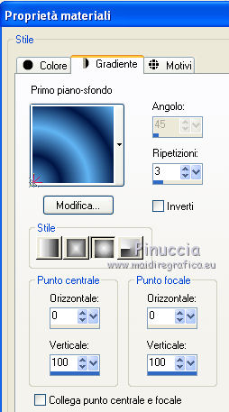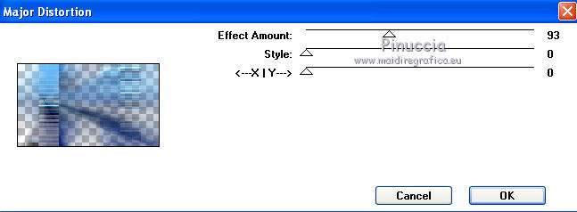 qui puoi trovare qualche risposta ai tuoi dubbi. Se l'argomento che ti interessa non è presente, ti prego di segnalarmelo. Per tradurre questo tutorial ho usato PSP X. Questo tutorial è una creazione di ©Whitediamond e non può essere copiato su altri siti nè essere offerto per il download. Lo stesso vale per la mia traduzione. Il materiale viene da vari gruppi di condivisione. Il copyright appartiene ai rispettivi autori. Grazie ai creatori dei tubes che mettono a disposizione il loro lavoro in vari gruppi di condivisione. Occorrente: Materiale qui I tubes sono di White Diamond. E' vietato utilizzarli per altri lavori, senza il suo permesso. Rispetta il lavoro degli autori, non cambiare il nome del file e non cancellare il watermark. Filtri: consulta, se necessario, la mia sezione filtri qui AP(Line) - Lines Silverlining qui Forrest's Filters - Major distortion qui Simple - Half Wrap qui Adjust - Variations qui L&K - L&K Djin qui Cybia - Screenworks qui Filters Unlimited qui AFS Import - Sqborder 2 qui Alien Skin Eye Candy 5 Impact - Perspective Shadow qui ![]() Metti il preset kiara©WWD.f1s nella cartella del filtro: Alien Skin Eye Candy 5 Impact>Settings>Settings>Shadow. Doppio clic sul file e il preset sarà automaticamente installato. Se preferisci puoi importarlo, quando ti servirà, dalla cartella in cui hai scompattato il materiale. Vedi la scheda del filtro qui e come importare un preset in Eye Candy qui Metti le selezioni nella cartella Selezioni. 1. Imposta il colore di primo piano con #61b4f3, e il colore di sfondo con #001544. Passa il colore di primo piano a Gradiente. ![]() 2. Apri una nuova immagine trasparente 950 x 550 pixels, e riempila con il gradiente.3. Apri WDD-F-0075 e vai a Modifica>Copia. Torna al tuo lavoro e vai a Modifica>Incolla come nuovo livello. 4. Immagine>Ridimensiona, all'80%, tutti i livelli non selezionato. 5. Effetti>Effetti di immagine>Scostamento. ![]() 6. Livelli>Duplica. Immagine>Rifletti. Livelli>Unisci>Unisci giù. Selezione>Seleziona tutto. 7. Regola>Sfocatura>Sfocatura radiale. ![]() Selezione>Deseleziona. 8. Effetti>Plugins>L&K - L&K Djin. ![]() 9. Effetti>Effetti di bordo>Aumenta. 10. Effetti>Plugins>Adjust - Variations. 1 clic su Original, per annullare eventuali precedenti settaggi memorizzati dal filtro, 1 clic su More Cyan, 1 clic su More Blue e ok. 11. Livelli>Duplica. Attiva il livello sottostante dell'originale. 12. Effetti>Plugins>Forrest's Filters - Major distorsion. ![]() 13. Cambia la modalità di miscelatura di questo livello in Luminanza (esistente), e abbassa l'opacità al 53%. 14. Attiva il livello superiore. Abbassa l'opacità di questo livello al 69%. 15. Apri "Sinedots" e vai a Modifica>Copia. Torna al tuo lavoro e vai a Modifica>Incolla come nuovo livello. Cambia la modalità di miscelatura di questo livello in Filtra. 16. Effetti>Effetti di bordo>Aumenta. 17. Effetti>Plugins>Simple - Half Wrap. 18. Livelli>Nuovo livello raster. Selezione>Carica/Salva selezione>Carica selezione da disco. Cerca e carica la selezione kiara1©WDD. ![]() 19. Imposta il colore di primo piano con #000c30, e riempi la selezione con questo colore.20. Cambia la modalità di miscelatura di questo livello in Luminanza (Esistente). Selezione>Deseleziona. 21. Livelli>Nuovo livello raster. Selezione>Carica/Salva selezione>Carica selezione da disco. Cerca e carica la selezione kiara2©WDD. ![]() 22. Imposta il colore di primo piano con il colore bianco #ffffff. e riempi la selezione con questo colore.Selezione>Deseleziona. 23. Livelli>Nuovo livello raster. Apri "textbrush". File>Esporta>Pennello personalizzato - assegna un nome al pennello e ok. 24. Attiva lo strumento Pennello ![]() cerca e carica il pennello che hai appena esportato, e applicalo in basso a destra, cliccando con il tasto sinistro del mouse per usare il colore bianco di primo piano. 25. Livelli>Nuovo livello raster. Selezione>Carica/Salva selezione>Carica selezione da disco. Cerca e carica la selezione kiara3©WDD. ![]() Riempi la selezione con il colore bianco.Selezione>Deseleziona. 26. Livelli>Nuovo livello raster. Selezione>Carica/Salva selezione>Carica selezione da disco. Cerca e carica la selezione kiara4©WDD. ![]() 27. Imposta il colore di primo piano con #2d5388, e riempi la selezione con questo colore.Selezione>Modifica>Contrai - 2 pixels. 29. Effetti>Plugins>Cybia - Screenworks - Boxed dot. ![]() Effetti>Effetti di bordo>Aumenta. Selezione>Deseleziona. 30. Livelli>Nuovo livello raster. Selezione>Carica/Salva selezione>Carica selezione da disco. Cerca e carica la selezione kiara5©WDD. ![]() Imposta il colore di primo piano con #61b4f3, e riempi la selezione con questo colore.Selezione>Modifica>Contrai - 2 pixels. Imposta il colore di primo piano con #67a5dc, e riempi la selezione con questo colore.31. Effetti>Plugins>AP 01 Lines - Lines Silverlining. ![]() Selezione>Deseleziona. 32. Apri WDD-CO-0004 e vai a Modifica>Copia. Torna al tuo lavoro e vai a Modifica>Incolla come nuovo livello. Immagine>Ridimensiona, al 45%, tutti i livelli non selezionato. 33. Effetti>Effetti 3D>Sfalsa ombra. ![]() 34. Effetti>Effetti di immagine>Scostamento. ![]() 35. Effetti>Plugins>Alien Skin Eye Candy 5 Impact - Perspective Shadow, seleziona il preset Kiara©WWD e ok. ![]() 36. Ripeti l'Effetto Perspective Shadow. 37. Livelli>Nuovo livello raster. Selezione>Carica/Salva selezione>Carica selezione da disco. Cerca e carica la selezione kiara6©WDD. ![]() 38. Imposta il colore di primo piano con #001544, e riempi la selezione con questo colore.Selezione>Deseleziona. 39. Livelli>Nuovo livello raster. Selezione>Carica/Salva selezione>Carica selezione da disco. Cerca e carica la selezione kiara7©WDD. ![]() Riempi la selezione con il colore bianco.Selezione>Deseleziona. 40. Effetti>Plugins>AP Lines - Silver Linings. ![]() Effetti>Effetti di bordo>Aumenta. Cambia la modalità di miscelatura di questo livello in Sovrapponi. 41. Livelli>Nuovo livello raster. 42. Attiva nuovamente lo strumento Pennel