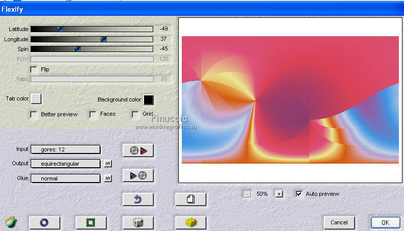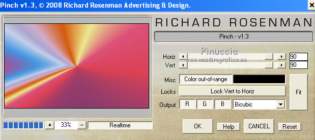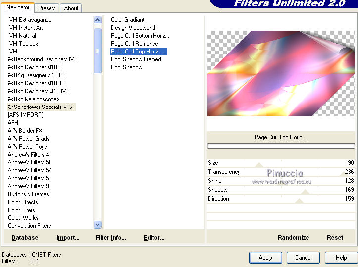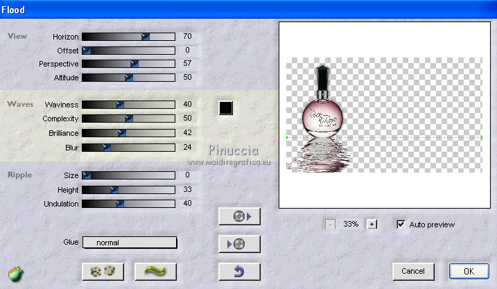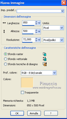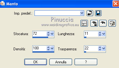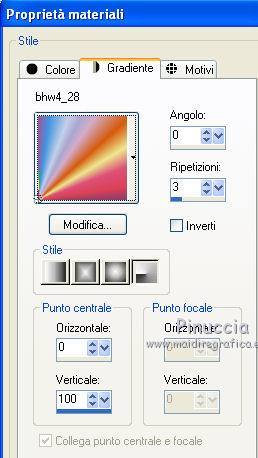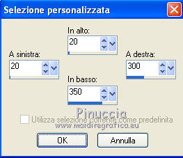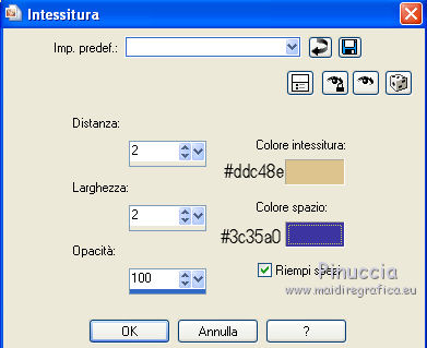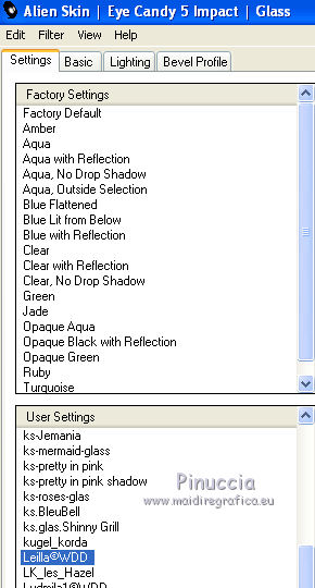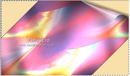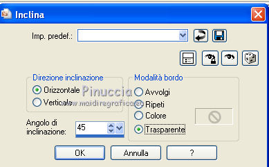 qui puoi trovare qualche risposta ai tuoi dubbi. Se l'argomento che ti interessa non è presente, ti prego di segnalarmelo. Per tradurre questo tutorial ho usato PSP X. Questo tutorial è una creazione di ©Whitediamond e non può essere copiato su altri siti nè essere offerto per il download. Lo stesso vale per la mia traduzione. Il materiale viene da vari gruppi di condivisione. Il copyright appartiene ai rispettivi autori. Grazie ai creatori dei tubes che mettono a disposizione il loro lavoro in vari gruppi di condivisione. Occorrente: Materiale qui I tubes appartengono a White Diamond. E' vietato utilizzarli per altri lavori, senza il suo permesso. Rispetta il lavoro degli autori, non cambiare il nome del file e non cancellare il watermark. Filtri: consulta, se necessario, la mia sezione filtri qui Richard Rosenman - Pinch qui Flaming Pear - Flood qui Flaming Pear - Flexify qui Simple - Quick Tile qui Adjust - Variations qui Greg's Factory Output - Pool Shadow qui Penta.com - Color dot qui Filters Unlimited qui Sandflower Specials - Curl Top Horizontal qui Alien Skin Eye Candy 5 Impact - Perspective Shadow qui ![]() Metti il preset leila©WWD.f1s nella cartella del filtro: Alien Skin Eye Candy 5 Impact>Settings>Settings>Glass. Doppio clic sul file e il preset sarà automaticamente installato. Se preferisci puoi importarlo, quando ti servirà, dalla cartella in cui hai scompattato il materiale. Vedi la scheda del filtro qui e come importare un preset in Eye Candy qui Metti il gradiente nella cartella Gradienti. 1. Apri una nuova immagine 850 x 500 colore #f9dfa6. ![]() 2. Passa il colore di primo piano a Gradiene, e seleziona il gradiente bhw4_28, con i seguenti settaggi. ![]() 3. Livelli>Nuovo livello raster. Riempi con il gradiente.4. Effetti>Plugins>Richard Rosenman - Pinch. ![]() 5. Effetti>Plugins>Flaming Pear - Flexify. ![]() 6. Effetti>Plugins>Simple - Quick tile. 7. Effetti>Effetti di bordo>Aumenta. 8. Effetti>Plugins>Adjust - Variations. un clic su Original, per annullare eventuali precedenti settaggi memorizzati dal filtro, 2 clic su More Cyan e ok. 9. Effetti>Effetti geometrici>Inclina. ![]() 10. Effetti>Plugins>Greg's Factory Output II - Pool Shadow, con i settaggi standard. ![]() se non vuoi aggiungere nuovi filtri ai Percorsi, ricorda che il Pool Shadow di Greg's Factory è identico al Pool Shadow di Tramages e al Cross Shadow di Graphics Plus 11. Effetti>Plugins>Filters Unlimited - Sandflowers Special - Page Curl Top Horizontal. ![]() 12. Attiva lo strumento Bacchetta magica ![]() e clicca negli angoli in alto a sinistra e in basso a destra. ![]() 13. Attiva il livello inferiore. 14. Effetti>Effetti di trama>Intessitura. ![]() 15. Livelli>Nuovo livello raster. Imposta il colore di primo piano con #5f2d7f, e riempi la selezione con questo colore.16. Selezione>Modifica>Contrai - 3 pixels. Premi sulla tastiera il tasto CANC. 17. Effetti>Plugins>Alien Skin Eye Candy 5 Impact - Glass, seleziona il preset Leila©WDD e ok. ![]() 18. Selezione>Deseleziona. Livelli>Unisci>Unisci giù. 19. Attiva nuovamente il livello superiore. Livelli>Nuovo livello raster. 20. Attiva lo strumento Selezione ,clicca sull'icona Selezione personalizzata ![]() e imposta i seguenti settaggi: ![]() 21. Apri "cadre" e vai a Modifica>Copia. Torna al tuo lavoro e vai a Modifica>Incolla nella selezione. 22. Cambia la modalità di miscelatura di questo livello in Moltiplica, e abbassa l'opacità all'84%. Selezione>Deseleziona. 23. Apri "bandelette" e vai a Modifica>Copia. Torna al tuo lavoro e vai a Modifica>Incolla come nuovo livello. 24. Effetti>Effetti di immagine>Scostamento. ![]() Cambia la modalità di miscelatura di questo livello in Luminanza. Effetti>Effetti di bordo>Aumenta di più. 25. Apri WDD-P-0016, e vai a Modifica>Copia. Torna al tuo lavoro e vai a Modifica>Incolla come nuovo livello. Posiziona il tube nella cornice.26. Livelli>Duplica, e attiva il livello sottostante dell'originale. 27. Regola>Sfocatura>Sfocatura gaussiana - raggio 25. ![]() 28. Effetti>Effetti di trama>Manto. ![]() 29. Effetti>Effetti di bordo>Aumenta di più. Cambia la modalità di miscelatura di questo livello in Luce netta. Attiva nuovamente il livello superiore. 30.Effetti>Effetti 3D>Sfalsa ombra. ![]() 31. Effetti>Plugins>Flaming Pear - Flood: ![]() ricorda che effetto visivo dell'ondulazione è casuale e può essere diverso dal mio; se vuoi cambiare l'aspetto delle onde, premi sull'icona dell'onda, finchè - nella finestra di anteprima - non vedi il risultato che ti piace di più 32. Apri WDD-F-0050, e vai a Modifica>Copia. Torna al tuo lavoro e vai a Modifica>Incolla come nuovo livello. Immagine>Rifletti. Sposta il tube a destra - vedi l'esempio finale.![]() 33. Livelli>Duplica, e attiva il livello sottostante dell'originale. 34. Regola>Sfocatura>Sfocatura gaussiana - raggio 25. ![]() 35. Effetti>Plugins>Penta.com - Color dot, con i settaggi standard. ![]() 36. Regola>Messa a fuoco>Metti a fuoco. Cambia la modalità di miscelatura di questo livello in Luminanza. 37. Attiva nuovamente il livello superiore. Effetti>Effetti 3D>Sfalsa ombra. ![]() 38. Livelli>Unisci>Unisci visibile. Livelli>Nuovo livello raster. Riempi con il colore di primo piano #5f2d7f.39. Selezione>Seleziona tutto. Selezione>Modifica>Contrai - 3 pixels. Premi sulla tastiera il tasto CANC. Selezione>Deseleziona. 40. Livelli>Unisci>Unisci tutto appiattisci. 41. Modifica>Copia. 42. Immagine>Aggiungi bordatura, 10 pixels, simmetriche, con il colore bianco. Immagine>Aggiungi bordatura, 3 pixels, simmetriche, con il colore #5f2d7f. Immagine>Aggiungi bordatura, 35 pixels, simmetriche, con il colore bianco. 43. Seleziona il bordo da 35 pixels con la bacchetta magica ![]() Modifica>Incolla nella selezione. 44. Regola>Sfocatura>Sfocatura gaussiana - raggio 25. Selezione>Deseleziona. 45. Immagine>Aggiungi bordatura, 3 pixels, simmetriche, con il colore #5f2d7f. Immagine>Aggiungi bordatura, 10 pixels, simmetriche, con il colore bianco. Immagine>Aggiungi borda
