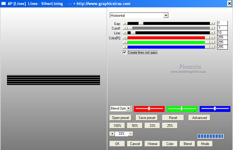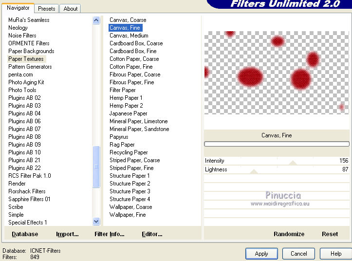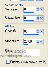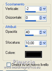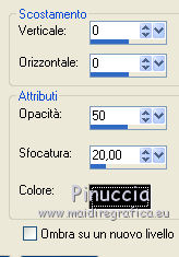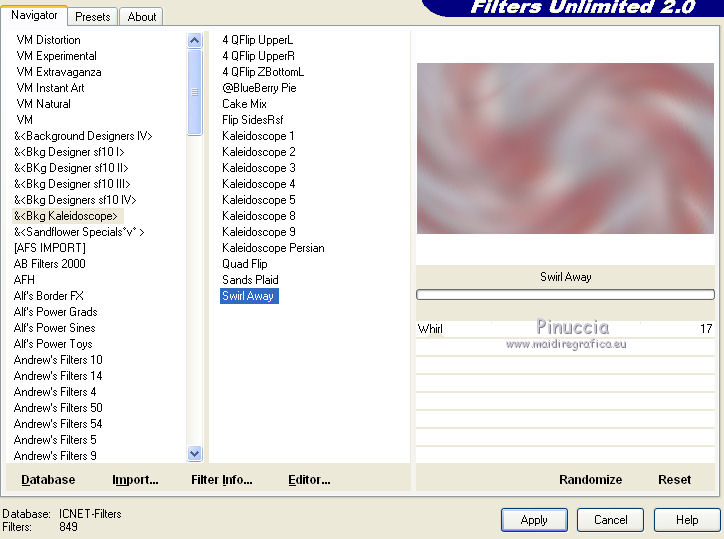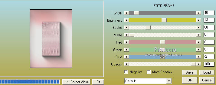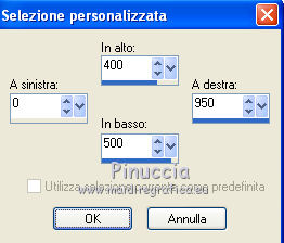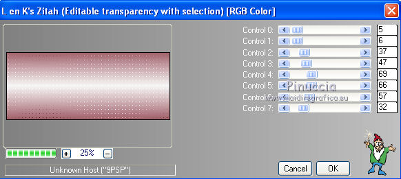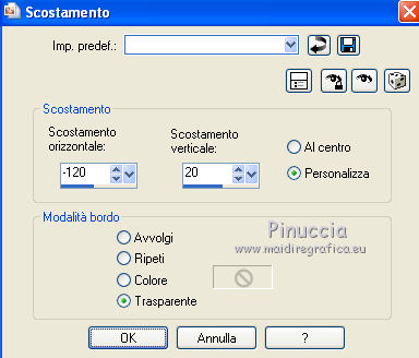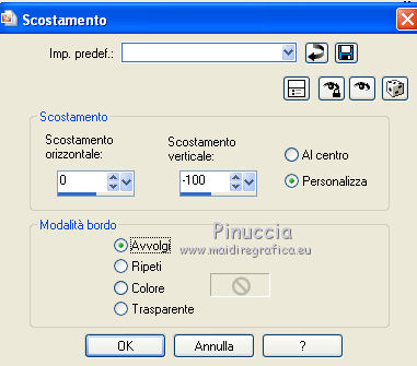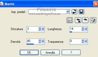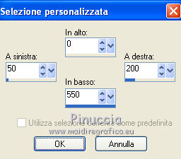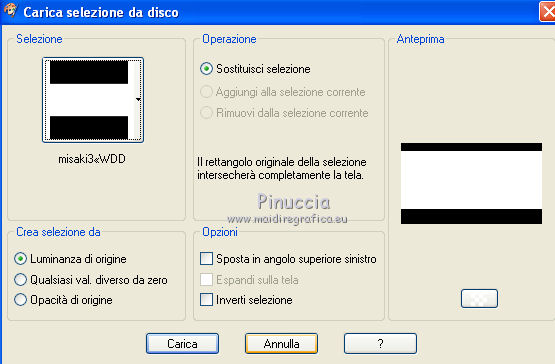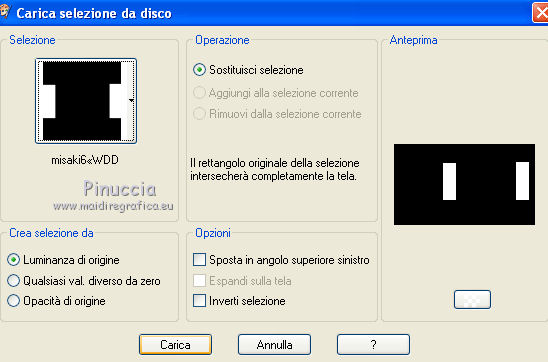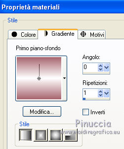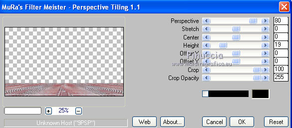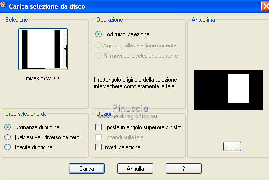 qui puoi trovare qualche risposta ai tuoi dubbi. Se l'argomento che ti interessa non è presente, ti prego di segnalarmelo. Per tradurre questo tutorial ho usato PSP X. Questo tutorial è una creazione di ©Whitediamond e non può essere copiato su altri siti nè essere offerto per il download. Lo stesso vale per la mia traduzione. Il materiale viene da vari gruppi di condivisione. Il copyright appartiene ai rispettivi autori. Grazie ai creatori dei tubes che mettono a disposizione il loro lavoro in vari gruppi di condivisione. Occorrente: Materiale qui Il tube misted appartiene a Guismo che ringrazio per il permesso di utilizzarlo. Il resto del materiale è di White Diamond. E' vietato utilizzare questo materiale per altri lavori, senza il permesso degli autori. E' anche vietato ridistribuirlo e modificarlo. Filtri: consulta, se necessario, la mia sezione filtri qui Filters Unlimited 2.0 qui BKG Kaleidoscope - Swirl Away qui Simple - Pizza Slice Mirror qui L&K Landksiteofwonder - Zitah qui AAA Frames - Foto Frame qui Mura's Meister - Perspective Tiling qui FM Tile Tools - Blend Emboss qui Ap Lines - SilverLining qui Transparency - Eliminate Black qui Transparency - Eliminate White qui ![]() Metti le selezioni nella cartella Selezioni. 1. Apri una nuova immagine trasparente 950 x 550 pixels. 2. Selezione>Seleziona tutto. Apri "fond" e vai a Modifica>Copia. Torna al tuo lavoro e vai a Modifica>Incolla nella selezione. Selezione>Deseleziona. 3. Effetti>Plugins>Filters Unlimited 2.0 - BKG Kaleidoscope - Swirl Away. ![]() 4. Effetti>Effetti di trama>Manto. ![]() 5. Effetti>Effetti di bordo>Aumenta di più. 6. Livelli>Nuovo livello raster. 7. Attiva lo strumento Selezione ,clicca sull'icona Selezione personalizzata ![]() e imposta i seguenti settaggi: ![]() Imposta il colore di primo piano con il colore bianco, e riempi la selezione con il colore bianco.8. Effetti>Plugins>AP Lines - SilverLining. ![]() 9. Effetti>Plugins>Transparency - Eliminate White. 10. Selezione>Deseleziona. 11. Livelli>Nuovo livello raster. 12. Selezione personalizzata ![]() ![]() Imposta il colore di primo piano con il colore nero, e riempi la selezione con il colore nero.13. Effetti>Plugins>AP Lines - SilverLining. ![]() 14. Effetti>Plugins>Transparency - Eliminate Black. Selezione>Deseleziona. 15. Effetti>Effetti di immagine>Scostamento. ![]() 16. Livelli>Unisci>Unisci visibile. Livelli>Duplica. 17. Effetti>Plugins>Simple - Pizza slice mirror. 18. Attiva lo strumento Bacchetta magica ![]() e clicca sulle parti bianche per selezionarle. Premi sulla tastiera il tasto CANC. Selezione>Deseleziona. 19. Livelli>Unisci>Unisci visibile. Regola>Messa a fuoco>Metti a fuoco. 20. Livelli>Nuovo livello raster. Selezione>Carica/Salva selezione>Carica selezione da disco. Cerca e carica la selezione misaki1. ![]() Imposta il colore di primo piano con #a80612, e riempi la selezione con questo colore.21. Effetti>Plugins>Filters Unlimited 2.0 - Paper Texture - Canvas, Fine. ![]() 22. Effetti>Effetti di bordo>Aumenta di più. Abbassa l'opacità di questo livello al 18%. 23. Selezione>Inverti. Premi sulla tastiera due volte il tasto CANC. Selezione>Deseleziona. 24. Livelli>Unisci>Unisci visibile. Livelli>Duplica. 25. Effetti>Plugins>Mura's Meister - Perspective Tiling. ![]() 26. Selezione>Carica/Salva selezione>Carica selezione da disco. Cerca e carica la selezione misaki2. ![]() Premi sulla tastiera il tasto CANC. Selezione>Deseleziona. 27. Effetti>Effetti 3D>Sfalsa ombra, con il colore bianco. ![]() 28. Livelli>Unisci>Unisci visibile. 29. Selezione>Carica/Salva selezione>Carica selezione da disco. Cerca e carica la selezione misaki3. ![]() Imposta il colore di primo piano con il colore bianco, e riempi la selezione con il colore bianco.30. Selezione>Modifica>Contrai - 2 pixels. Premi sulla tastiera il tasto CANC. Mantieni selezionato. 31. Livelli>Nuovo livello raster. Riempi la selezione con il colore bianco.Selezione>Deseleziona. Abbassa l'opacità di questo livello al 37%. 32. Livelli>Unisci>Unisci visibile. 33. Apri "calguisduovisage" e vai a Modifica>Copia. Torna al tuo lavoro e vai a Modifica>Incolla come nuovo livello. 34. Immagine>Ridimensiona, al 56%, tutti i livelli non selezionato. 35. Effetti>Effetti di immagine>Scostamento. ![]() 36. Cambia la modalità di miscelatura di questo livello in Filtra. Effetti>Effetti di bordo>Aumenta di più. 37. Effetti>Plugins>FM Tile Tools - Blend Emboss, con i settaggi standard. ![]() 38. Livelli>Nuovo livello raster. Selezione>Carica/Salva selezione>Carica selezione da disco. Cerca e carica la selezione misaki4. ![]() Riempi la selezione con il colore bianco.Selezione>Deseleziona. 39. Livelli>Unisci>Unisci visibile. 40. Imposta il colore di primo piano con #a7656e, e il colore di sfondo con il colore bianco. Passa il colore di primo piano a Gradiente, con i seguenti settaggi. ![]() 41. Selezione>Carica/Salva selezione>Carica selezione da disco. Carica nuovamente la selezione misaki3. ![]() 41. Selezione>Modifica>Contrai - 2 pixels. Livelli>Nuovo livello raster. Riempi la selezione con il gradiente.42. Effetti>Plugins>L&K Landksiteofwonder - L&K Zitah. ![]() 43. Effetti>Effetti di bordo>Aumenta di più. Abbassa l'opacità di questo livello al 50%. Selezione>Deseleziona. 44. Livelli>Unisci>Unisci visibile. 45. Selezione>Carica/Salva selezione>Carica selezione da disco. Cerca e carica la selezione misaki5. ![]() Selezione>Innalza selezione a livello. 46. Effetti>Plugins>AAA Frames - Foto Frame. ![]() 47. Selezione>Modifica>Contrai - 40 pixels. Livelli>Nuovo livello raster. Riempi con il colore bianco.Selezione>Modifica>Contrai - 2 pixels. Premi sulla tastiera il tasto CANC. 48. Apri il tube "WDD-F-0042" e vai a Modifica>Copia. Torna al tuo lavoro e vai a Modifica>Incolla nella selezione. 49. Regola>Messa a fuoco>Metti a fuoco. Selezione>Deseleziona. 50. Livelli>Unisci>Unisci visibile. 51. Selezione>Carica/Salva selezione>Carica selezione da disco. Cerca e carica la selezione misaki6. ![]() 52. 
