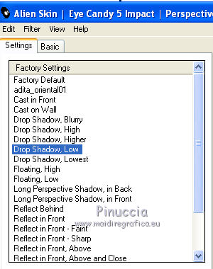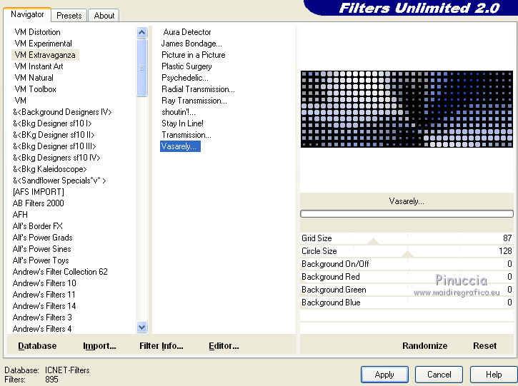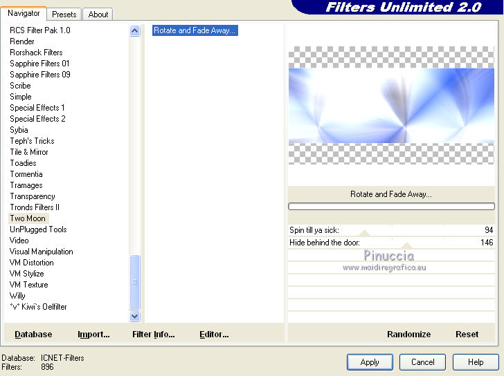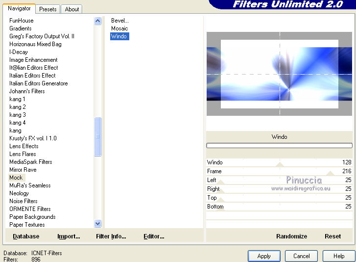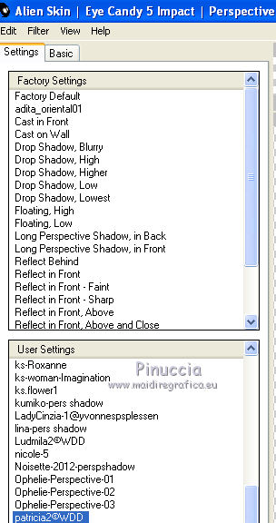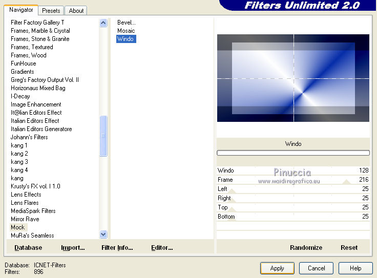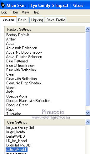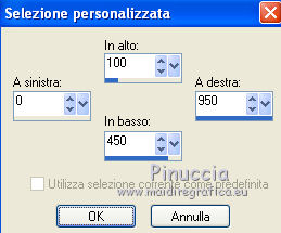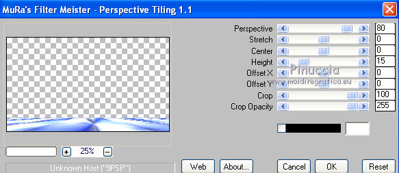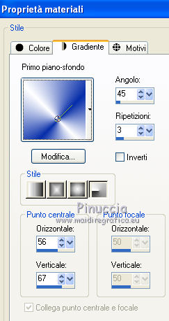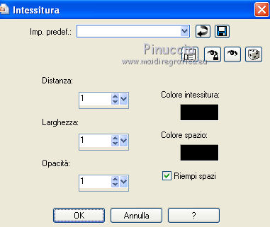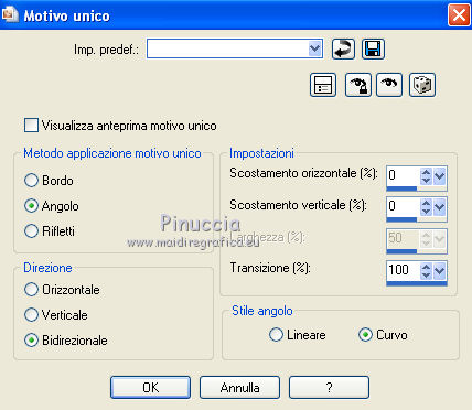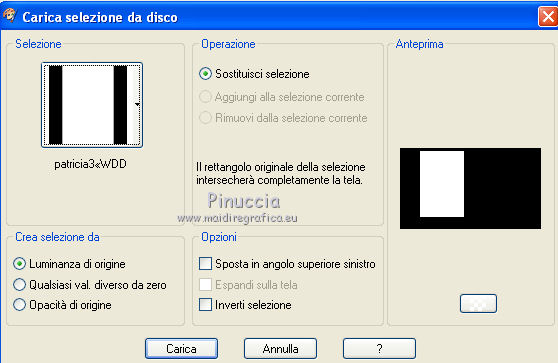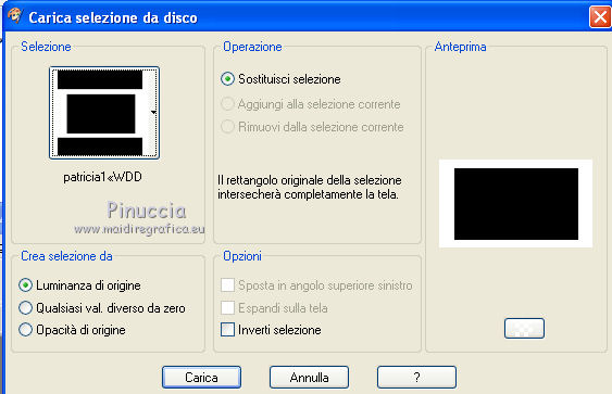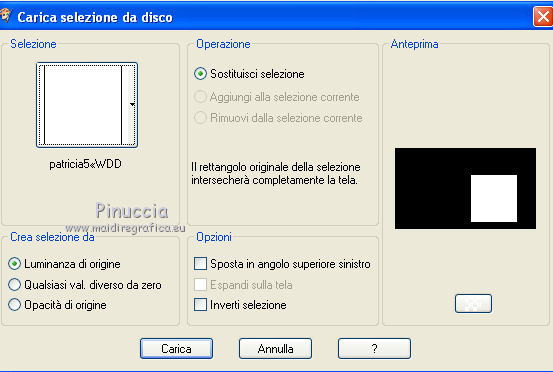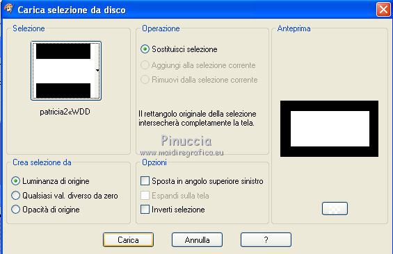qui puoi trovare qualche risposta ai tuoi dubbi. Se l'argomento che ti interessa non è presente, ti prego di segnalarmelo. Per tradurre questo tutorial ho usato PSP X. Questo tutorial è una creazione di ©Whitediamond e non può essere copiato su altri siti nè essere offerto per il download. Lo stesso vale per la mia traduzione. Il materiale viene da vari gruppi di condivisione. Il copyright appartiene ai rispettivi autori. Grazie ai creatori dei tubes che mettono a disposizione il loro lavoro in vari gruppi di condivisione. Occorrente: Materiale qui Il materiale appartiene a White Diamond. E' vietato utilizzare questo materiale per altri lavori, senza permesso. E' anche vietato ridistribuirlo e modificarlo. Filtri: consulta, se necessario, la mia sezione filtri qui Mock - Windo qui Adjust - Variations qui Alien Skin Eye Candy 5 Impact - Glass, Perspective Shadow qui Transparency - Eliminate Black qui VM Extravaganza - Vaserely qui Mura's Meister - Perspective Tiling qui Two moon - Rotate and Fade Away qui Penta.com - Color dot qui Penta.com - Jeans qui Filters Unlimited 2.0 qui ![]() Metti le selezioni nella cartella Selezioni. Metti i preset patricia©WDD e patricia2WDD nelle cartelle del filtro Alien Skin Eye Candy 5 Impact>Settings>Glass e Shadow. Doppio clic sul file e il preset sarà automaticamente installato. Se preferisci puoi importarlo, quando ti servirà, dalla cartella in cui hai scompattato il materiale. Vedi la scheda del filtro qui e come importare un preset in Eye Candy qui 1. Imposta il colore di primo piano con #062da9, e il colore di sfondo con il bianco #ffffff. Passa il colore di primo piano a Gradiente, con i seguenti settaggi. ![]() 2. Apri una nuova immagine trasparente 950 x 550 pixels, e riempila con il gradiente.3. Livelli>Duplica. 4. Apri "WDD-Exclusif-0024" e vai a Modifica>Copia. non chiuderlo perchè ti servirà ancora Torna al tuo lavoro e vai a Modifica>Incolla come nuovo livello. 5. Immagine>Ridimensiona, al 60%, tutti i livelli non selezionato. 6. Effetti>Effetti di immagine>Motivo unico. ![]() 7. Regola>Sfocatura>Sfocatura radiale. ![]() 8. Livelli>Unisci>Unisci giù. 9. Attiva lo strumento Selezione ,clicca sull'icona Selezione personalizzata ![]() e imposta i seguenti settaggi: ![]() Selezione>Inverti. Premi sulla tastiera il tasto CANC. Selezione>Deseleziona. Dovresti avere questo. ![]() 10. Livelli>Duplica. Selezione>Seleziona tutto. Selezione>Mobile. Selezione>Immobilizza. 11. Effetti>Plugins>Filters Unlimited 2.0 - VM Extravaganza - Vasarely. ![]() 12. Effetti>Plugins>Transparency - Eliminate Black. 13. Effetti>Effetti di bordo>Aumenta. Selezione>Deseleziona. Cambia la modalità di miscelatura di questo livello in Sovrapponi. 14. Attiva il livello centrale "Copia di raster 1". ![]() 15. Effetti>Plugins>Filters Unlimited 2.0 - Two Moon - Rotate and Fade Away. ![]() 16. Effetti>Plugins>Adjust - Variations: un clic su Original per annullare eventuali precedenti settaggi memorizzati dal filtro, 3 clic su Darker e ok. se stai utilizzando dei colori scuri, clicca 1 volta su Original e 2 su lighter 17. Livelli>Duplica. 18. Effetti>Plugins>Filters Unlimited - Mock - Windo. ![]() 19. Selezione personalizzata ![]() ![]() Selezione>Inverti. Premi sulla tastiera il tasto CANC. Selezione>Deseleziona. 20. Livelli>Unisci>Unisci giù. Cambia la modalità di miscelatura di questo livello in Moltiplica. se stai usando colori scuri, adatta la modalità di miscelatura ai tuoi colori 21. Effetti>Effetti di bordo>Aumenta. Dovresti avere questo. ![]() 22. Attiva il livello inferiore. Livelli>Duplica. 23. Selezione personalizzata ![]() ![]() Selezione>Inverti. Effetti>Effetti di trama>Intessitura. ![]() Selezione>Deseleziona. 24. Effetti>Plugins>Filters Unlimited - Mock - Windo. ![]() 25. Cambia la modalità di miscelatura di questo livello in Moltiplica. se stai usando colori scuri, cambia la modalità di miscelatura di questo livello in Filtra. 26. Selezione>Carica/Salva selezione>Carica selezione da disco. Cerca e carica la selezione patricia1©WDD. ![]() 27. Effetti>Plugins>Penta.com - Color dot. ![]() Selezione>Deseleziona. 28. Livelli>Unisci>Unisci giù. 29. Selezione>Carica/Salva selezione>Carica selezione da disco. Cerca e carica la selezione patricia2©WDD. ![]() 30. Attiva il livello centrale. Selezione>Innalza selezione a livello. Selezione>Deseleziona. 31. Livelli>Duplica, e attiva il livello sottostante dell'originale. 32. Effetti>Plugins>Mura's Meister - Perspective Tiling. ![]() Cambia la modalità di miscelatura di questo livello in Luce netta. 33. Attiva il livello superiore. Effetti>Effetti 3D>Sfalsa ombra. ![]() 34. Cambia la modalità di miscelatura di questo livello in Scurisci. Livelli>Unisci>Unisci visibile. 35. Livelli>Nuovo livello raster. Selezione>Carica/Salva selezione>Carica selezione da disco. Cerca e carica la selezione patricia3©WDD. ![]() Imposta il colore di sfondo con il colore nero, e riempi la selezione con questo colore.36. Effetti>Effetti 3D>Sfalsa ombra. ![]() 37. Selezione>Modifica>Contrai - 35 pixels. Premi sulla tastiera il tasto CANC. Selezione>Deseleziona. 38. Effetti>Plugins>Alien Skin Eye Candy 5 Impact - Glass. Seleziona il preset Patricia©WDD e ok. ![]() 39. Attiva il livello inferiore Uniti. Livelli>Duplica e attiva nuovamente il livello inferiore. 40. Regola>Sfocatura>Sfocatura gaussiana - raggio 20. ![]() 41. Effetti>Effetti di trama>Intessitura. ![]() 42. Effetti>Plugins>Adjust - Variation. Un clic su original, 2 clic su darker e ok. se stai usando colori scuri, un clic su Originale e 2 clic su Lighter 43. Attiva il livello superiore. 44. Apri il tube WDD-Exclusif-0011" e vai a Modifica>Copia. Torna al tuo lavoro e vai a Modifica>Incolla come nuovo livello. Immagine>Ridimensiona, al 50%, tutti i livelli non selezionato. 45. Effetti>Effetti di immagine>Scostamento. ![]() 46. Effetti>Plugins>Alien Skin Eye Candy 5 Impact - Perspective Shadow. Seleziona il preset Drop Shadow,Low e ok. ![]() 47. Livelli>Unisci>Unisc