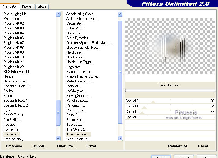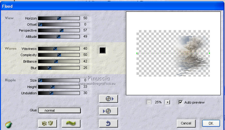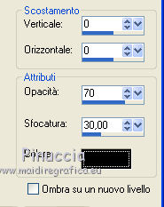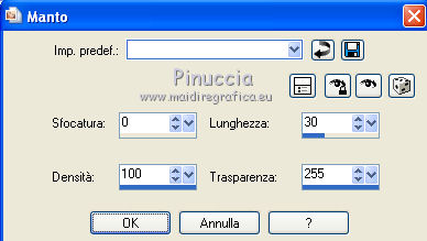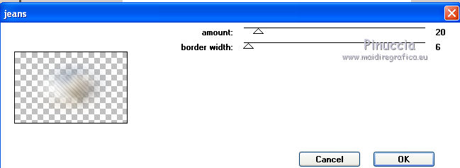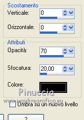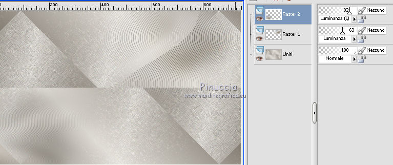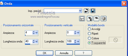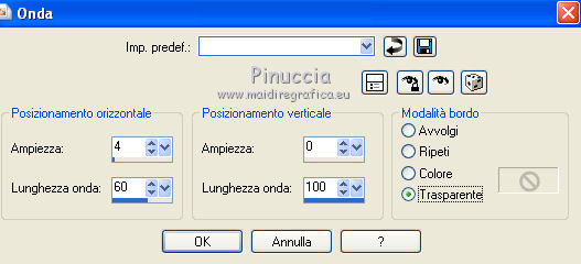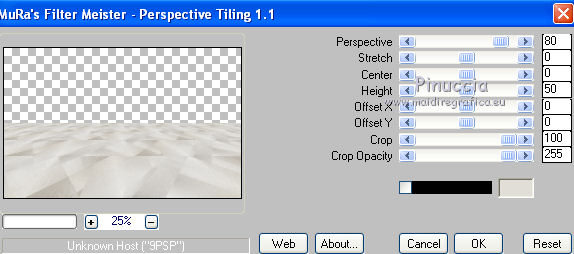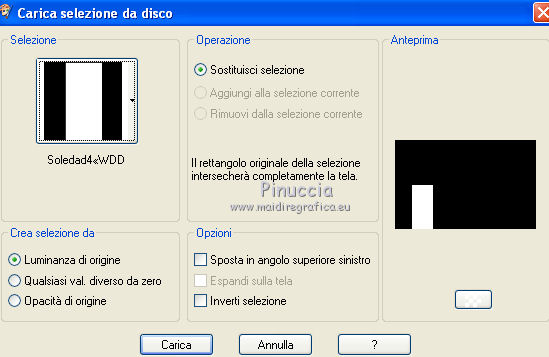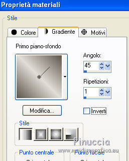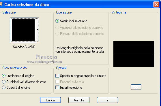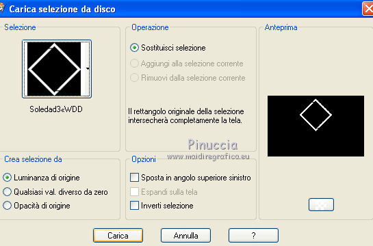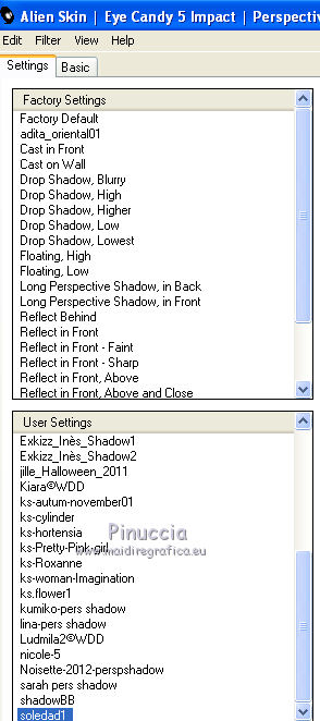 qui puoi trovare qualche risposta ai tuoi dubbi. Se l'argomento che ti interessa non è presente, ti prego di segnalarmelo. Per tradurre questo tutorial ho usato PSP X. Questo tutorial è una creazione di ©Whitediamond e non può essere copiato su altri siti nè essere offerto per il download. Lo stesso vale per la mia traduzione. Il materiale viene da vari gruppi di condivisione. Il copyright appartiene ai rispettivi autori. Grazie ai creatori dei tubes che mettono a disposizione il loro lavoro in vari gruppi di condivisione. Occorrente: Materiale qui I tubes sono di White Diamond. E' vietato utilizzarli per altri lavori, senza il suo permesso. Rispetta il lavoro degli autori, non cambiare il nome del file e non cancellare il watermark. Filtri: consulta, se necessario, la mia sezione filtri qui Filters Unlimited 2.0 qui Tramages - Tow the line qui Adjust - Variations qui Flaming Pear - Flood qui Alien Skin Eye Candy 5 Impact - Perspective Shadow qui FM Tile Tools - Blend Emboss qui Simple qui Simple - bonus qui Penta.com - Jeans qui Mura's Meister - Perspective Tiling qui I filtri Tramages si possono usare sia da soli che importandoli in Filters Unlimited ![]() Metti il preset soledade1 nella cartella del filtro: Alien Skin Eye Candy 5 Impact>Settings>Shadow. Doppio clic sul file e il preset sarà automaticamente installato. Se preferisci puoi importarlo, quando ti servirà, dalla cartella in cui hai scompattato il materiale. Vedi la scheda del filtro qui e come importare un preset in Eye Candy qui Metti le selezioni nella cartella Selezioni. 1. Imposta il colore di primo piano con il colore #5d554a, e il colore di sfondo con #e1ded7. Passa il colore di primo piano a Gradiente, stile lineare, con i seguenti settaggi. ![]() 2. Apri una nuova immagine trasparente 950 x 600 pixels, e riempila con il gradiente.3. Livelli>Duplica. Effetti>Effetti di trama>Manto. ![]() Effetti>Effetti di bordo>Aumenta di più. Regola>Messa a fuoco>Accentua messa a fuoco. 4. Effetti>Plugins>FM Tile Tools - Blend Emboss, con i settaggi standard. ![]() 5. Effetti>Plugins>Simple - Diamonds. 6. Cambia la modalità di miscelatura di questo livello in Schiarisci. Livelli>Unisci>Unisci visibile. 7. Effetti>Plugins>Simple - Top Bottom Wrap. 8. Apri il tube WDD-PA-0016 e vai a Modifica>Copia. Torna al tuo lavoro e vai a Modifica>Incolla come nuovo livello. 9. Regola>Sfocatura>Sfocatura gaussiana - raggio 25. ![]() 10. Effetti>Plugins>Filters Unlimited 2.0 - Tramages - Two the lines. ![]() 11. Effetti>Effetti di distorsione>Onda. ![]() 12. Effetti>Effetti di immagine>Scostamento. ![]() Cambia la modalità di miscelatura di questo livello in Luminanza, e abbassa l'opacità al 63%. 13. Modifica>Incolla come nuovo livello (il tube WDD-PA-0016 è ancora in memoria). 14. Regola>Sfocatura>Sfocatura gaussiana - raggio 25. 15. Effetti>Plugins>Penta.com - Jeans. ![]() 16. Effetti>Plugins>FM Tile Tools - Blend Emboss - 2 volte con i settaggi standard. 17. Regola>Messa a fuoco>Accentua messa a fuoco. 18. Effetti>Effetti di distorsione>Onda. ![]() 19. Effetti>Effetti di immagine>Scostamento. ![]() 20. Cambia la moidalità di miscelatura di questo livello in Luminanza (Esistente) e abbassa l'opacità all'82%. ![]() 21. Livelli>Unisci>Unisci visibile. 22. Livelli>Nuovo livello raster. Riempi con il gradiente di partenza.Livelli>Disponi>Sposta giù. Attiva nuovamente il livello superiore. 23. Effetti>Plugins>Simple - Blintz. 24. Cambia la modalità di miscelatura di questo livello in Luminanza. Livelli>Unisci>Unisci visibile. 25. Effetti>Plugins>Adjust - Variations. Un clic su Original, per annullare eventuali precedenti settaggi memorizzati dal filtro, 1 clic su Lighter e ok. 26. Immagine>Rifletti. 27. Effetti>Plugins>Simple - Blintz. 28. Effetti>Effetti di immagine>Motivo unico. ![]() 29. Effetti>Plugins>Adjust - Variations. Un clic su Original, 1 clic su Lighter e ok. 30. Livelli>Duplica. Effetti>Plugins>Mura's Meister - Perspective Tiling ![]() 31. Selezione>Carica/Salva selezione>Carica selezione da disco. Cerca e carica la selezione soledade1. ![]() Riempi la selezione con il colore #e1ded7,clicca 3 volte per accentuare il colore. Devi cliccare sul bordo della selezione. Probabilmente farai fatica a vedere il colore, ma dopo l'Effetto Ombra lo vedrai. ![]() Selezione>Deseleziona. 32. Effetti>Effetti 3D>Sfalsa ombra. ![]() 33. Apri "paysage" e vai a Modifica>Copia. Torna al tuo lavoro e vai a Modifica>Incolla come nuovo livello. Cambia la modalità di miscelatura di questo livello in Luminanza (Esistente). 34. Effetti>Effetti di immagine>Scostamento. ![]() 35. Effetti>Plugins>Flaming Pear - Flood. ![]() 36. Livelli>Duplica. Immagine>Rifletti. 37. Apri "deco1" e vai a Modifica>Copia. Torna al tuo lavoro e vai a Modifica>Incolla come nuovo livello. 38. Effetti>Effetti di immagine>Scostamento. ![]() 39. Effetti>Effetti 3D>Sfalsa ombra. ![]() 40. Effetti>Plugins>Alien Skin Eye Candy 5 Impact - Perspective Shadow, seleziona il preset Soledad1 e ok. ![]() 41. Livelli>Nuovo livello raster. Selezione>Carica/Salva selezione>Carica selezione da disco. Cerca e carica la selezione soledade2. ![]() Riempi la selezione con il colore nero.42. Abbassa l'opacità di questo livello al 79%. Selezione>Deseleziona. 43. Apri "deco2" e vai a Modifica>Copia. Torna al tuo lavoro e vai a Modifica>Incolla come nuovo livello. 38. Effetti>Effetti di immagine>Scostamento. ![]() Cambia la modalità di miscelatura di questo livello in Luce netta, e abbassa l'opacità al 68%. 39. Livelli>Nuovo livello raster. Selezione>Carica/Salva selezione>Carica selezione da disco. Cerca e carica la selezione soledade3. ![]() Riempi il livello con il colore bianco.Selezione>Deseleziona. 40. Effetti>Effetti 3D>Sfalsa ombra. ![]() Regola>Messa a fuoco>Accentua messa a fuoco. 41. Apri "deco3" e vai a Modifica>Copia. Torna al tuo lavoro e vai a Modifica>Incolla come nuovo livello. 42. Effetti>Effetti di immagine>Scostamento. ![]() 43. Apri WDD-F-0103 e vai a Modifica>Copia. Torn