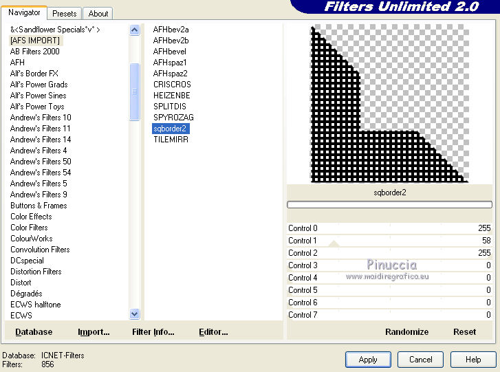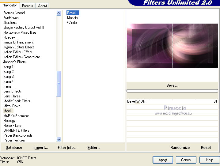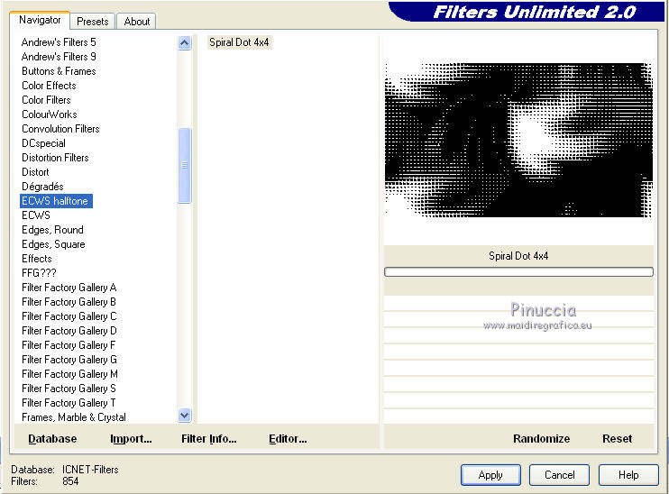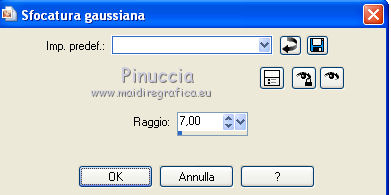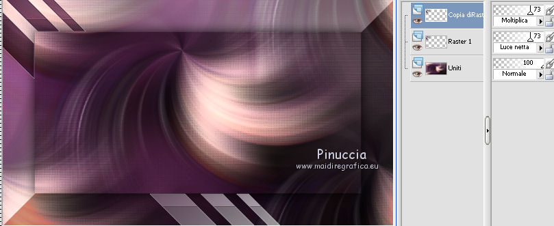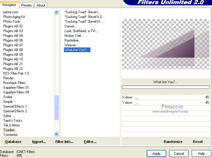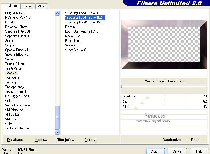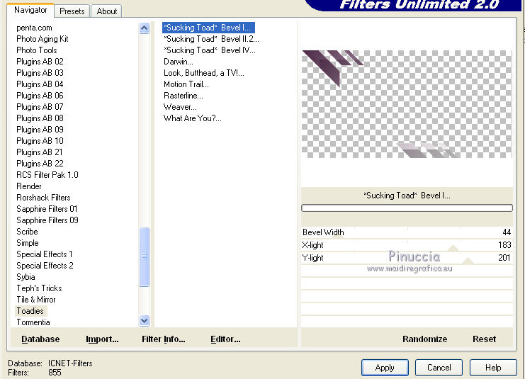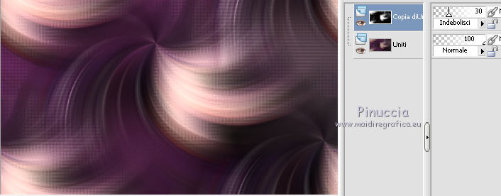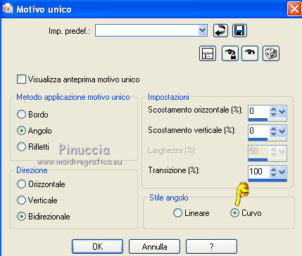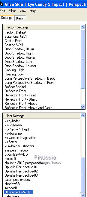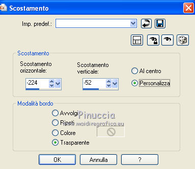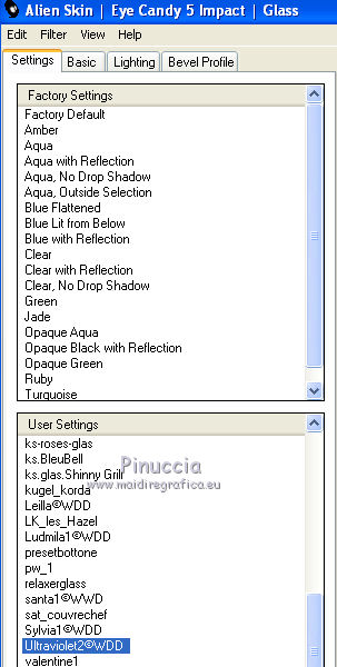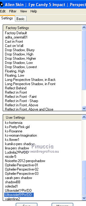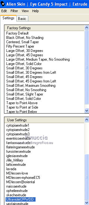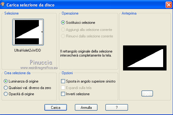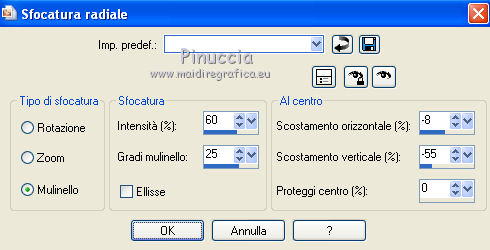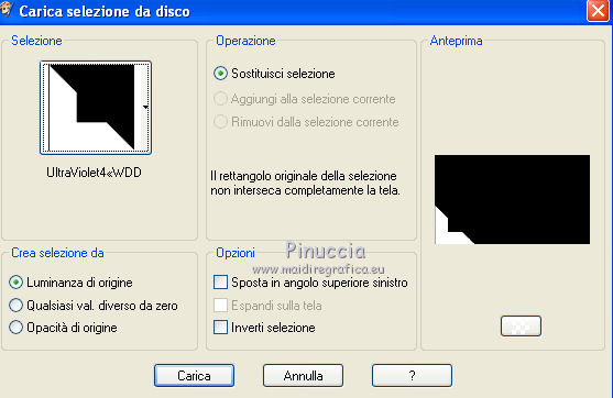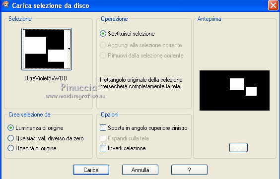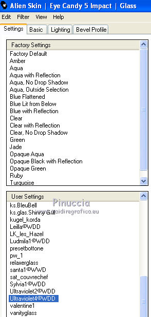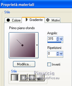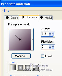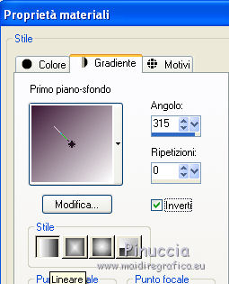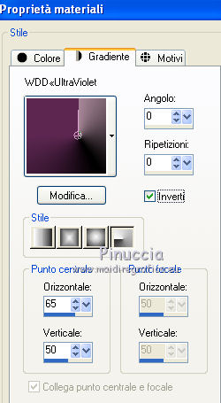 qui puoi trovare qualche risposta ai tuoi dubbi. Se l'argomento che ti interessa non è presente, ti prego di segnalarmelo. Per tradurre questo tutorial ho usato PSP X. Questo tutorial è una creazione di ©Whitediamond e non può essere copiato su altri siti nè essere offerto per il download. Lo stesso vale per la mia traduzione. Il materiale viene da vari gruppi di condivisione. Il copyright appartiene ai rispettivi autori. Grazie ai creatori dei tubes che mettono a disposizione il loro lavoro in vari gruppi di condivisione. Occorrente: Materiale qui Il tube della donna appartiene a NiniDesign Ho ricevuto l'esclusiva per utilizzare questi tubes, il tube è fornito con il suo consenso. Non deve essere condiviso, nè riutilizzato senza il consenso dell'autore. Il resto del materiale appartiene a White Diamond. E' vietato utilizzare questo materiale per altri lavori, senza permesso. E' anche vietato ridistribuirlo e modificarlo. Filtri: consulta, se necessario, la mia sezione filtri qui ECWS Halftone - SpiralDot 4x4 qui Adjust - Variations qui Alien Skin Eye Candy 5 Impact - Perspective Shadow, Glass, Extrude qui Transparency - Eliminate Black qui Filters Unlimited 2.0 qui Mock - Bevel qui Toadies qui AFS Import - sqborder 2 qui ![]() Metti il gradiente nella cartella Gradienti. Metti le selezioni nella cartella Selezioni. Metti i preset nelle rispettive cartelle del filtro Alien Skin Eye Candy 5 Impact>Settings>Shadow, Glass e Extrude. Doppio clic sul file e il preset sarà automaticamente installato. Se preferisci puoi importarlo, quando ti servirà, dalla cartella in cui hai scompattato il materiale. Vedi la scheda del filtro qui e come importare un preset in Eye Candy qui Apri i pennelli ultraviolet1 e ultraviolet2 in PSP ed esportali come Pennello personalizzato (vedi gli appunti sui pennelli qui) 1. Apri una nuova immagine trasparente 950 x 550 pixels. 2. Passa il colore di primo piano a Gradiente, e seleziona il gradiente WDD©Ultraviolet, stile Radiale, con i seguenti settaggi. ![]() 3. Riempi l'immagine trasparente con il gradiente.4. Regola>Sfocatura>Sfocatura gaussiana - raggio 7. ![]() 5. Apri il tube "Nini-Tube-Viena" e vai a Modifica>Copia. non chiuderlo perchè ti servirà ancora Torna al tuo lavoro e vai a Modifica>Incolla come nuovo livello. 6. Immagine>Ruota per gradi - 90 gradi a destra. ![]() 7. Effetti>Effetti di immagine>Motivo unico. ![]() 8. Regola>Sfocatura>Sfocatura radiale. ![]() 9. Effetti>Effetti di immagine>Motivo unico, con i settaggi precedenti. ![]() 10. Livelli>Unisci>Unisci visibile. 11. Livelli>Duplica. 12. Effetti>Plugins>Filters Unlimited 2.0 - ECWS Halftone - SpiralDot 4x4. ![]() 13. Cambia la modalità di miscelatura di questo livello in Indebolisci, e abbassa l'opacità al 30%. ![]() 14. Livelli>Unisci>Unisci visibile. 15. Selezione>Seleziona tutto. Selezione>Modifica>Contrai - 78 pixels. Selezione>Inverti. Selezione>Innalza selezione a livello. 16. Effetti>Plugins>Filters Unlimited 2.0 - Toadies - Sucking Toad Bevel II.2 ![]() 17. Cambia la modalità di miscelatura di questo livello in Luminanza, e abbassa l'opacità al 50%. ![]() Mantieni selezionato. 18. Livelli>Unisci>Unisci visibile. Selezione>Inverti. 19. Effetti>Effetti 3D>Sfalsa ombra. ![]() Selezione>Deseleziona. Dovresti avere questo. ![]() 20. Livelli>Nuovo livello raster. Imposta il colore di primo piano con #3a1734, e il colore di sfondo con il colore bianco #ffffff. Passa il colore di primo piano a Gradiente di primo piano/sfondo, stile Lineare. ![]() 21. Selezione>Carica/Salva selezione>Carica selezione da disco. Cerca e carica la selezione ultraviolet1. ![]() Riempi la selezione con il nuovo gradiente.Selezione>Deseleziona. 22. Cambia la modalità di miscelatura di questo livello in Luce netta, e abbassa l'opacità al 73%. 23. Effetti>Effetti di bordo>Aumenta. Livelli>Duplica. 24. Effetti>Plugins>Filters Unlimited 2.0 - Toadies - Sucking Toad Bevel I ![]() 25. Effetti>Effetti di bordo>Aumenta di più. Cambia la modalità di miscelatura di questo livello in Moltiplica, e mantieni l'opacità al 73%. ![]() 26. Livelli>Unisci>Unisci visibile. Livelli>Nuovo livello raster. 27. Cambia i settaggi del gradiente, togliendo la selezione a Inverti. ![]() 28. Selezione>Carica/Salva selezione>Carica selezione da disco. Cerca e carica la selezione ultraviolet2. ![]() Riempi la selezione con il gradiente.Selezione>Deseleziona. 29. Effetti>Plugins>Filters Unlimited 2.0 - Toadies - What are you? ![]() 30. Effetti>Effetti di bordo>Aumenta di più. Cambia la modalità di miscelatura di questo livello in Luce netta, e abbassa l'opacità al 40%. 31. Effetti>Plugins>Alien Skin Eye Candy 5 impact - Perpective Shadow: seleziona il preset ultraviolet1 e ok. ![]() 32. Livelli>Duplica. Cambia la modalità di miscelatura di questo livello in Filtra, e abbassa l'opacità al 31%. 33. Immagine>Ridimensiona, al 50%, tutti i livelli non selezionato. Immagine>Capovolgi. Immagine>Rifletti. 34. Effetti>Effetti di immagine>Scostamento. ![]() 35. Effetti>Effetti di bordo>Aumenta. Livelli>Unisci>Unisci visibile. Dovresti avere questo. ![]() 36. Selezione>Seleziona tutto. Selezione>Modifica>Contrai - 78 pixels. Selezione>Innalza selezione a livello. 37. Effetti>Plugins>Filters Unlimited 2.0 - Mock - Bevel. ![]() 38. Selezione>Deseleziona. Cambia la modalità di miscelatura di questo livello in Luminanza, e abbassa l'opacità al 84%. 39. Livelli>Unisci>Unisci visibile. 40. Livelli>Nuovo livello raster. Selezione>Carica/Salva selezione>Carica selezione da disco. Cerca e carica la selezione ultraviolet3. ![]() Riempi la selezione con il colore bianco.41. Effetti>Effetti 3D>Sfalsa ombra, con i settaggi precedenti. ![]() 42. Selezione>Modifica>Contrai - 15 pixels. Livelli>Nuovo livello raster. Riporta il colore di primo piano al colore #3a1734, e riempi la selezione con il colore di primo piano #3a1734.43. Effetti>Plugins>Alien Skin Eye Candy 5 Impact - Glass: seleziona il preset ultraviolet2 e ok. ![]() 44. Effetti>Effetti 3