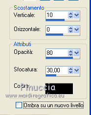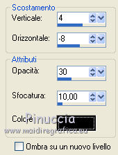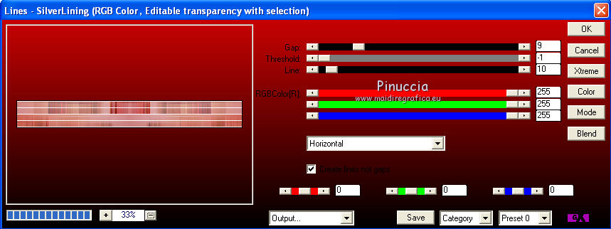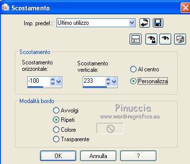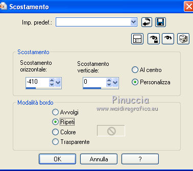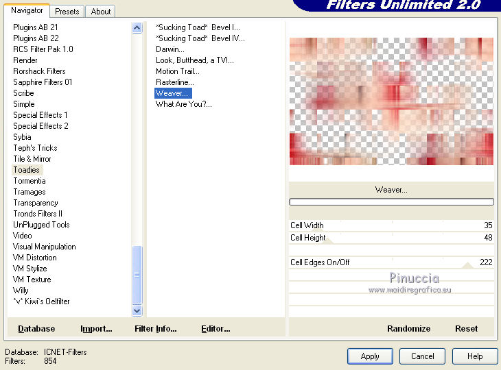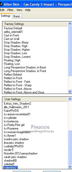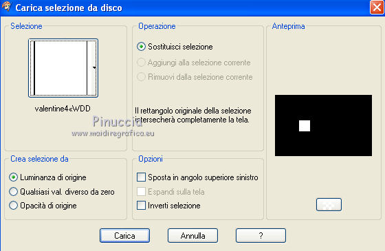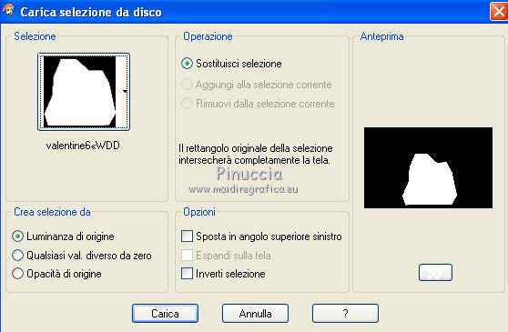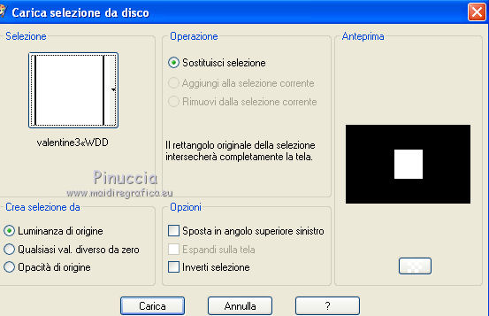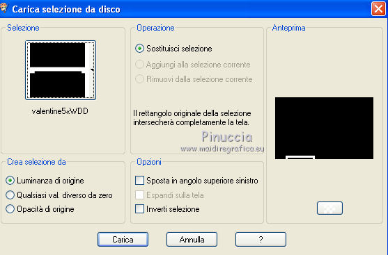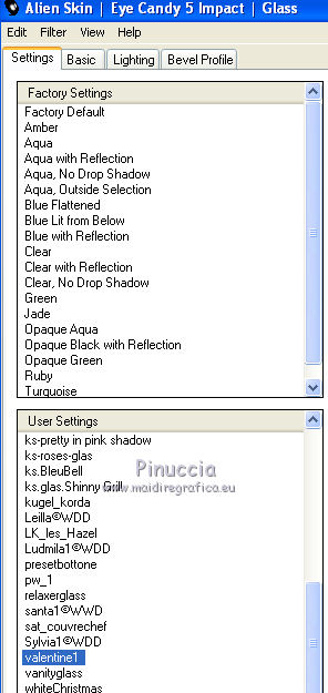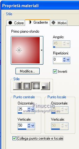 qui puoi trovare qualche risposta ai tuoi dubbi. Se l'argomento che ti interessa non è presente, ti prego di segnalarmelo. Per tradurre questo tutorial ho usato PSP X. Questo tutorial è una creazione di ©Whitediamond e non può essere copiato su altri siti nè essere offerto per il download. Lo stesso vale per la mia traduzione. Il materiale viene da vari gruppi di condivisione. Il copyright appartiene ai rispettivi autori. Grazie ai creatori dei tubes che mettono a disposizione il loro lavoro in vari gruppi di condivisione. Occorrente: Materiale qui Il tube dei vasi è di Guismo che ringrazio per il permesso di usarlo. Il resto del materiale è di White Diamond. E' vietato utilizzare questo materiale per altri lavori, senza il suo permesso. Rispetta il lavoro degli autori, non cambiare il nome del file e non cancellare il watermark. Filtri: consulta, se necessario, la mia sezione filtri qui Filters Unlimited 2.0 qui Toadies qui Adjust - Variations qui AP 01 Innovations - SilverLining qui Alien Skin Eye Candy 5 Impact - Glass, Perspective Shadow qui FM Tile Tools - Blend Emboss qui Simple - Top Left Mirror qui Mura's Meister - Perspective Tiling qui I filtri Toadies si possono usare sia da soli che importandoli in Filters Unlimited ![]() Metti il preset valentine1 e valentine2 nelle rispettive cartelle del filtro: Alien Skin Eye Candy 5 Impact>Settings>Glass e Shadow. Doppio clic sul file e il preset sarà automaticamente installato. Se preferisci puoi importarlo, quando ti servirà, dalla cartella in cui hai scompattato il materiale. Vedi la scheda del filtro qui e come importare un preset in Eye Candy qui Metti le selezioni nella cartella Selezioni. 1. Imposta il colore di primo piano con #9f0100, e il colore di sfondo con #ffffff (bianco). Passa il colore di primo piano a Gradiente, stile Sprazzo di luce, con i seguenti settaggi. ![]() 2. Apri una nuova immagine trasparente 950 x 600 pixels, e riempila con il gradiente.3. Apri il tube "WDD-SV-0006" e vai a Modifica>Copia. minimizza il tube perchè ti servirà ancora Torna al tuo lavoro e vai a Modifica>Incolla come nuovo livello. Lascialo come sta. 4. Immagine>Ruota per gradi - 90 gradi a destra. ![]() 5. Effetti>Effetti di immagine>Motivo unico. ![]() 6. Effetti>Plugins>Filters Unlimited 2.0 - Toadies - Weaver. ![]() Cambia la modalità di miscelatura di questo livello in Moltiplica. Effetti>Effetti di bordo>Aumenta. Livelli>Unisci>Unisci visibile. 7. Effetti>Plugins>Simple - Top left mirror. 8. Apri "fond" e vai a Modifica>Copia. Torna al tuo lavoro e vai a Modifica>Incolla come nuovo livello. Livelli>Unisci>Unisci visibile. 9. Effetti>Plugins>Adjust - Variations. un clic su Original, per annullare eventuali precedenti settaggi memorizzati dal filtro, un clic su Darker e ok. 10. Livelli>Duplica. 11. Effetti>Plugins>Mura's Meister - Perspective Tiling. ![]() 12. Selezione>Carica/Salva selezione>Carica selezione da disco. Cerca e carica la selezione valentine1. ![]() Premi sulla tastiera il tasto CANC. Attiva il livello inferiore. 13. Effetti>Plugins>AP 01 Innovations - Lines SilverLining. ![]() Selezione>Deseleziona. 14. Attiva il livello superiore. Effetti>Plugins>FM Tile Tools - Blend Emboss, con i settaggi standard. ![]() 15. Effetti>Effetti 3D>Sfalsa ombra. ![]() Livelli>Nuovo livello raster. 16. Selezione>Carica/Salva selezione>Carica selezione da disco. Cerca e carica la selezione valentine2. ![]() 17. Riempi la selezione con il colore bianco (tasto destro del mouse).Selezione>Deseleziona. 18. Apri "deco1" e vai a Modifica>Copia. Torna al tuo lavoro e vai a Modifica>Incolla come nuovo livello. 19. Apri "deco2" e vai a Modifica>Copia. Torna al tuo lavoro e vai a Modifica>Incolla come nuovo livello. 20. Selezione>Carica/Salva selezione>Carica selezione da disco. Cerca e carica la selezione valentine3. ![]() Riempi la selezione con il colore bianco (tasto destro del mouse).Selezione>Modifica>Contrai - 20 pixels. Premi sulla tastiera il tasto CANC. Selezione>Modifica>Contrai - 10 pixels. Riempi la selezione con il colore bianco (tasto destro del mouse).Selezione>Modifica>Contrai - 10 pixels. Riempi la selezione con il gradiente.21. Livelli>Nuovo livello raster. Apri "WDD-B01-0011" e vai a Modifica>Copia. Torna al tuo lavoro e vai a Modifica>Incolla nella selezione. Regola>Messa a fuoco>Accentua messa a fuoco. 22. Livelli>Nuovo livello raster. Effetti>Plugins>Alien Skin Eye Candy 5 Impact - Glass seleziona il preset valentine1 e ok. ![]() Selezione>Deseleziona. 23. Livelli>Unisci>Unisci giù - 2 volte. Effetti>Effetti 3D>Sfalsa ombra. ![]() 24. Effetti>Plugins>Alien Skin Eye Candy 5 Impact - Perspective Shadow seleziona il preset Valentine2 e ok. ![]() 25. Livelli>Nuovo livello raster. Selezione>Carica/Salva selezione>Carica selezione da disco. Cerca e carica la selezione valentine4. ![]() Riempi la selezione con il colore bianco (tasto destro del mouse).Selezione>Modifica>Contrai - 20 pixels. Premi sulla tastiera il tasto CANC. Selezione>Modifica>Contrai - 10 pixels. Riempi la selezione con il colore bianco (tasto destro del mouse).Selezione>Modifica>Contrai - 10 pixels. Riempi la selezione con il gradiente.26. Effetti>Plugins>Alien Skin Eye Candy 5 Impact - Glass, con i settaggi precedenti. ![]() Selezione>Deseleziona. 27. Effetti>Effetti 3D>Sfalsa ombra. ![]() 28. Livelli>Duplica. Immagine>Rifletti. Livelli>Unisci>Unisci giù. 29. Apri "Text" e vai a Modifica>copia. Torna al tuo lavoro e vai a Modifica>Incolla come nuovo livello. 30. Effetti>Effetti di immagine>Motivo unico. ![]() 31. Selezione>Carica/Salva selezione>Carica selezione da disco. Cerca e carica la selezione valentine5. ![]() Riempi la selezione con il colore bianco (tasto destro del mouse).Selezione>Deseleziona. 32. Effetti>Effetti 3D>Sfalsa ombra. ![]() 33. Apri il tube "calguisdecoberries06022012" e vai a Modifica>Copia. Torna al tuo lavoro e vai a Modifica>Incolla come nuovo livello. Non spostarlo. Lascialo come sta. Lo sposterai con l'Effetto Scostamento al p
