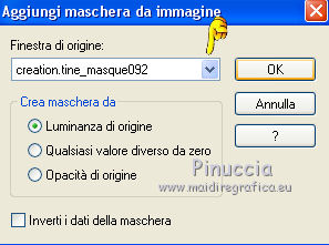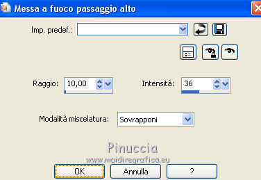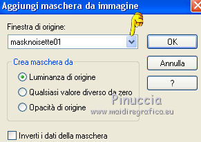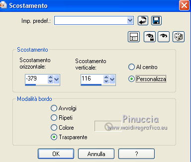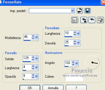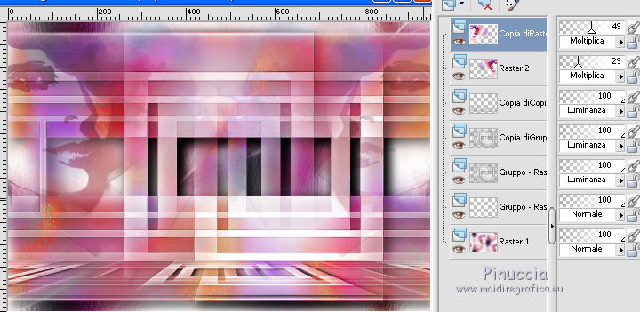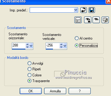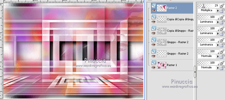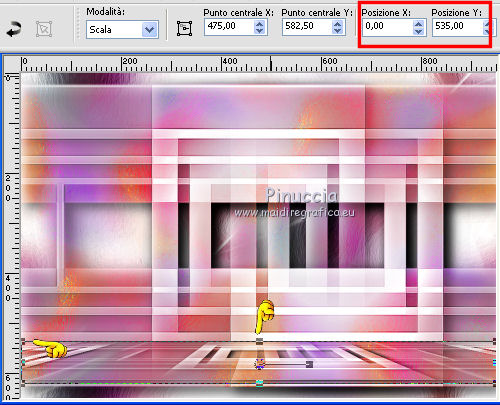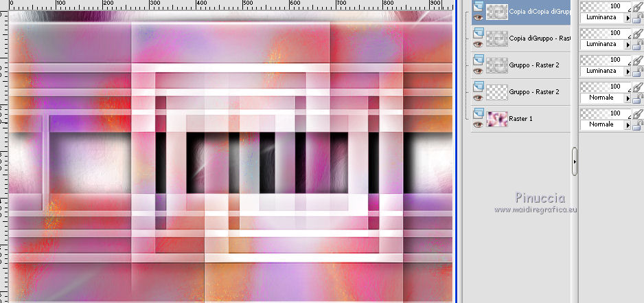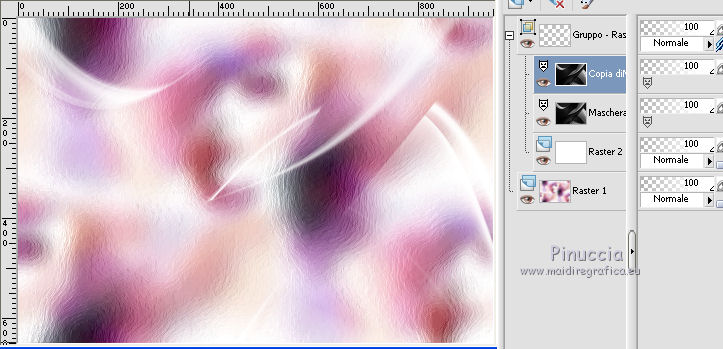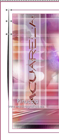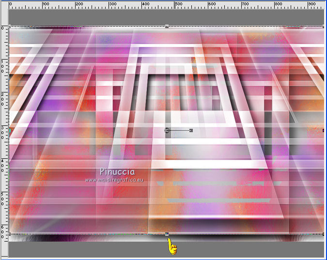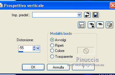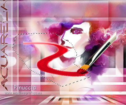 qui puoi trovare qualche risposta ai tuoi dubbi. Se l'argomento che ti interessa non è presente, ti prego di segnalarmelo. Questo tutorial è stato realizzato con Corel18 e tradotto con Corel X, ma può essere realizzato anche con le altre versioni di PSP. Dalla versione X4, il comando Immagine>Rifletti è stato sostituito con Immagine>Capovolgi in orizzontale, e il comando Immagine>Capovolgi con Immagine>Capovolgi in verticale. Nelle versioni X5 e X6, le funzioni sono state migliorate rendendo disponibile il menu Oggetti. Con la nuova versione X7, sono tornati Rifletti>Capovolgi, ma con nuove varianti. Vedi la scheda sull'argomento qui Occorrente: Materiale qui I tubes sono di Guismo e Claudia Viza. Le maschere sono di Tine e Noisette. Il resto del materiale è di Yedralina. Filtri: se hai problemi con i filtri, consulta la mia sezione filtri qui Alien Skin Eye Candy 5 Impact - Perspective Shadow qui ![]() non esitare a cambiare modalità di miscelatura e opacità secondo i colori utilizzati. Nelle ultime versioni di PSP non c'è il gradiente di primo piano/sfondo (Corel_06_029) Trovi i gradienti delle versioni precedenti qui Apri le maschere in PSP e minimizzale con il resto del materiale. 1. Imposta il colore di primo piano con il colore bianco #ffffff. 2. Apri una nuova immagine trasparente 950 x 650 pixels, e riempila con il colore bianco.Selezione>Seleziona tutto. Apri il tube calguismisted10032015, e vai a Modifica>Copia. Torna al tuo lavoro e vai a Modifica>Incolla nella selezione. Selezione>Deseleziona. Effetti>Effetti di immagine>Motivo unico. ![]() Regola>Sfocatura>Sfocatura gaussiana - raggio 15. ![]() Effetti>Effetti tecniche di disegno>Pennellate. ![]() 2. Livelli>Nuovo livello raster. Riempi con il colore bianco.Livelli>Nuovo livello maschera>Da immagine. Apri il menu sotto la finestra di origine e vedrai la lista dei files aperti. Seleziona la maschera creation.tine_masque092, con i seguenti settaggi. ![]() Livelli>Duplica. ![]() Livelli>Unisci>Unisci gruppo. Effetti>Effetti di immagine>Motivo unico, con i settaggi precedenti. ![]() 3. Livelli>Nuovo livello raster. Riempi con il colore bianco.Livelli>Nuovo livello maschera>Da immagine. Apri il menu sotto la finestra di origine e seleziona la maschera masknoisette01. ![]() Livelli>Unisci>Unisci gruppo. Effetti>Plugins>Alien Skin Eye Candy 5 Impact - Perspective Shadow. Seleziona il preset Drop shadow, Blurry e ok. ![]() Cambia la modalità di miscelatura di questo livello in Luminanza. 4. Livelli>Duplica - 2 volte. ![]() Effetti>Effetti geometrici>Prospettiva verticale. ![]() Premi il tasto K per attivare lo strumento Puntatore ![]() se stai usando PSP 9 il tasto D per attivare lo strumento Deformazione ![]() in modalità Scala , spingi il nodo inferiore centrale verso l'alto fino al bordo del livello di sfondo. ![]() e il nodo superiore centrale verso il basso (se non visualizzi i Righelli, vai a Visualizza>Righelli) ![]() Tasto M per deselezionare lo strumento. 5. Attiva nuovamente il tube calguismisted10032015, e vai a Modifica>Copia. Torna al tuo lavoro e vai a Modifica>Incolla come nuovo livello. Immagine>Ridimensiona, all'80%, tutti i livelli non selezionato. Spostalo in alto a destra.Cambia la modalità di miscelatura di questo livello in Moltiplica, e abbassa l'opacità al 29%. ![]() 6. Livelli>Duplica. Immagine>Rifletti (con Corel17/18: Immagine>Rifletti>Rifletti orizzontalmente). Mantieni la modalità di miscelatura in Moltiplica, e aumenta l'opacità al 49%. ![]() 7. Modifica>Incolla come nuovo livello (il tube calguismisted10032015 è ancora in memoria). Immagine>Ridimensiona, al 45%, tutti i livelli non selezionato. Effetti>Effetti di immagine>Scostamento. ![]() 8. Apri il tube Deco0123©Yedralina, e vai a Modifica>Copia. Torna al tuo lavoro e vai a Modifica>Incolla come nuovo livello. Effetti>Effetti di immagine>Scostamento. ![]() Livelli>Duplica. Effetti>Effetti di immagine>Scostamento. ![]() 9. Apri il tube Text_Acuarela©Yedralina, e vai a Modifica>Copia. Torna al tuo lavoro e vai a Modifica>Incolla come nuovo livello. Effetti>Effetti di immagine>Scostamento. ![]() 10. Per i bordi: Imposta il colore di primo piano con #9e0849, e il colore di sfondo con #6d144d. ![]() Immagine>Aggiungi bordatura, 2 pixels, simmetriche, colore di primo piano. Immagine>Aggiungi bordatura, 20 pixels, simmetriche, colore bianco. Immagine>Aggiungi bordatura, 2 pixels, simmetriche, colore di sfondo. Immagine>Aggiungi bordatura, 45 pixels, simmetriche, colore bianco. Immagine>Aggiungi bordatura, 2 pixels, simmetriche, colore di primo piano. 11. Apri il tube tubeclaudiaviza-mix87, e vai a Modifica>Copia. Torna al tuo lavoro e vai a Modifica>Incolla come nuovo livello. Immagine>Ridimensiona, all'80%, tutti i livelli non selezionato. Per il momento, non spostare il tube. Attiva lo strumento Selezione a mano libera ![]() e seleziona la punta del pennello e il tratto colorato. ![]() Colora a tuo piacimento con un colore scelto dalla tua immagine. Puoi usare il Viraggio o lo strumento Trasforma in destinazione ![]() Selezione>Deseleziona. Effetti>Plugins>Alien Skin Eye Candy 5 Impact - Perspective Shadow. Seleziona il preset Drop Shadow, Low e ok. ![]() Effetti>Effetti di immagine>Scostamento. ![]() 12. Apri il tube Barra_separadora5, e vai a Modifica>Copia. Torna al tuo lavoro e vai a Modifica>Incolla come nuovo livello. Immagine>Ruota per gradi - 90 gradi a sinistra. ![]() Sposta il tube sulla linea del bordo in alto a sinistra.![]() Livelli>Duplica. Immagine>Capovolgi (con Corel X17/18: Immagine>Rifletti>Rifletti verticalmente). 13. Firma il tuo lavoro su un nuovo livello. Livelli>Unisci>Unisci tutto. Immagine>Ridimensiona, a 950 pixels di larghezza, tutti i livelli selezionato. Regola>Messa a fuoco>Messa a fuoco passaggio alto. ![]() Salva in formato jpg. Il tube di questo esempio è di Guismo ![]() ![]() Le vostre versioni. Grazie ![]() Olimpia ![]() Rossella ![]() Annuska Se hai problemi o dubbi, o trovi un link non funzionante, 