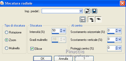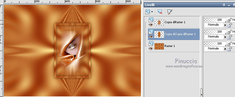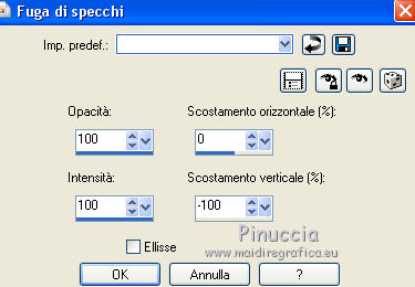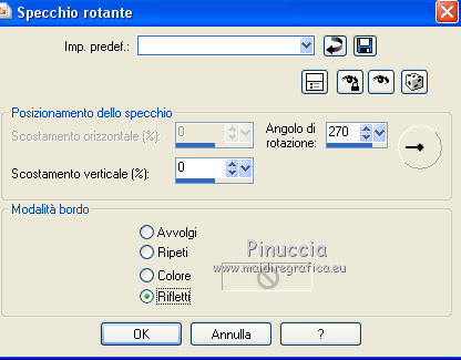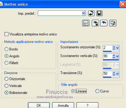 qui puoi trovare qualche risposta ai tuoi dubbi. Se l'argomento che ti interessa non è presente, ti prego di segnalarmelo. Questo tutorial è stato realizzato con Corel19 e tradotto con Corel X e CorelX17, ma può essere realizzato anche con le altre versioni di PSP. Dalla versione X4, il comando Immagine>Rifletti è stato sostituito con Immagine>Capovolgi in orizzontale, e il comando Immagine>Capovolgi con Immagine>Capovolgi in verticale. Nelle versioni X5 e X6, le funzioni sono state migliorate rendendo disponibile il menu Oggetti. Con la nuova versione X7, sono tornati Rifletti>Capovolgi, ma con nuove varianti. Vedi la scheda sull'argomento qui traduzione in francese/traduction en français qui/icitraduzione in inglese/english translation qui/hereVersioni/Versions qui Occorrente: il misted di un viso di donna Il resto del materiale qui Il tube usato e non fornito è di Coleçao (©LDesigns). Il testo è di Yedralina. Filtri: se hai problemi con i filtri, consulta la mia sezione filtri qui Filters Unlimited 2.0 qui AFS IMPORT - sqborder2 qui Mehdi - Wavy lab 1.1 qui Facoltativo: Nik Software - Color Efex qui I filtri AFS IMPORT si possono usare da soli o importati in Filters Unlimited (come fare vedi qui) Se un filtro fornito appare con questa icona ![]() non esitare a cambiare modalità di miscelatura e opacità secondo i colori utilizzati. colori utilizzati ![]() 1. Imposta il colore di primo piano con il colore scuro #b65417, e il colore di sfondo con il colore chiaro #fff3c1. ![]() 2. Apri una nuova immagine trasparente 900 x 600 pixels. 3. Effetti>Plugins>Mehdi - Wavy Lab 1.1 Questo filtro lavora con i colori della paletta; il primo è il colore di sfondo, il secondo quello di primo piano; mantieni gli altri due colori creati dal filtro. ![]() 4. Effetti>Effetti di immagine>Motivo unico. ![]() 5. Regola>Sfocatura>Sfocatura radiale. ![]() 6. Livelli>Duplica. Immagine>Capovolgi. Cambia la modalità di miscelatura di questo livello in Moltiplica. 7. Livelli>Unisci>Unisci giù. 8. Livelli>Duplica. Immagine>Ridimensiona, al 40%, tutti i livelli non selezionato. 9. Immagine>Ruota per gradi - 90 gradi a destra. ![]() 10. Livelli>Duplica. Effetti>Effetti di riflesso>Fuga di specchi. ![]() 11. Effetti>Effetti di riflesso>Specchio rotante. ![]() 12. Livelli>Disponi>Sposta giù. Attiva nuovamente il livello superiore. 13. Selezione>Seleziona tutto. Selezione>Mobile. Selezione>Immobilizza. 14. Selezione>Modifica>Contrai - 13 pixels. Selezione>Innalza selezione a livello. 15. Regola>Sfocatura>Sfocatura radiale, con i settaggi precedenti. ![]() 16. Apri il misted e vai a Modifica>Copia. Torna al tuo lavoro e vai a Modifica>Incolla nella selezione. 17. Selezione>Inverti. Effetti>Effetti 3D>Sfalsa ombra, colore nero. ![]() Selezione>Deseleziona. 18. Livelli>Unisci>Unisci giù. 19. Effetti>Effetti 3D>Sfalsa ombra, con i settaggi precedenti. 20. Attiva il livello sottostante, la seconda copia di Raster 1. ![]() 21. Effetti>Effetti geometrici>Cerchio. ![]() 22. Livelli>Duplica. Immagine>Ruota per gradi, con i settaggi precedenti. ![]() 23. Livelli>Unisci>Unisci giù. 24. Livelli>Duplica. Immagine>Ruota per gradi - 45 gradi a destra. ![]() 25. Effetti>Effetti 3D>Sfalsa ombra, con i settaggi precedenti. Livelli>Unisci>Unisci giù. Effetti>Effetti 3D>Sfalsa ombra, con i settaggi precedenti. 26. Effetti>Effetti di immagine>Motivo unico. ![]() 27. Attiva il livello superiore (copia di Raster 1). Immagine>Ruota per gradi, con i settaggi precedenti. ![]() 28. Oggetti>Allinea>Sinistra Se stai lavorando con una versione precedente che non dispone del menu Oggetti, usa lo strumento Spostamento ![]() ![]() 29. Livelli>Duplica. Effetti>Effetti di immagine>Motivo unico, con i settaggi precedenti. ![]() 30. Livelli>Disponi>Sposta giù. 31. Modifica>Incolla come nuovo livello (il misted è sempre in memoria). Immagine>Ridimensiona, se e quanto necessario, tutti i livelli non selezionato. Spostalo in alto, più o meno sulla stella centrale.![]() Facoltativo: Cambia la modalità di miscelatura di questo livello in Luminanza (esistente). Livelli>Disponi>Sposta giù. 32. Attiva il livello inferiore, Raster 1. Livelli>Duplica. 33. Effetti>Effetti geometrici>Prospettiva verticale. ![]() 34. Effetti>Effetti di riflesso>Specchio rotante, con i settaggi precedenti. ![]() 35. Immagine>Aggiungi bordatura, 2 pixels, simmetriche, colore chiaro. Immagine>Aggiungi bordatura, 4 pixels, simmetriche, colore scuro. 36. Effetti>Plugins>AFS IMPORT - sqborder2. ![]() 37. Apri il testo Text_Adele©Yedralina e vai a Modifica>Copia. Torna al tuo lavoro e vai a Modifica>Incolla come nuovo livello. Cambia la modalità di miscelatura di questo livello in Luminanza (esistente), o altro, secondo i tuoi colori. Se preferisci, puoi scrivere un tuo testo. Per questo testo è stato usato il font AphroditePro (lo trovi nel materiale), colore di sfondo: con i tuoi colori, crea un Gradiente di primo piano/sfondo, stile Lineare. ![]() 38. Livelli>Unisci>Unisci visibile. 39. Firma il tuo lavoro su un nuovo livello. 40. Immagine>Ridimensiona, 900 pixels di larghezza, tutti i livelli selezionato. 41. Livelli>Unisci>Unisci tutto. 42. Facoltativo: Effetti>Plugins>Nik Software - Color Efex Pro - Graduated Neutral Density ![]() 43. Salva in formato jpg. Il tube di questo esempio è di MMDesignz ![]() ![]() Puoi scrivermi se hai problemi o dubbi, o trovi un link che non funziona, o soltanto per un saluto. 10 marzo 2018 |