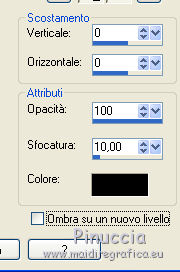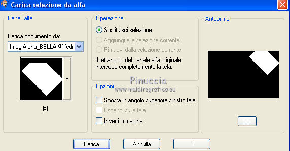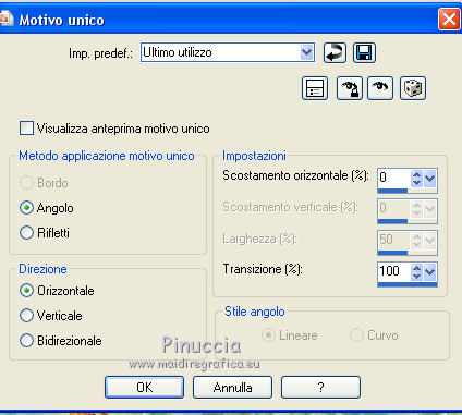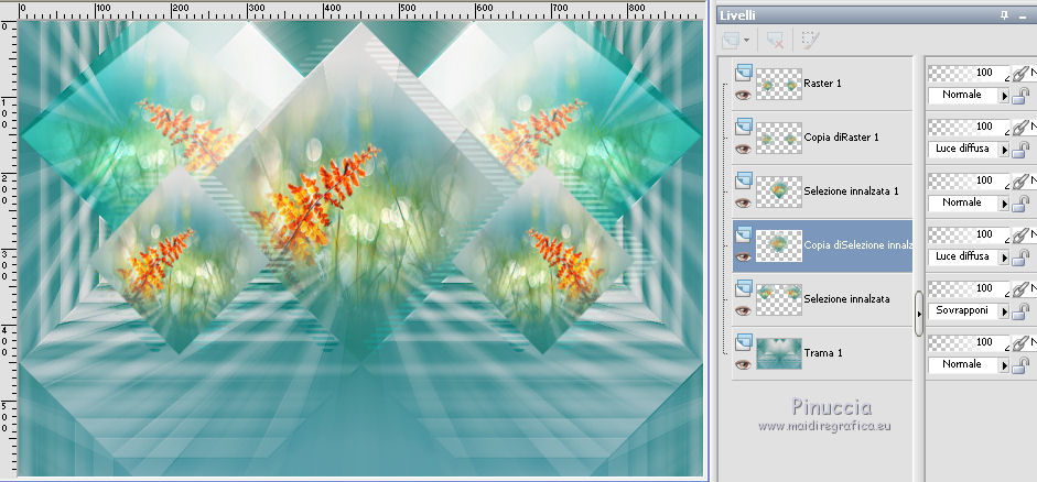 qui puoi trovare qualche risposta ai tuoi dubbi. Se l'argomento che ti interessa non è presente, ti prego di segnalarmelo. Questo tutorial è stato realizzato con Corel19 e tradotto con CorelX e CorelX2 e CorelX3, ma può essere realizzato anche con le altre versioni di PSP. Dalla versione X4, il comando Immagine>Rifletti è stato sostituito con Immagine>Capovolgi in orizzontale, e il comando Immagine>Capovolgi con Immagine>Capovolgi in verticale. Nelle versioni X5 e X6, le funzioni sono state migliorate rendendo disponibile il menu Oggetti. Con la nuova versione X7, sono tornati Rifletti>Capovolgi, ma con nuove varianti. Vedi la scheda sull'argomento qui traduzione in francese/traduction en français qui/icitraduzione in inglese/english translation qui/hereVersioni/Versions qui Occorrente: Tubes a scelta. Il resto del materiale qui Grazie agli autori per il materiale: Tube della donna, non fornito, di Mina (Mina@.5056 bimba 12.17) Misted, non fornito, di Cal (CAL-2850-071418). Pennello di Pinuccia (sonolepiccole cose) (trovi i pennelli di Pinuccia qui Il resto del materiale è di Yedralina. (in questa pagina trovi i links ai siti dei creatori di tubes) Filtri: se hai problemi con i filtri, consulta la mia sezione filtri qui Alien Skin Eye Candy 5 Impact - Perspective Shadow qui AAA Frames - Foto Frame qui Cybia Screenworks - Point Array qui Filters Unlimited 2.0 qui FM Tile Tools - Blend Emboss qui Simple - Blintz qui VM Natural - Lightburst - Lakeside Reflection qui VM Extravaganza - Transmission qui Mehdi - Sorting Tiles qui Mehdi - Wavy Lab 1.1 qui I filtri Simple, VM Natural, VM Extravaganza et Cybia (Screenworks) si possono usare da soli o importati in Filters Unlimited (come fare vedi qui) Se un filtro fornito appare con questa icona ![]() non esitare a cambiare modalità di miscelatura e opacità secondo i colori utilizzati. Metti il preset Cliccando sul file una o due volte (a seconda delle tue impostazioni), automaticamente il preset si installerà nella cartella corretta. perchè uno o due clic vedi qui Se preferisci, puoi importare direttamente il preset nel corso del tutorial Come fare vedi la scheda del filtro Eye Candy qui Metti il pennello nella cartella Pennelli. Attenzione, il pennello è composto da due files che non devono essere separati. Vedi gli appunti sui pennelli qui Metti il preset Preset_Pick_262-©Yedralina nella cartella Impostazioni predefinite. 1. Imposta il colore di primo piano con #154f4a, e il colore di sfondo con #bfb9b6. ![]() Apri Image Alpha Bella-©Yedralina. Finestra>Duplica, o sulla tastiera maiuscola+D, per fare una copia. Chiudi l'originale. La copia, che sarà la base del tuo lavoro, non è vuota, ma contiene le selezioni salvate sul canale alfa. 2. Effetti>Plugins>Mehdi - Wavy Lab 1.1 Questo filtro crea gradienti con i colori della tua paletta: il primo è il colore di sfondo, il secondo quello di primo piano; mantieni gli ultimi due colori creati dal filtro. ![]() 3. Effetti>Plugins>VM Natural - Lakeside Reflection, con i settaggi standard. ![]() 4. Effetti>Plugins>Mehdi - Sorting Tiles. ![]() 5. Effetti>Effetti di riflesso>Specchio rotante. ![]() 6. Effetti>Plugins>VM Natural - Lightburst, con i settaggi standard. ![]() 7. Effetti>Plugins>Filters Unlimited 2.0 - Simple - Blintz. ![]() 8. Effetti>Effetti di riflesso>Specchio rotante, con i settaggi standard. ![]() 9. Effetti>Plugins>FM Tile Tools - Blend Emboss, con i settaggi standard. ![]() 10. Selezione>Carica/Salva selezione>Carica selezione da canale alfa. La selezione #1 è subito disponibile. Devi soltanto cliccare Carica. ![]() Selezione>Innalza selezione a livello. Apri il misted del paesaggio e vai a Modifica>Copia. Torna al tuo lavoro e vai a Modifica>Incolla nella selezione. Selezione>Deseleziona. 11. Effetti>Effetti di riflesso>Specchio rotante, con i settaggi standard. ![]() Cambia la modalità di miscelatura di questo livello in Sovrapponi, o altro. 12. Attiva il livello di sfondo, Trama 1. Livelli>Nuovo livello raster. Selezione>Carica/Salva selezione>Carica selezione da canale alfa. apri il menu delle selezioni e carica selezione #2. ![]() Selezione>Innalza selezione a livello. Modifica>Incolla nella selezione (il misted del paesaggio è ancora in memoria). Livelli>Disponi>Sposta su. Selezione>Deseleziona. 13. Modifica>Copia. Livelli>Nuovo livello raster. Selezione>Carica/Salva selezione>Carica selezione da canale alfa. apri il menu delle selezioni e carica la selezione #3. ![]() Modifica>Incolla nella selezione. Selezione>Deseleziona. Livelli>Duplica. Immagine>Rifletti. Livelli>Unisci>Unisci giù. 14. Livelli>Duplica. Effetti>Plugins>VM Extravaganza - Transmission. ![]() Livelli>Disponi>Sposta giù. Cambia la modalità di miscelatura di questo livello in Luce diffusa. 15. Attiva il livello sottostante, Selezione innalzata 1. ![]() Livelli>Duplica. Effetti>Plugins>VM Extravaganza, Transmission, con i settaggi precedenti. ![]() Livelli>Disponi>Sposta giù. Cambia la modalità di miscelatura di questo livello in Luce diffusa. ![]() 16. Attiva il livello di sfondo. Selezione>Carica/Salva selezione>Carica selezione da canale alfa. Apri il menu delle selezioni e carica la selezione #4. ![]() Modifica>Taglia (questo comando tiene anche in memoria). Livelli>Nuovo livello raster. Modifica>Incolla nella selezione. Livelli>Disponi>Porta in alto. 17. Regola>Sfocatura>Sfocatura gaussiana - raggio 25. ![]() 18. Effetti>Plugins>Cybia - Screenworks - Point Array. ![]() 19. Effetti>Effetti di immagine>Motivo unico. ![]() 20. Effetti>Effetti 3D>Sfalsa ombra, colore nero. ![]() Cambia la modalità di miscelatura di questo livello in Filtra. Effetti>Effetti di bordo>Aumenta di più. Mantieni selezionato. 21. Livelli>Nuovo livello raster. Riempi con il colore scuro di primo piano.Livelli>Disponi>Sposta giù. Selezione>Deseleziona. 22, Apri il tube deco00204©Yedralina e vai a Modifica>Copia. Torna al tuo lavoro e vai a Modifica>Incolla come nuovo livello. Tasto K sulla tastiera per attivare l