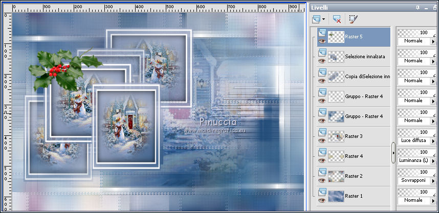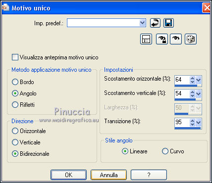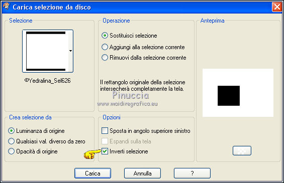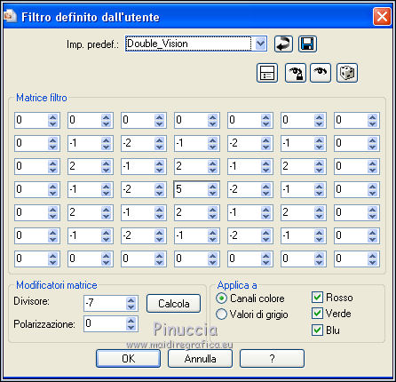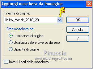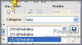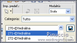 qui puoi trovare qualche risposta ai tuoi dubbi. Se l'argomento che ti interessa non è presente, ti prego di segnalarmelo. Questo tutorial è stato realizzato con Corel19 e tradotto con CorelX7, CorelX2 e CorelX3, ma può essere realizzato anche con le altre versioni di PSP. Dalla versione X4, il comando Immagine>Rifletti è stato sostituito con Immagine>Capovolgi in orizzontale, e il comando Immagine>Capovolgi con Immagine>Capovolgi in verticale. Nelle versioni X5 e X6, le funzioni sono state migliorate rendendo disponibile il menu Oggetti. Con la nuova versione X7, sono tornati Rifletti>Capovolgi, ma con nuove varianti. Vedi la scheda sull'argomento qui traduzione in francese/traduction en français qui/icitraduzione in inglese/english translation qui/hereVersioni/Versions qui ![]() Occorrente: Tube a scelta. Il resto del materiale qui Per i tubes usati e non forniti, grazie tube della donna Mina (Mina@.Lady7.29.11) misted di Sylvie (Mist_Christmas2_28.11.2015) tube deco di Animabelle (86_tube_noel_p1_animabelle) Per la maschera grazie Ildiko (ildiko_maszk_2016_29). Il resto del materiale è di Yedralina. (in questa pagina trovi i links ai siti dei creatori di tubes) Filtri: se hai problemi con i filtri, consulta la mia sezione filtri qui Filters Unlimited 2.0 qui Mehdi - Sorting Tiles qui AFS IMPORT - Tremorsc qui Simple - Half Wrap qui Alien Skin Xenofex 2 - Constellation qui AAA Frames - Foto Frame / AAA Filters - Custom (facoltativo) qui I filtri AFS IMPORT e Simple si possono usare da soli o importati in Filters Unlimited (come fare vedi qui) Se un filtro fornito appare con questa icona Facoltativo Animation Shop qui ![]() non esitare a cambiare modalità di miscelatura e opacità secondo i colori utilizzati. Nelle ultime versioni di PSP non c'è il gradiente di primo piano/sfondo (Corel_06_029) Puoi usare i gradienti delle versioni precedenti. Trovi qui i gradienti Corel X. Metti i preset nella cartella Impostazioni predefinite. Metti la selezione nella cartella Selezioni. Apri la maschera in PSP e minimizzala con il resto del materiale. 1. Imposta il colore di primo piano con #e9e1f0, e il colore di sfondo con #234d7a ![]() Passa il colore di primo piano a Gradiente di primo piano/sfondo, stile Lineare. ![]() Apri una nuova immagine trasparente 950 x 650 pixels. Riempi l'immagine trasparente con il gradiente.Effetti>Plugins>Mehdi - Sorting Tiles. ![]() Effetti>Plugins>Filters Unlimited 2.0 - AFS IMPORT - TREMORSC ![]() Effetti>Effetti di immagine>Motivo unico, Fianco a fianco. ![]() Effetti>Effetti di immagine>Motivo unico, intermittente diagonale. ![]() Effetti>Effetti di bordo>Aumenta. 2. Livelli>Nuovo livello raster. Selezione>Seleziona tutto. Apri il tuo misted e vai a Modifica>Copia. Torna al tuo lavoro e vai a Modifica>Incolla nella selezione. Effetti>Plugins>Filters Unlimited 2.0 - Simple - Half Wrap. ![]() Regola>Sfocatura>Sfocatura gaussiana - raggio 20. ![]() Cambia la modalità di miscelatura di questo livello in Sovrapponi, o a tuo piacimento. 3. Livelli>Nuovo livello raster. Selezione>Carica/Salva selezione>Carica selezione da disco. Cerca e carica la selezione ©Yedralina-sel_626 Inverti selezionato. ![]() Modifica>Incolla nella selezione (il tuo misted è ancora in memoria). Cambia la modalità di miscelatura di questo livello in Luce diffusa. Selezione>Inverti. 4. Attiva il livello di sfondo. Selezione>Carica/Salva selezione>Carica selezione da disco. Carica nuovamente la selezione ©Yedralina-sel_626, questa volta deseleziona Inverti. ![]() Selezione>Innalza selezione a livello. Livelli>Disponi>Porta in alto. Regola>Sfocatura>Sfocatura gaussiana - raggio 20. ![]() Selezione>Modifica>Contrai - 5 pixels. Livelli>Nuovo livello raster. Imposta il colore di primo piano con il colore bianco. Riempi il livello con il colore bianco.Selezione>Modifica>Contrai - 5 pixels. Premi sulla tastiera il tasto CANC ![]() Selezione>Modifica>Contrai - 10 pixels. Riempi nuovamente con il colore bianco.Selezione>Modifica>Contrai - 5 pixels. Premi sulla tastiera il tasto CANC. Modifica>Incolla nella selezione (il tuo misted è sempre in memoria). Regola>Messa a fuoco>Metti a fuoco. Selezione>Inverti. Effetti>Effetti 3D>Sfalsa ombra, colore nero. ![]() Selezione>Deseleziona. Livelli>Unisci>Unisci giù. Livelli>Duplica. 5. Tasto K sulla tastiera per attivare lo strumento Puntatore ![]() Apri il menu delle impostazioni e seleziona il preset 270-©Yedralina ![]() e avrai questo ![]() Livelli>Unisci>Unisci giù. Livelli>Duplica. Effetti>Effetti di immagine>Motivo unico. ![]() Immagine>Capovolgi>Capovolgi orizzontale questo comando Riflette l'immagine mantenendola nella stessa posizione; se stai lavorando con una versione precedente: Immagine>Rifletti e imposta la medesima posizione con lo strumento Puntatore ![]() ![]() Strumento Puntatore ![]() Apri il menu delle impostazioni e seleziona il preset 271-©Yedralina ![]() e avrai questo ![]() Livelli>Disponi>Sposta giù. Attiva nuovamente il livello superiore. Strumento Puntatore ![]() Apri il menu delle impostazioni e seleziona il preset 272-©Yedralina ![]() e avrai questo ![]() Tasto M per deselezionare lo strumento. 6. Livelli>Nuovo livello raster. Riempi con il colore scuro di sfondo.Livelli>Nuovo livello maschera>Da immagine. Apri il menu sotto la finestra di origine e vedrai la lista dei files aperti. Seleziona la maschera ildiko_maszk_2016_29. ![]() Livelli>Unisci>Unisci gruppo. Effetti>Filtro definito dall'utente - seleziona il preset Double_vision e ok. ![]() Livelli>Disponi>Sposta giù - 2 volte. Ripeti il passo 6 con il colore bianco: Livelli>Nuovo livello raster. Riempi con il colore bianco.Livelli>Nuovo livello maschera>Da immagine. Apri il menu sotto la finestra di origine e seleziona ancora la maschera ildiko_maszk_2016_29. ![]() Livelli>Unisci>Unisci gruppo. Effetti>Filtro definito dall'utente, con i settaggi precedenti. Immagine>Rifletti. Effetti>Effetti di distorsione>Allarga (nelle versioni più recenti è diventato Espan