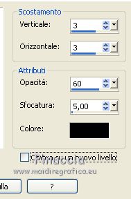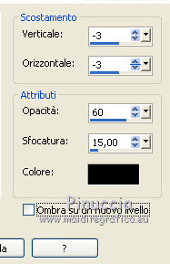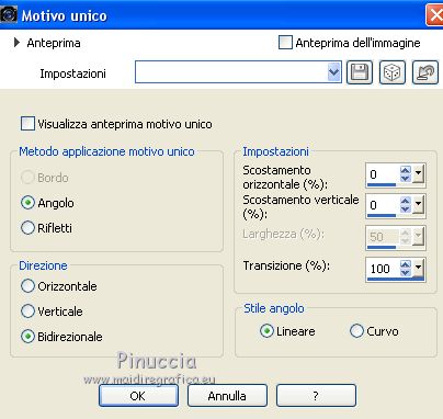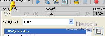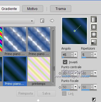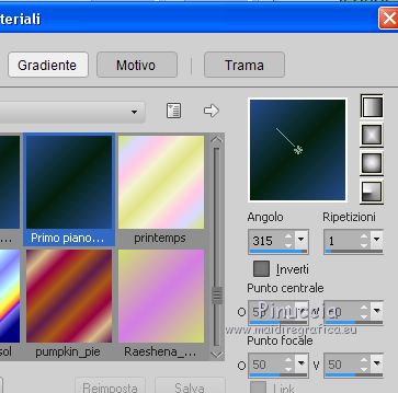 qui puoi trovare qualche risposta ai tuoi dubbi. Se l'argomento che ti interessa non è presente, ti prego di segnalarmelo. Questo tutorial è stato realizzato con Corel19 e tradotto con CorelX7, CorelX2 e CorelX3, ma può essere realizzato anche con le altre versioni di PSP. Dalla versione X4, il comando Immagine>Rifletti è stato sostituito con Immagine>Capovolgi in orizzontale, e il comando Immagine>Capovolgi con Immagine>Capovolgi in verticale. Nelle versioni X5 e X6, le funzioni sono state migliorate rendendo disponibile il menu Oggetti. Con la nuova versione X7, sono tornati Rifletti>Capovolgi, ma con nuove varianti. Vedi la scheda sull'argomento qui traduzione in francese/traduction en français qui/icitraduzione in inglese/english translation qui/hereVersioni/Versions qui Occorrente: Tube a scelta. Per i tubes non forniti grazie: misted paesaggio di Lia Peters (misted_venice004_lp) tube donna di Yvonne (Yvonne_vrouw_47_28_juli_2008. tube accessorio: maschera di a/d (mi174) Il resto del materiale qui Maschera Mask37Stormy. Il resto del materiale è di Yedralina. (qui trovi i links ai siti dei creatori di tubes) Filtri: se hai problemi con i filtri, consulta la mia sezione filtri qui Filters Unlimited 2.0 qui VM Toolbox - Square Blur qui Forge qui I filtri VM Toolbox si possono usare da soli o importati in Filters Unlimited (come fare vedi qui) Se un filtro fornito appare con questa icona ![]() non esitare a cambiare modalità di miscelatura e opacità secondo i colori utilizzati. Nelle ultime versioni di PSP non c'è il gradiente di primo piano/sfondo (Corel_06_029) Puoi usare i gradienti delle versioni precedenti. Trovi qui i gradienti Corel X. Metti il preset nella cartella Impostazioni predefinite. Apri la maschera in PSP e minimizzala con il resto del materiale. Scegli due colori dal misted del paesaggio in armonia con i colori del tube principale. Imposta il colore di primo piano con il colore #244b88 e il colore di sfondo con il colore #051f0d. ![]() Passa il colore di primo piano a Gradiente di primo piano/sfondo, stile Lineare. ![]() Passa il colore di sfondo a Gradiente di primo piano/sfondo, sempre stile Lineare, ma con questi settaggi. ![]() ![]() 1. Apri una nuova immagine trasparente 950 x 650 pixels, e riempila con il gradiente di primo piano.Livelli>Duplica. Immagine>Rifletti. Effetti>Plugins>Filters Unlimited 2.0 - Special Effects 1 - Rasterlines (Black & White) ![]() adatta il settaggio ai tuoi colori, perchè il risultato cambia in base ai colori utilizzati ![]() Per la mia seconda versione ho usato ![]() Cambia la modalità di miscelatura di questo livello in Luce diffusa. 2. Livelli>Nuovo livello raster. Selezione>Seleziona tutto. Apri il misted del paesaggio e vai a Modifica>Copia. Torna al tuo lavoro e vai a Modifica>Incolla nella selezione. Selezione>Deseleziona. Facoltativo: Immagine>Rifletti. 3. Apri il tube principale e vai a Modifica>Copia. Torna al tuo lavoro e vai a Modifica>Incolla come nuovo livello. Immagine>Ridimensiona, se e quanto necessario (per il mio tube 120%), tutti i livelli non selezionato. Spostalo a destra, come nell'esempio.![]() Livelli>Duplica. Effetti>Plugins>VM Toolbox - Square Blur. ![]() ricorda che il risultato del filtro cambia secondo l'immagine e la posizione dell'immagine sulla quale viene applicato Livelli>Disponi>Sposta giù. Effetti>Effetti di bordo>Aumenta di più. Attiva nuovamente il livello superiore. Effetti>Effetti 3D>Sfalsa ombra, colore nero. ![]() Ripeti l'Effetto Sfalsa ombra, cambiando verticale e orizzontale con -3. ![]() 4. Livelli>Nuovo livello raster. Riempi con il gradiente di secondo piano.Livelli>Nuovo livello maschera>Da immagine. Apri il menu sotto la finestra di origine e vedrai la lista dei files aperti. Seleziona la maschera Mask37Stormy. ![]() Livelli>Unisci>Unisci gruppo. Tasto K sulla tastiera per attivare lo strumento Puntatore ![]() apri il menu delle impostazioni e seleziona il preset Selección 286. ![]() ![]() Effetti>Effetti di bordo>Aumenta di più. Effetti>Effetti 3D>Sfalsa ombra, con i settaggi precedenti. ![]() ![]() Livelli>Duplica. Effetti>Plugins>VM Toobox - Square Blur, con i settaggi precedenti. ![]() Effetti>Effetti di bordo>Aumenta di più. Sposta l'immagine leggermente più in basso.![]() Livelli>Disponi>Sposta giù. Attiva nuovamente il livello superiore. 5. Apri il tube accessorio e vai a Modifica>Copia. Torna al tuo lavoro e vai a Modifica>Incolla come nuovo livello. Spostalo sopra la maschera.![]() Effetti>Effetti 3D>Sfalsa ombra, con i settaggi precedenti. Livelli>Duplica. Effetti>Plugins>VM Toobox - Square Blur, con i settaggi precedenti. Effetti>Effetti di bordo>Aumenta di più. Regola>Messa a fuoco>Accentua messa a fuoco. Sposta l'immagine leggermente più in alto.![]() Livelli>Disponi>Sposta giù. Livelli>Duplica. Immagine>Capovolgi>Capovolgi orizzontale. Immagine>Capovolgi>Capovolgi verticale. Usa lo strumento Puntatore ![]() per sistemare il livello pressappoco come nell'esempio. ![]() 6. Immagine>Aggiungi bordatura, 3 pixels, simmetriche, colore di primo piano. Immagine>Aggiungi bordatura, 3 pixels, simmetriche, colore di sfondo. Immagine>Ridimensiona, al 90%, tutti i livelli selezionato. Selezione>Seleziona tutto. 7. Immagine>Aggiungi bordatura, 30 pixels, simmetriche, con un colore qualsiasi. Modifica>Copia. Selezione>Inverti. Modifica>Incolla nella selezione. Di nuovo Selezione>Inverti. Effetti>Effetti di immagine>Motivo unico. ![]() Selezione>Inverti. Effetti>Plugins>Filter Forge 7 (Distortion/Bad Trip/Presets5) ![]() Mantieni selezionato. Regola>Messa a fuoco>Metti a fuoco. Livelli>Innalza livello di sfondo. Livelli>Nuovo livello raster. Riempi la selezione con il gradiente di sfondo.Cambia la modalità di miscelatura di questo livello in Luce netta. Selezione>Deseleziona. 8. Apri il testo e vai a Modifica>Copia. Torna al tuo lavoro e vai a Modifica>Incolla come nuovo livello. oppure scrivi il tuo testo su un nuovo livello. Io ho usato il font Parchment (nel mate