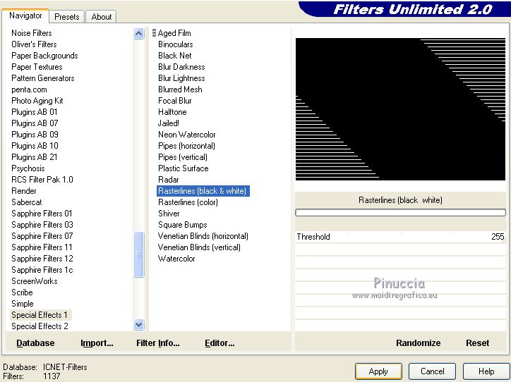 Effects>Plugins>Filters Unlimited 2.0 - Special Effects 1 - Rasterlines (Black & White)